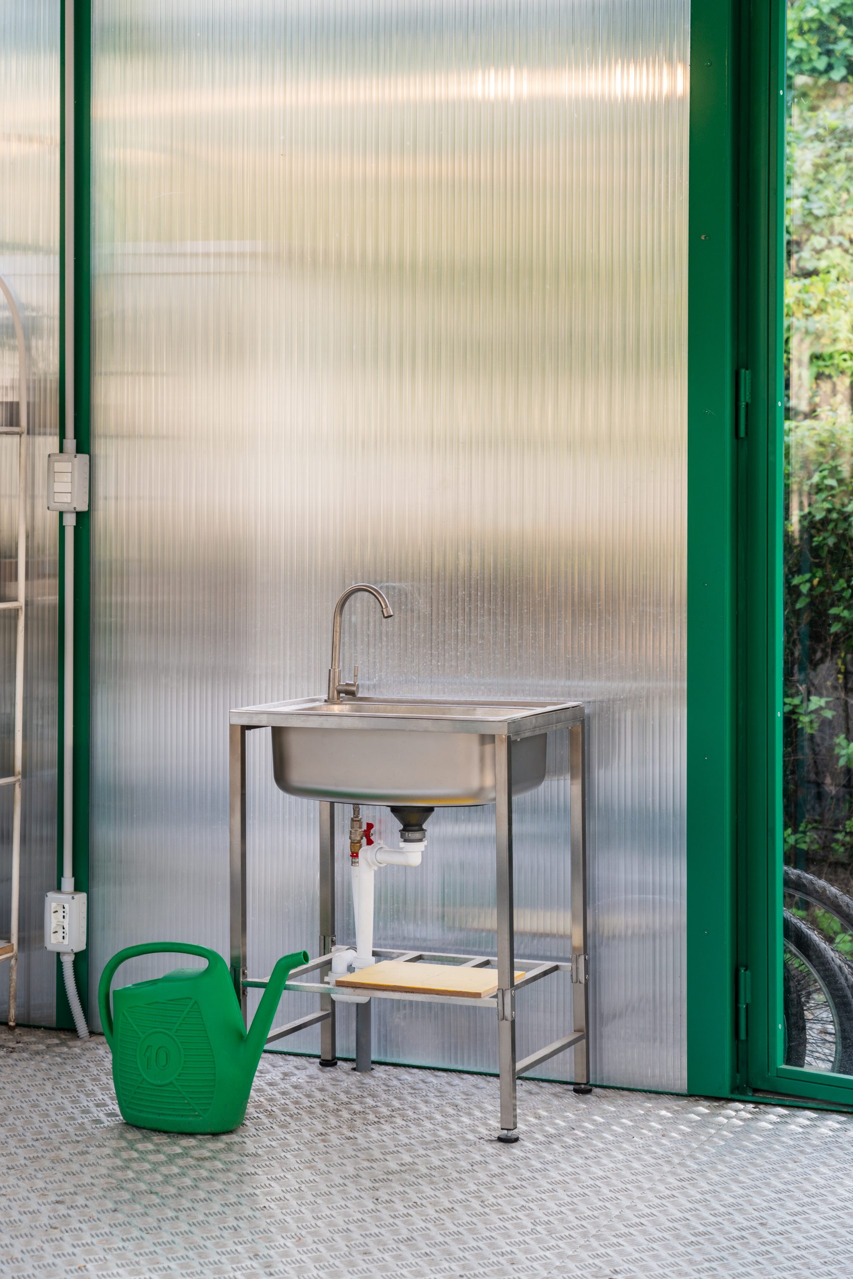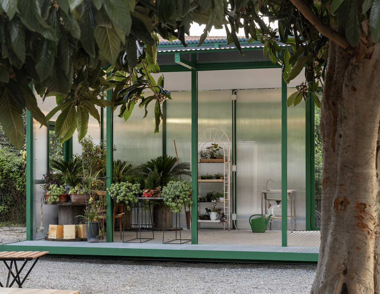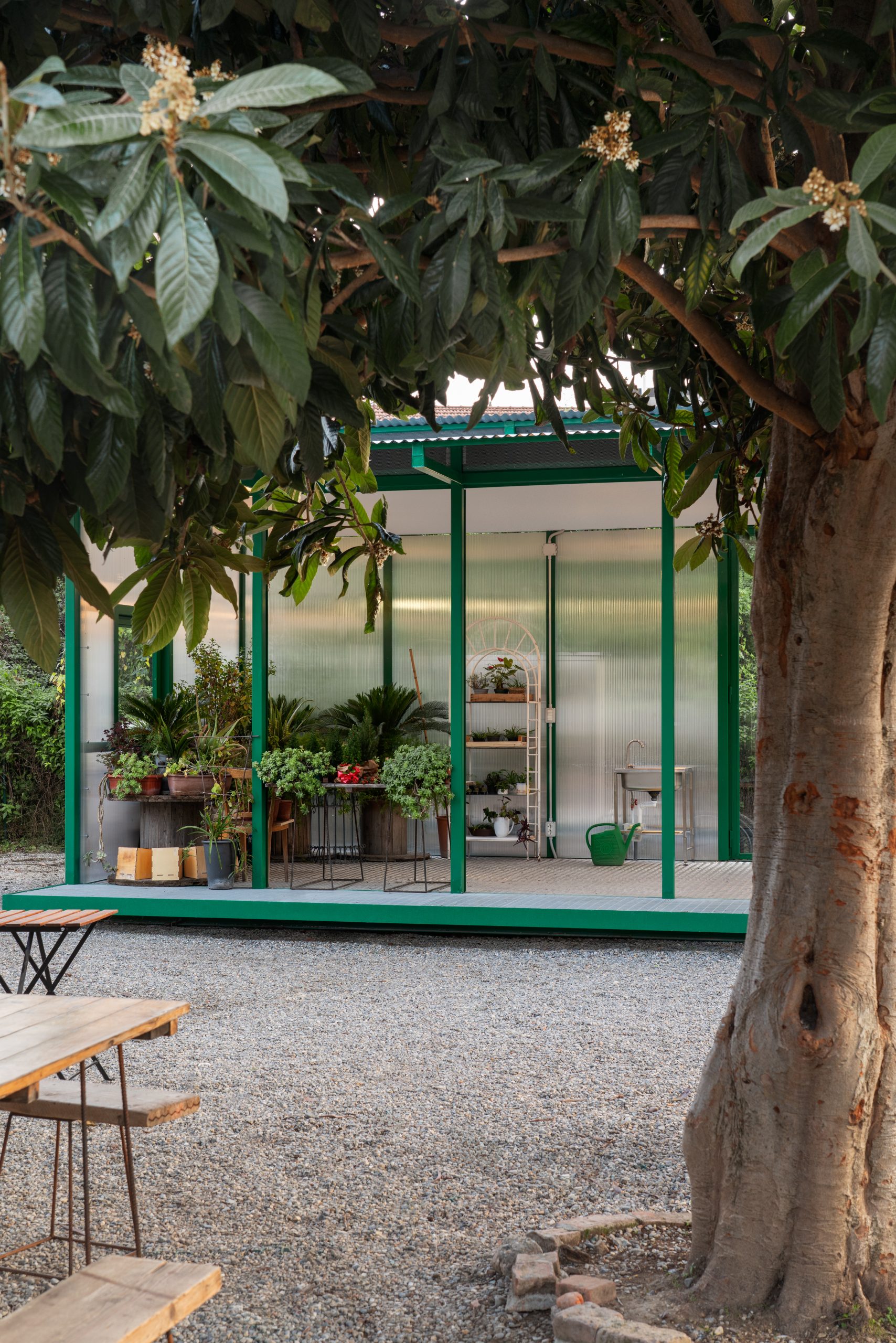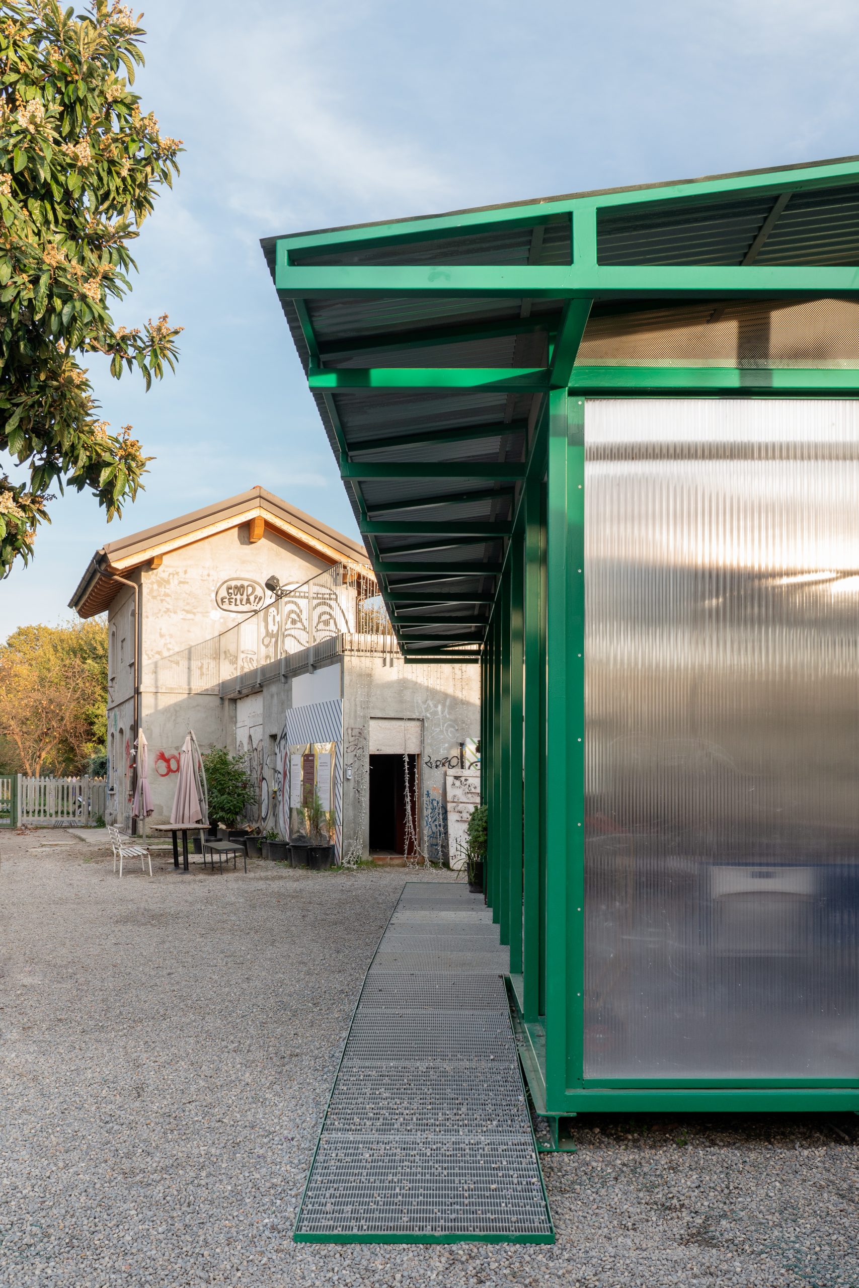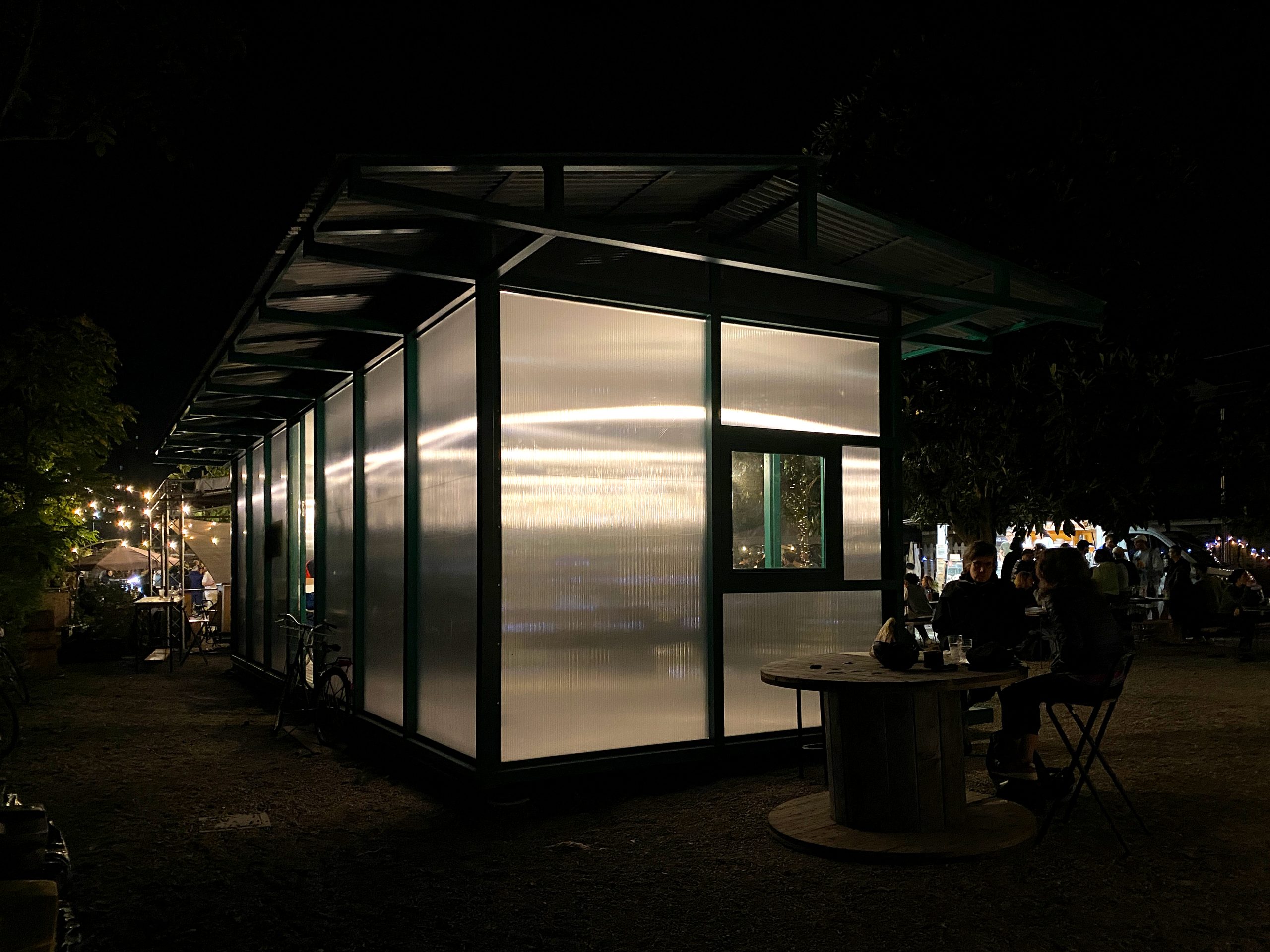 L’involucro è realizzato con pannelli in policarbonato cellulare, scelti per le loro prestazioni termiche e per la rapidità di montaggio e smontaggio. Durante il giorno, la pelle semitrasparente filtra la luce naturale; di notte, l’edificio si trasforma in una sorta di lanterna, restituendo visibilità e presenza al giardino del Casello. Lungo i fronti longitudinali, finestre fisse e porte-finestre in alluminio assicurano un’illuminazione diffusa e una ventilazione trasversale efficace, rafforzando il rapporto tra interno ed esterno.