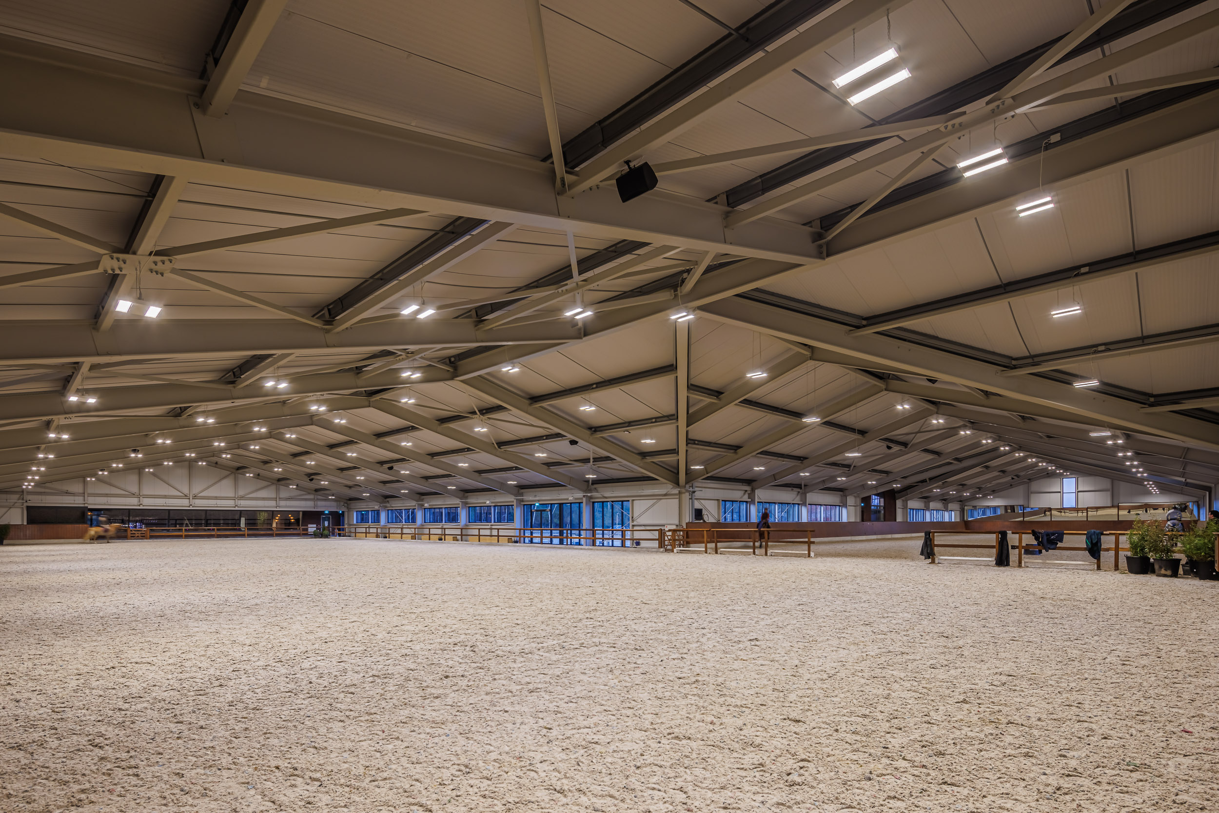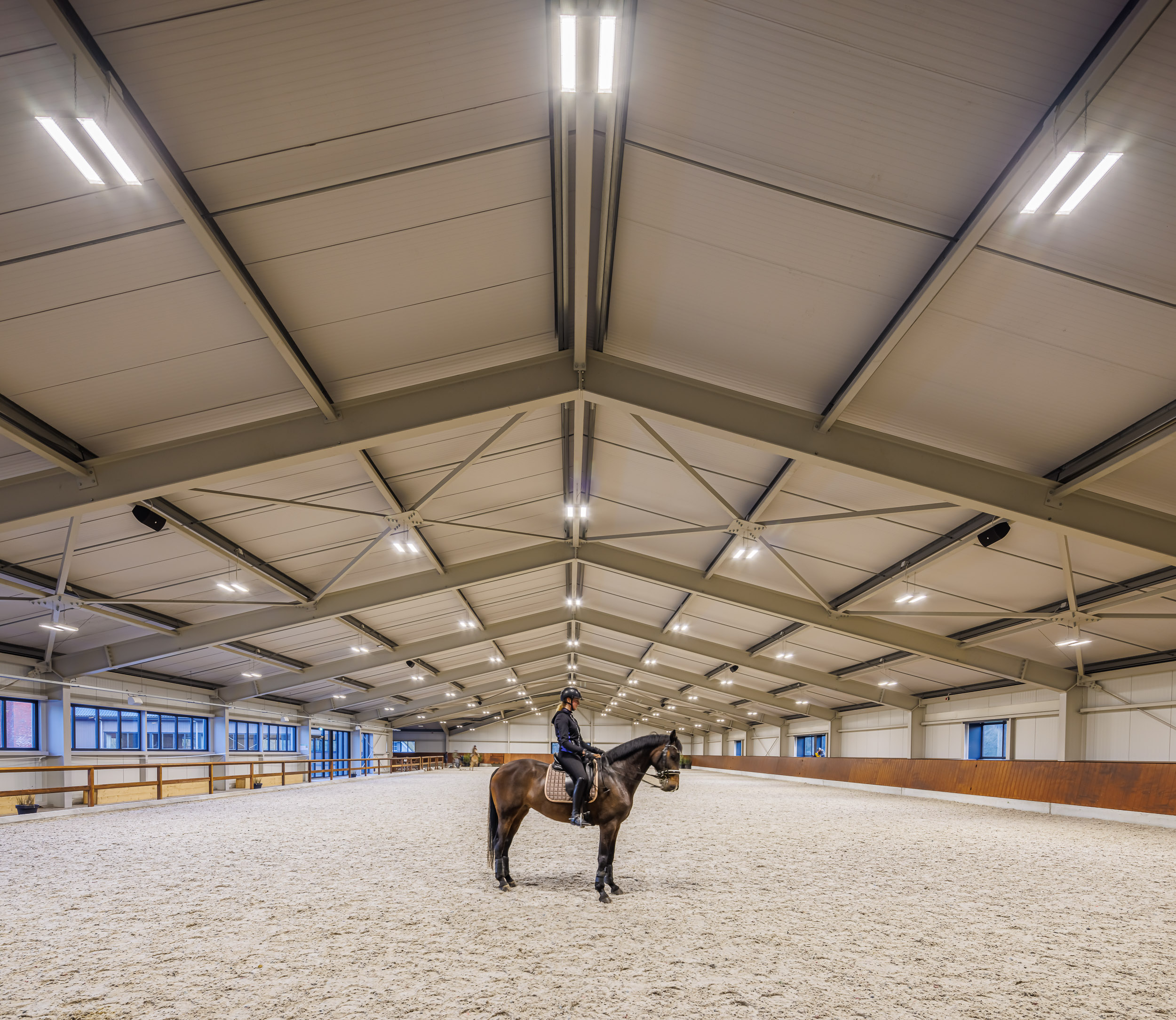 All’interno, la progettazione illuminotecnica è orientata al massimo equilibrio tra prestazione e benessere visivo. Nell’ampia arena equestre, destinata a gare e allenamenti, gli apparecchi LAMA+ offrono una luce diffusa e controllata, studiata per garantire visibilità ottimale evitando abbagliamenti, nel rispetto di cavalli e cavalieri.