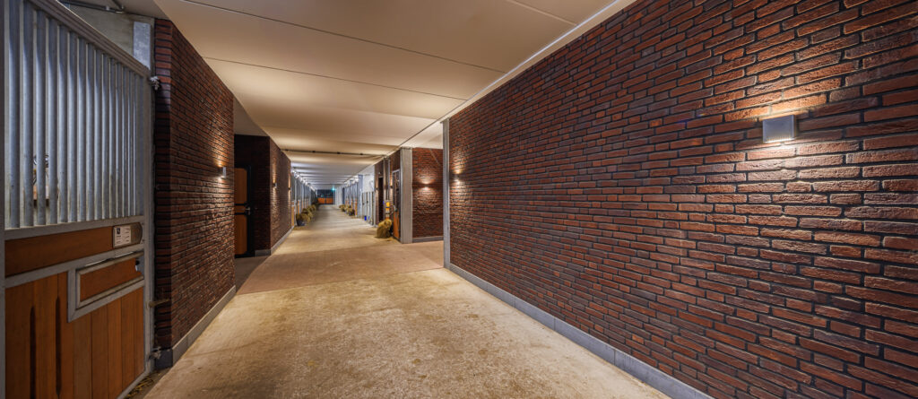 Nelle scuderie, progettate con particolare attenzione al benessere animale, così come nelle aree comuni, l’illuminazione è affidata a MIMIK 10 FLAT a parete e MIMIK 10 CEILING a soffitto, affiancati da diverse tipologie di downlight per assicurare uniformità luminosa e continuità percettiva negli spazi.