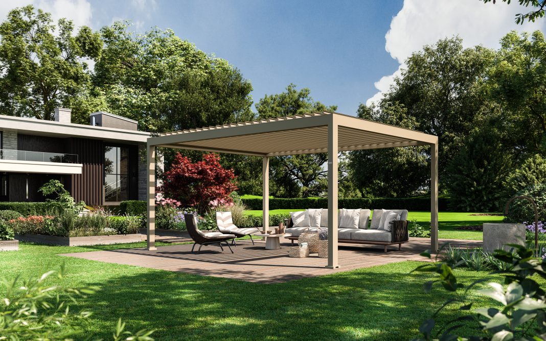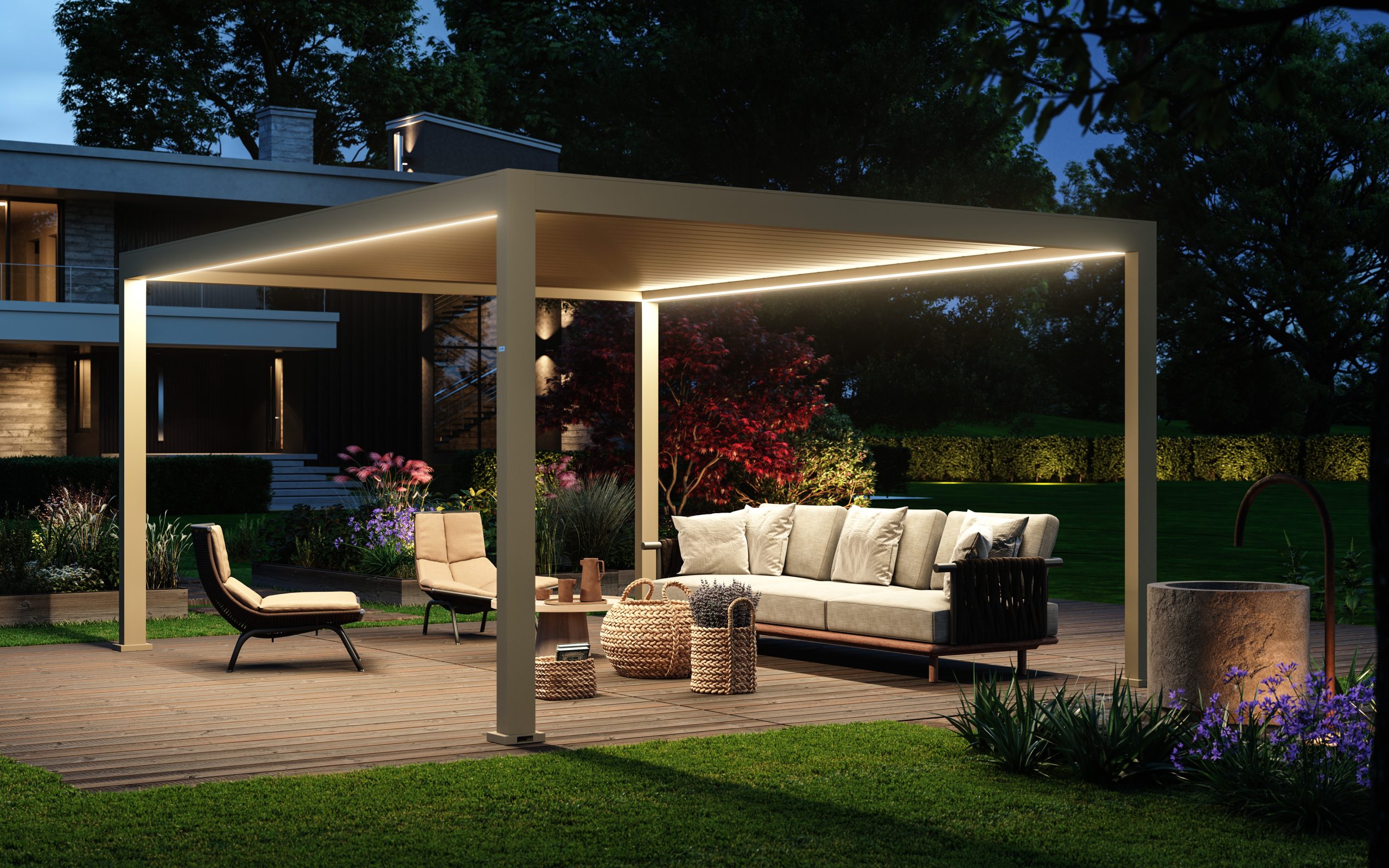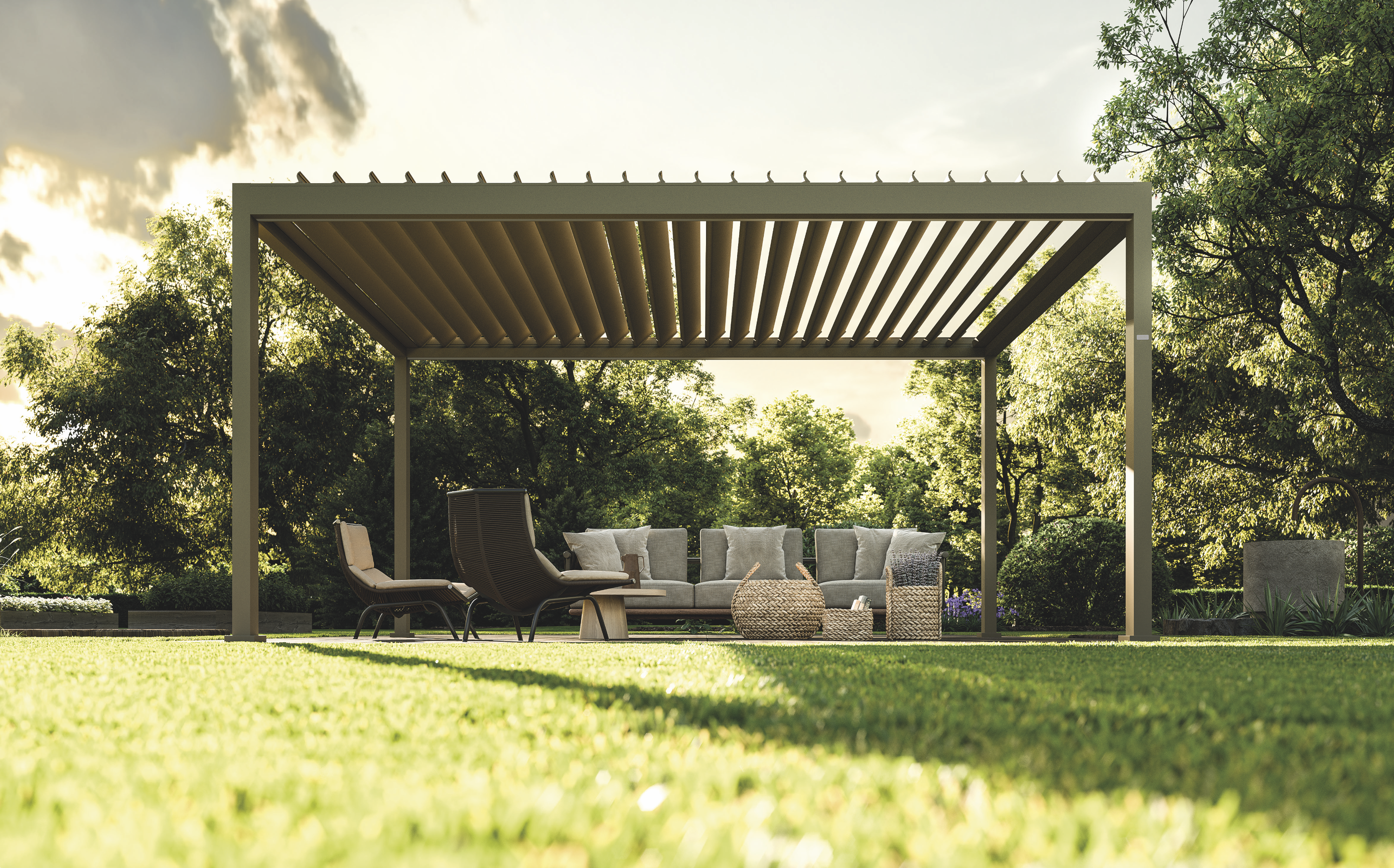 Il design essenziale e i volumi ridotti permettono a Sense di integrarsi in qualsiasi contesto, valorizzandolo con discrezione. I montanti, con uno spessore di soli 9,8x14 cm, sostengono una copertura composta da lame frangisole orientabili fino a 110 gradi. Questa tecnologia consente di regolare luce solare, ventilazione e temperatura in modo naturale. Il controllo avviene tramite telecomando, smartphone o comandi vocali, oltre che con sensori meteo in grado di reagire autonomamente a sole, pioggia e vento.