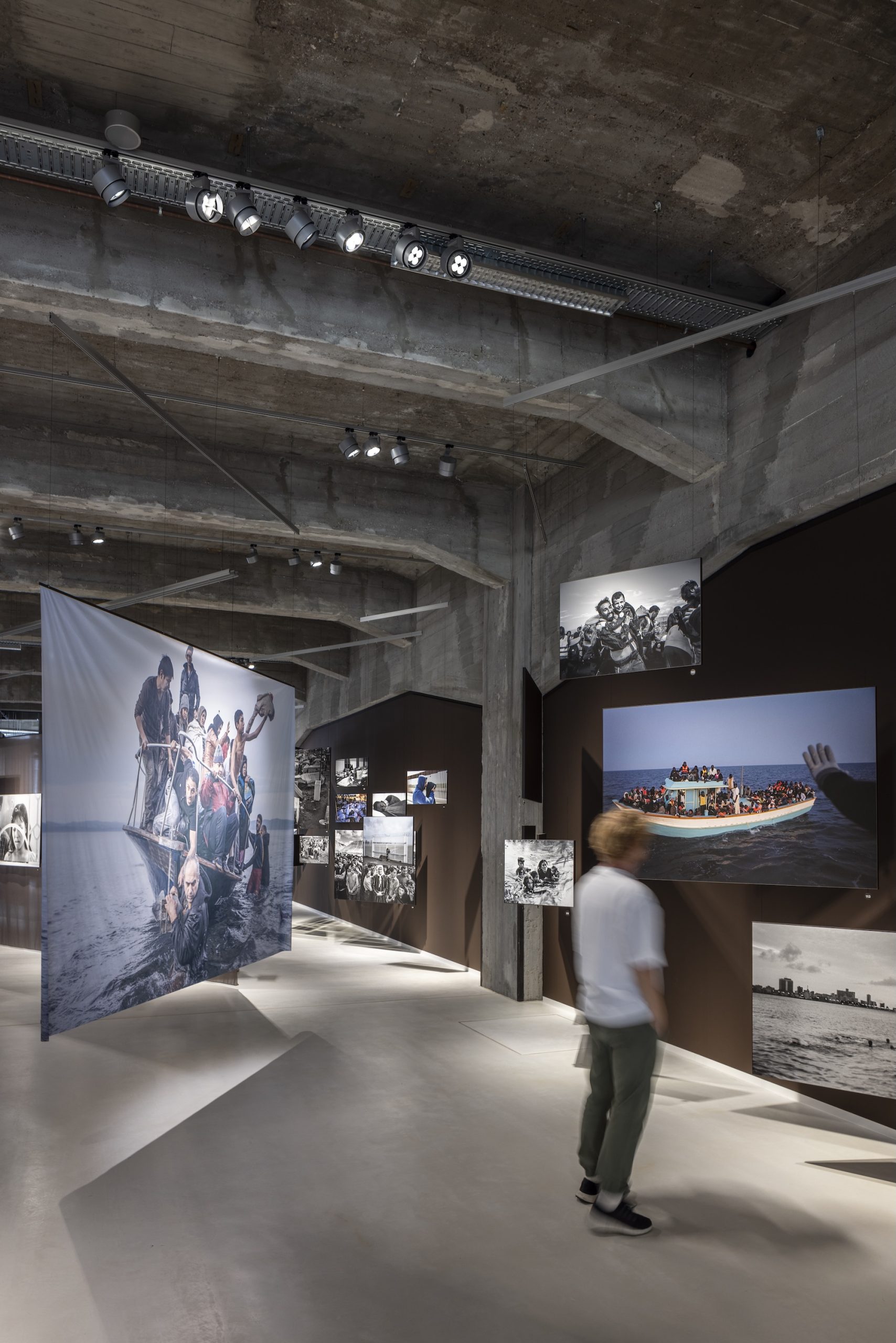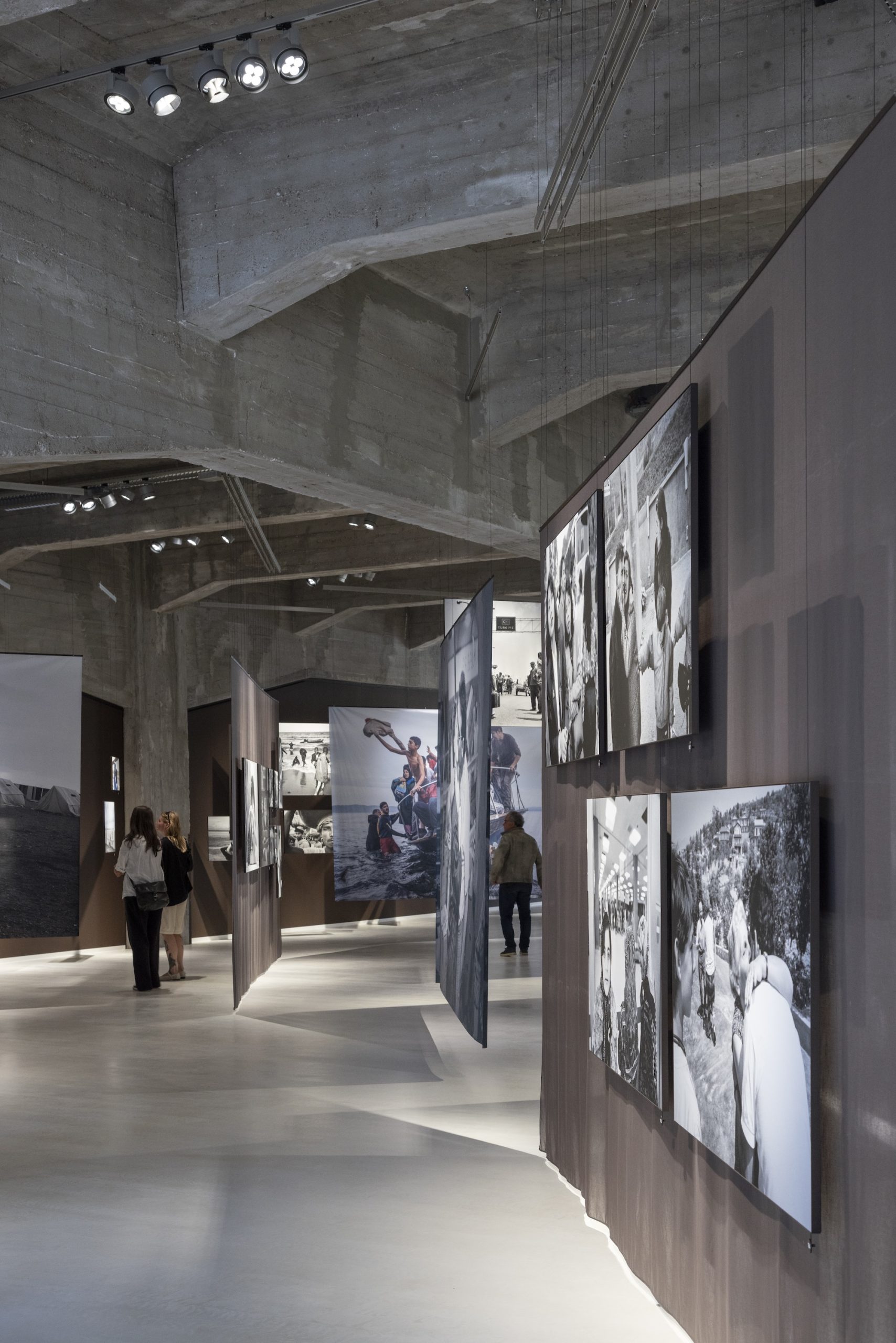 Nella sala adiacente è allestita la mostra The Family of Migrants, composta da quasi 200 fotografie in bianco e nero stampate su tessuto trasparente e visibili su entrambi i lati. In questo ambiente non è stata prevista un’illuminazione generale: ogni immagine è illuminata singolarmente da Parscan con fasci spot e narrow spot, orientati con cura per evitare ombre proiettate sulle foto retrostanti.
