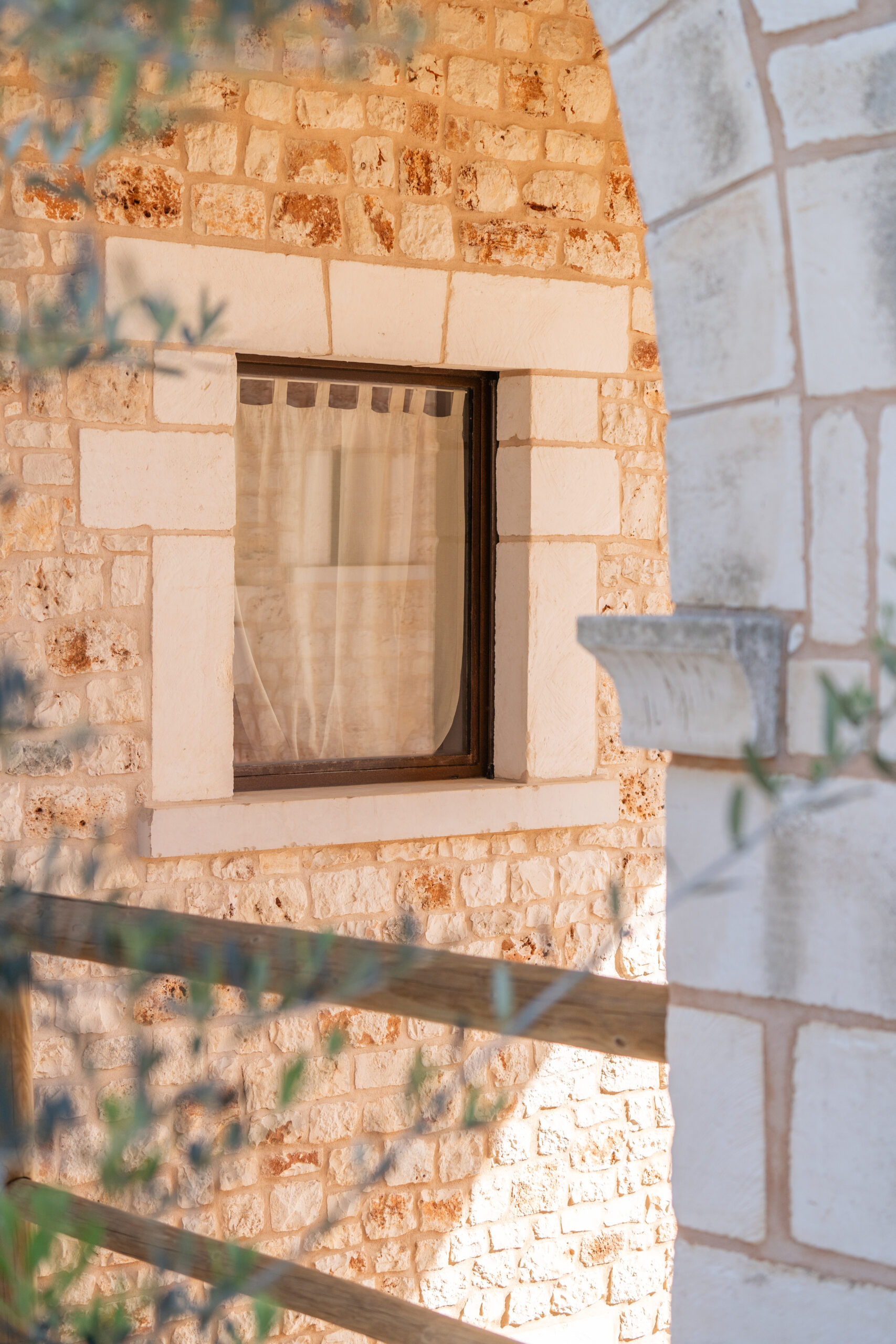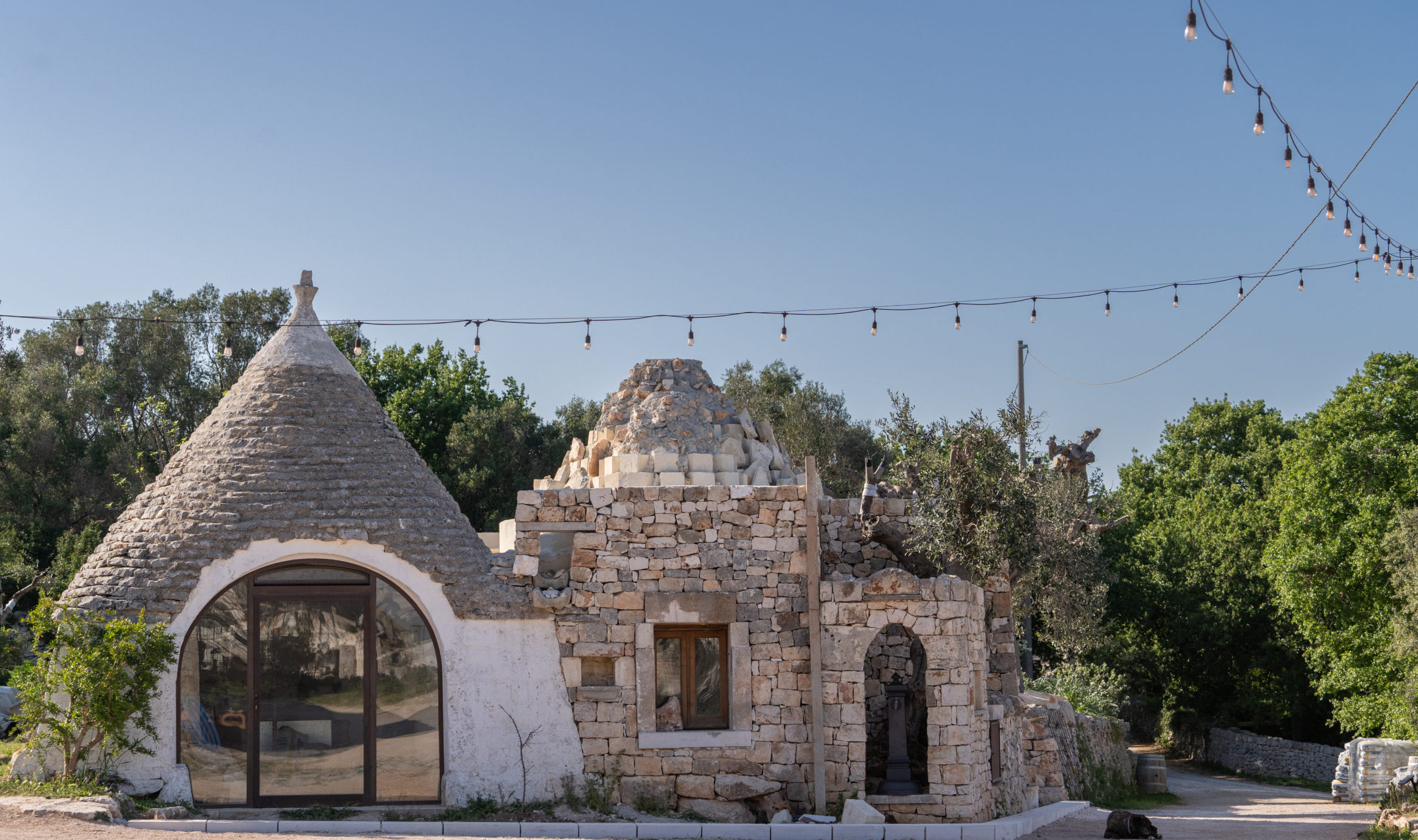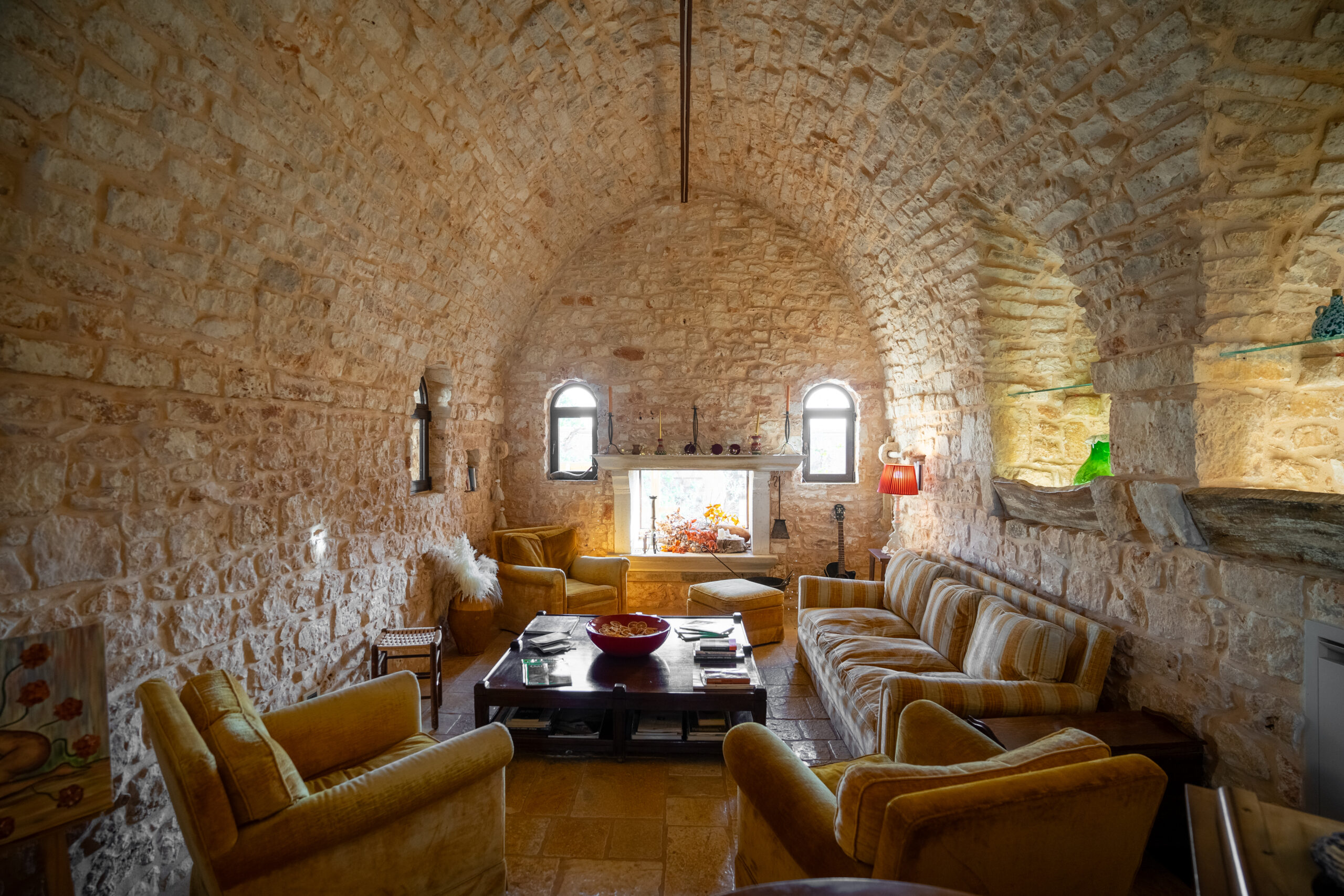 Dal portale d’ingresso, un percorso boschivo conduce al volume principale, compatto e rigoroso nella sua pietra color nocciola. Gli ambienti comuni e le camere - distribuite anche nei trulli che punteggiano la proprietà - restituiscono l’autenticità della tradizione costruttiva pugliese: archi irregolari, coperture coniche, superfici grezze che esaltano la tridimensionalità della materia.