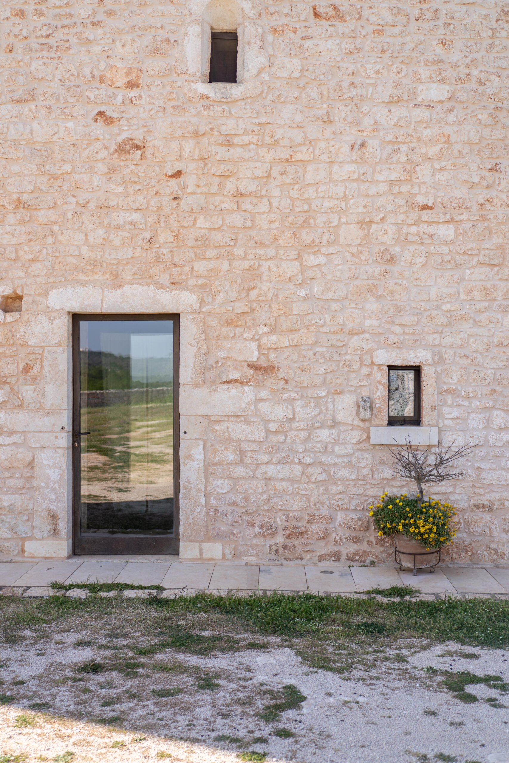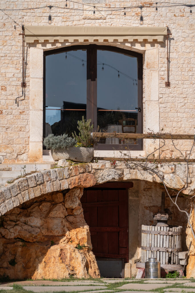 Il nucleo originario, collocato al centro di una proprietà di oltre ottanta ettari, dialoga con un paesaggio segnato da uliveti, campi seminativi e muretti a secco. Qui l’architettura non si impone, ma si radica: la pietra locale, con le sue variazioni cromatiche, costruisce superfici vibranti che mutano con la luce, definendo volte, murature e pavimentazioni in una continuità materica che rafforza l’identità del luogo.
