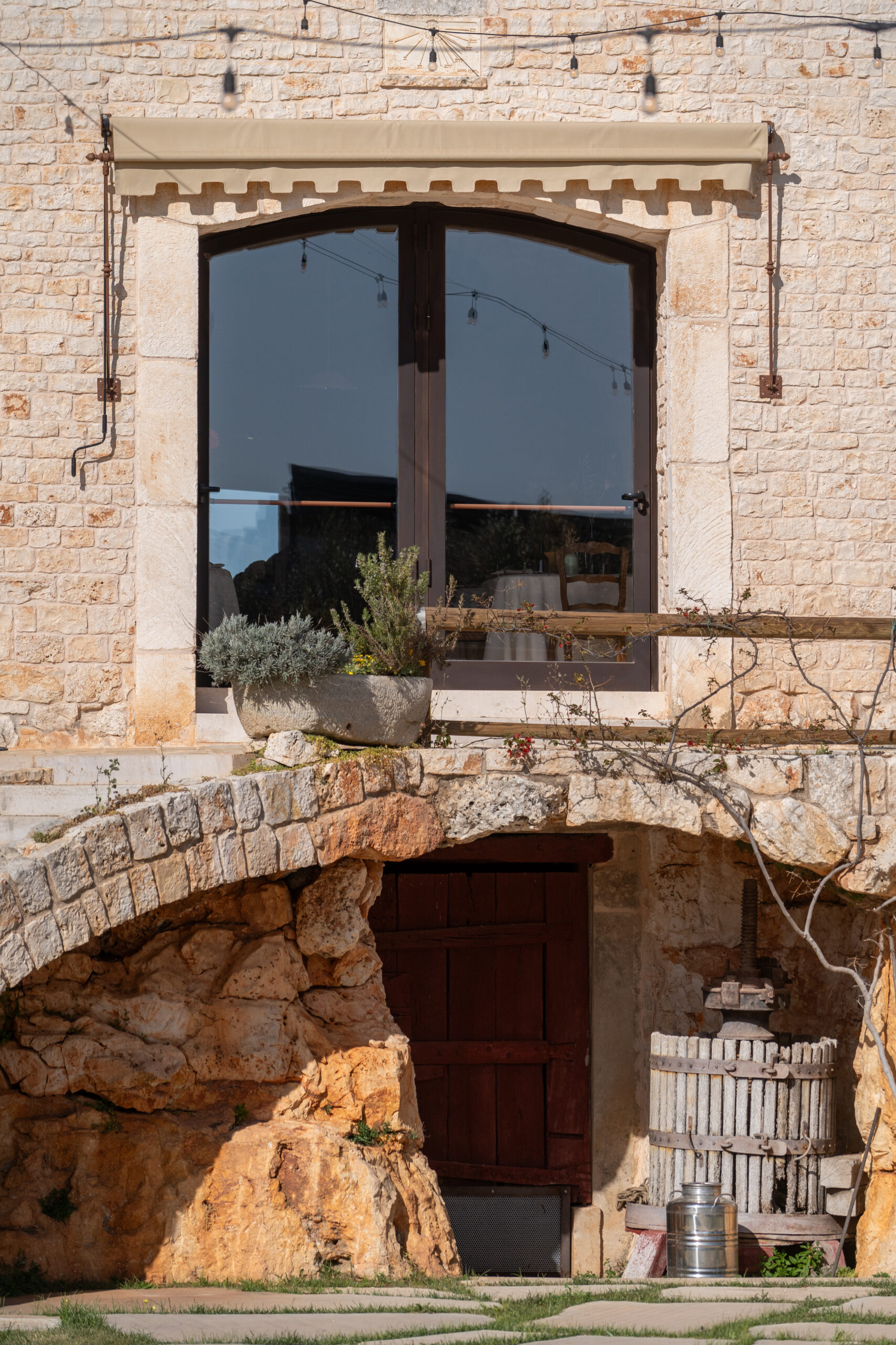 La trasformazione in struttura ricettiva di alto profilo non ha alterato questo equilibrio. Il progetto di recupero della Masseria firmato dall’architetto Rocco Conserva si concentra sulla conservazione dei caratteri tipologici e sulla valorizzazione delle geometrie originarie, attraverso un attento lavoro su dettagli, sistemi tecnologici e lighting design. La luce naturale modella gli spazi interni, mentre l’illuminazione artificiale ne sottolinea proporzioni e tessiture.