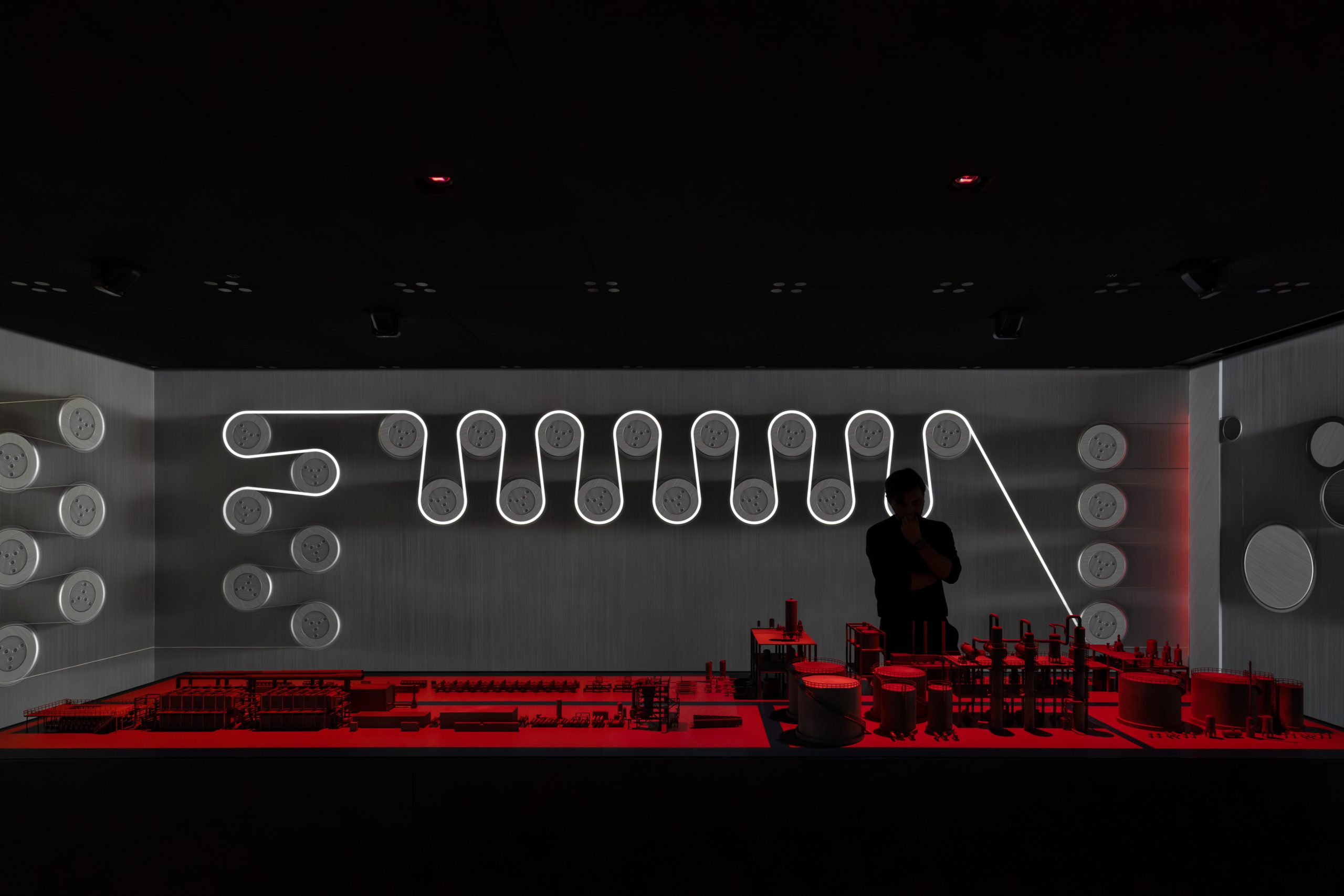 Il percorso prosegue nel Carbonization Tunnel, uno spazio immersivo in cui luce e calore rievocano la trasformazione della fibra acrilica in fibra di carbonio. Qui l’architettura diventa strumento narrativo, traducendo forze invisibili come pressione, compressione e rilascio in un’esperienza fisica e sensoriale. Grazie ai dati in tempo reale provenienti dai laboratori MAE, il museo si connette direttamente alla ricerca in corso, configurandosi come un laboratorio vivente. Un ulteriore ambiente immersivo presenta le applicazioni più avanzate della fibra di carbonio, attraverso un mock-up di un impianto produttivo animato da realtà aumentate.