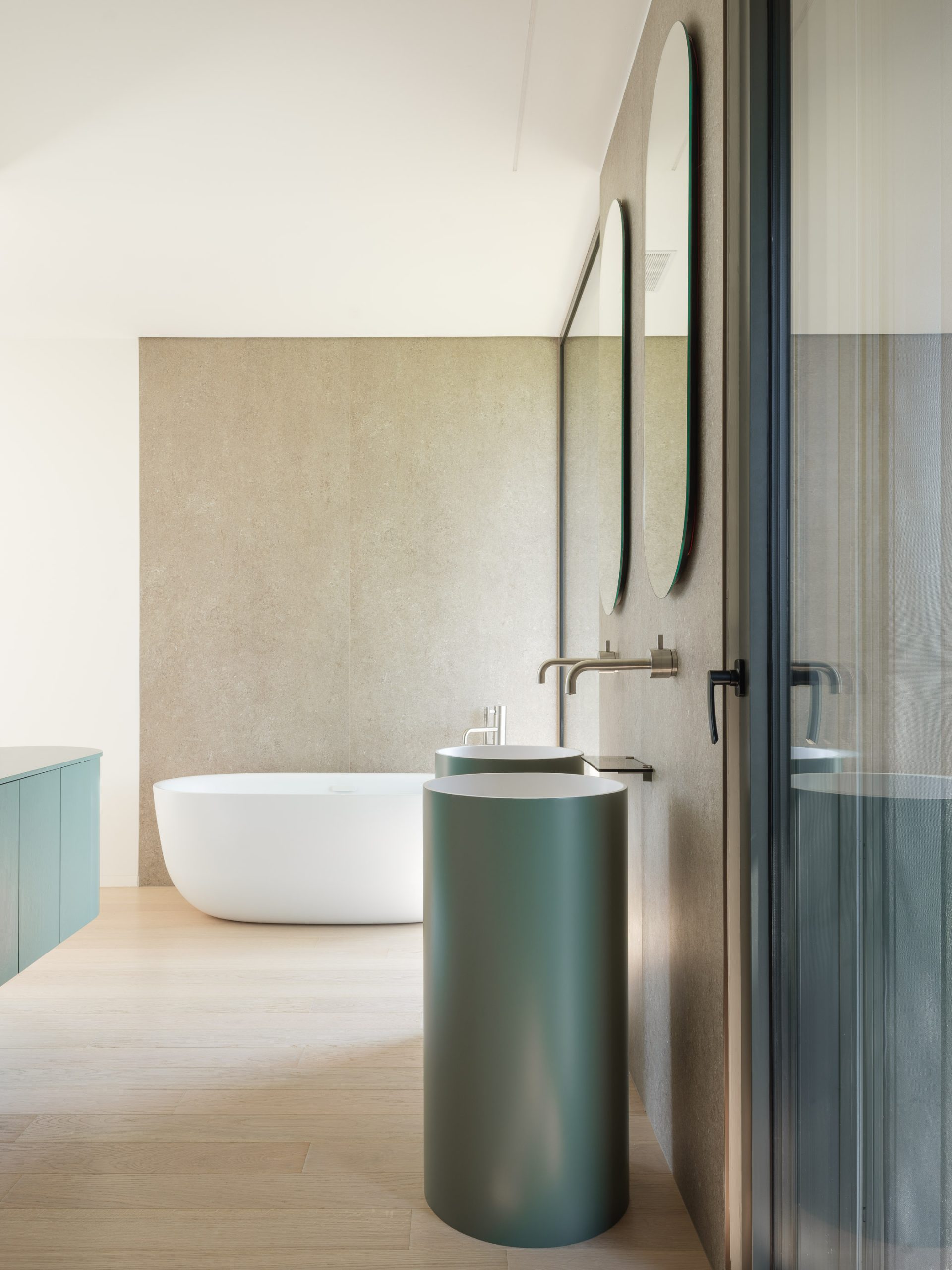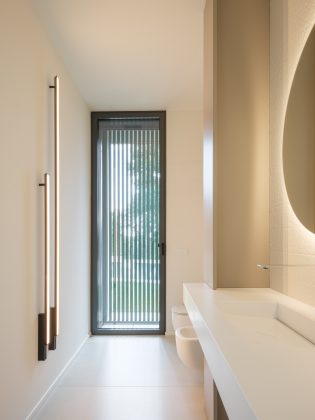 La pavimentazione alterna lastre in gres di grande formato a listoni di rovere posati in continuità. Anche nei servizi, i rivestimenti più ricercati mantengono una presenza discreta, così come gli intonaci graffiati esterni e la pietra di Credaro nelle parti seminterrate, che dialogano con la topografia del luogo.