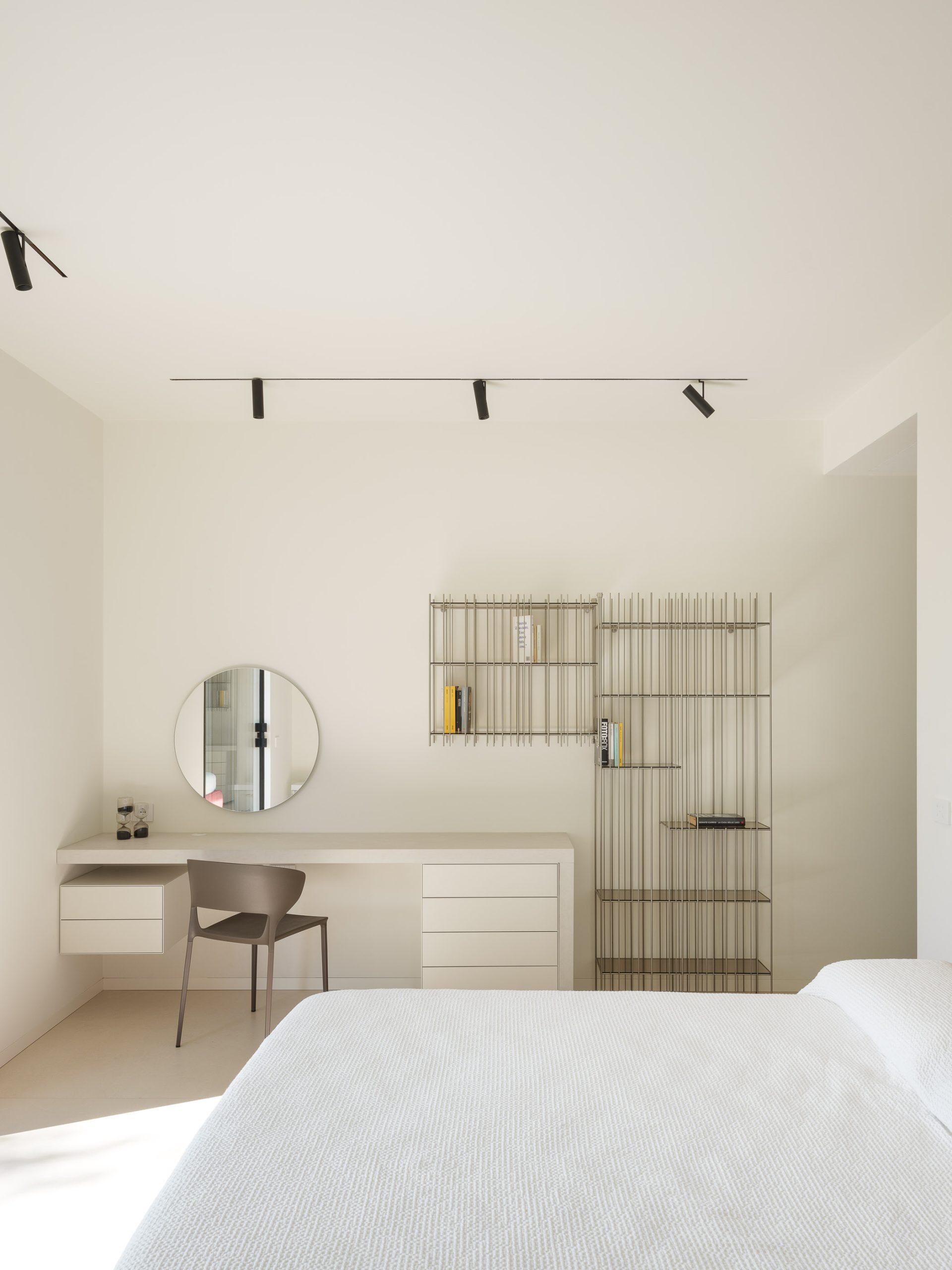 Gli arredi seguono lo stesso approccio ridotto all’essenziale: elementi funzionali, calibrati per lasciare spazio allo sguardo verso l’esterno.