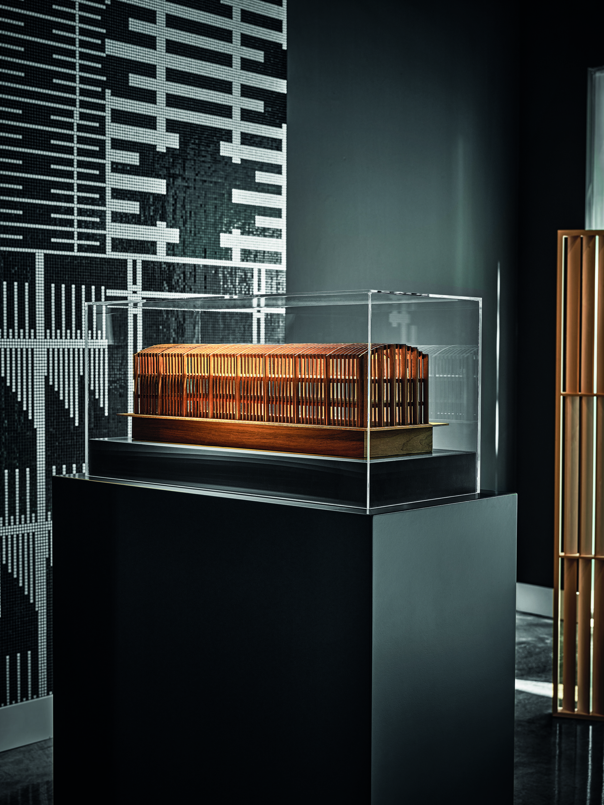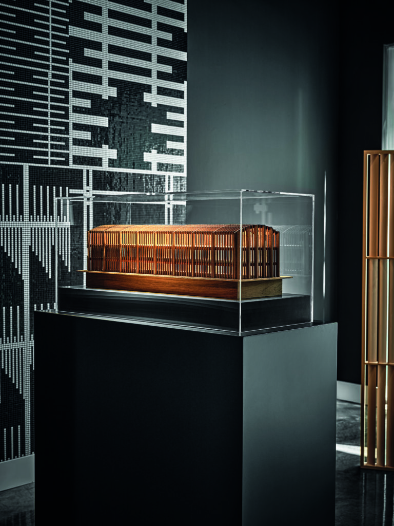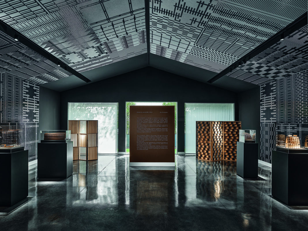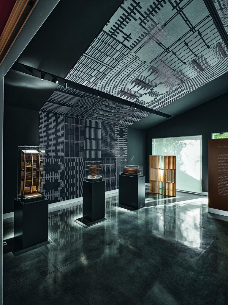 Al centro della sala, sei modelli lignei, realizzati con essenze diverse, traducono in forma tridimensionale altrettanti progetti dello studio, tra cui l’UniCredit Pavilion (oggi IBM Studios) in piazza Gae Aulenti a Milano e The Waterstone, padiglione di Intesa Sanpaolo per Expo Milano 2015.