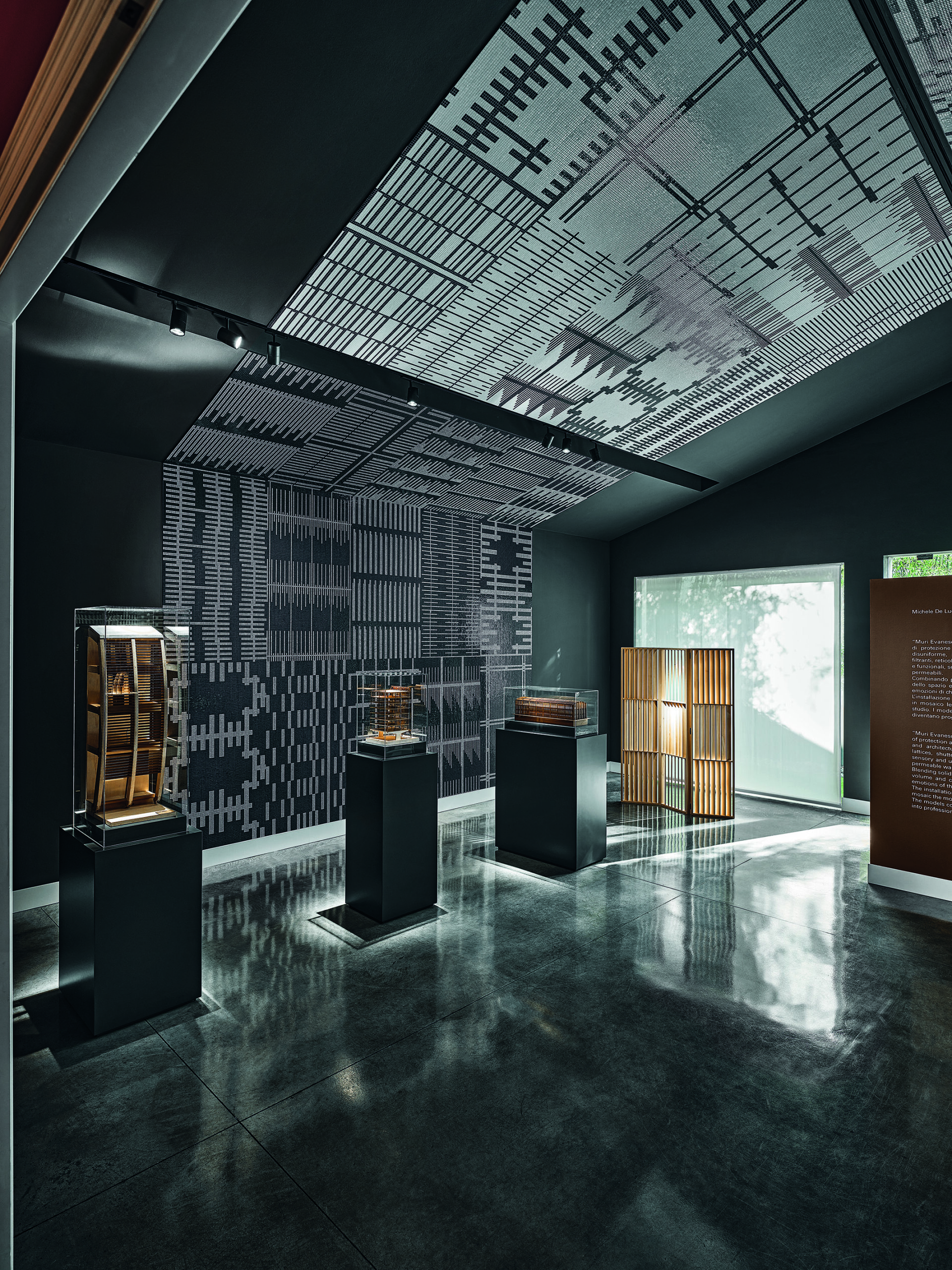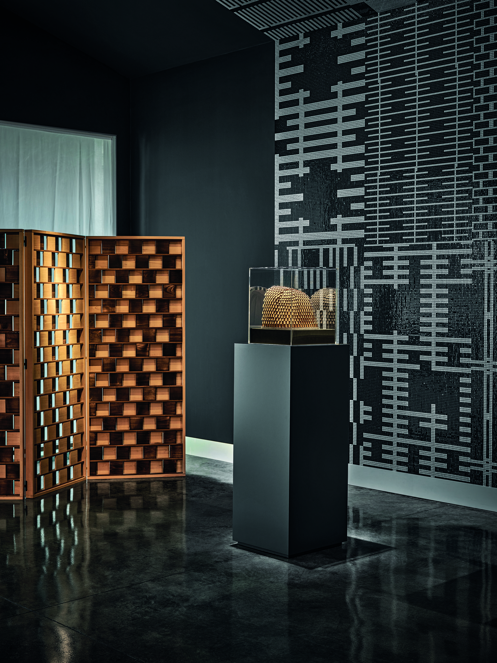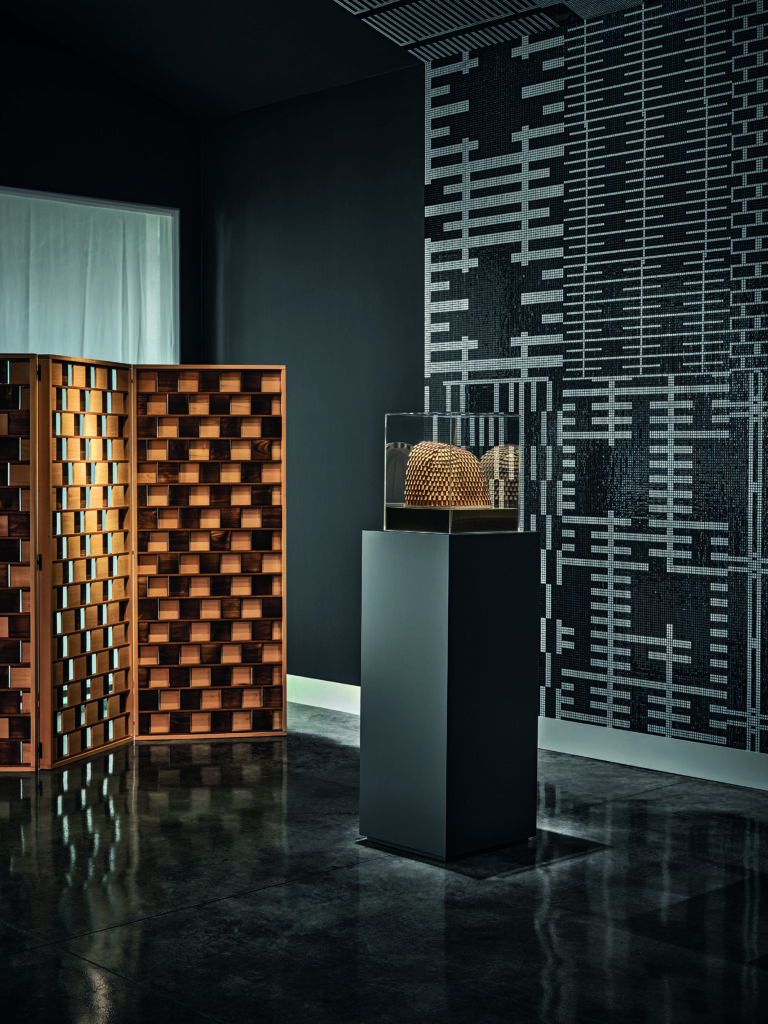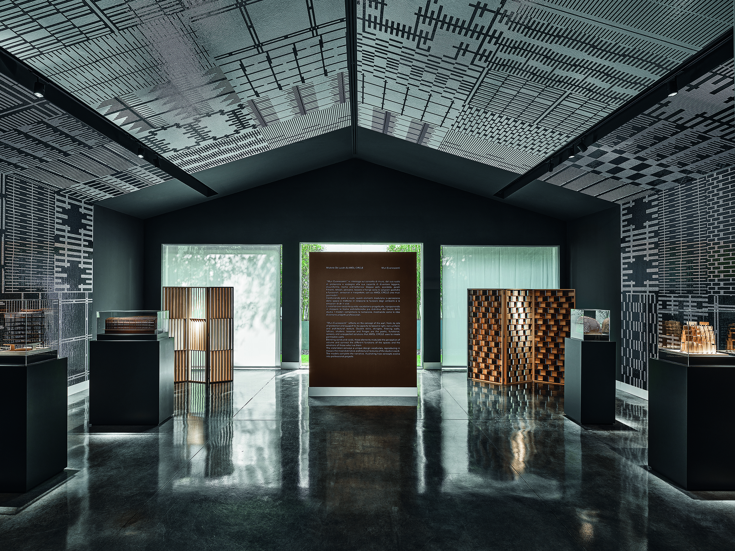 L’installazione restituisce il lessico progettuale di De Lucchi e di AMDL CIRCLE attraverso una reinterpretazione in mosaico bianco e nero dei loro elementi ricorrenti: doppie pelli, scandole, sistemi filtranti, reticoli, persiane e frange. Venticinque motivi decorativi, ciascuno declinato in positivo e negativo, compongono un sistema continuo che riveste pareti e soffitto mediante minute tessere musive da 10x10 mm.