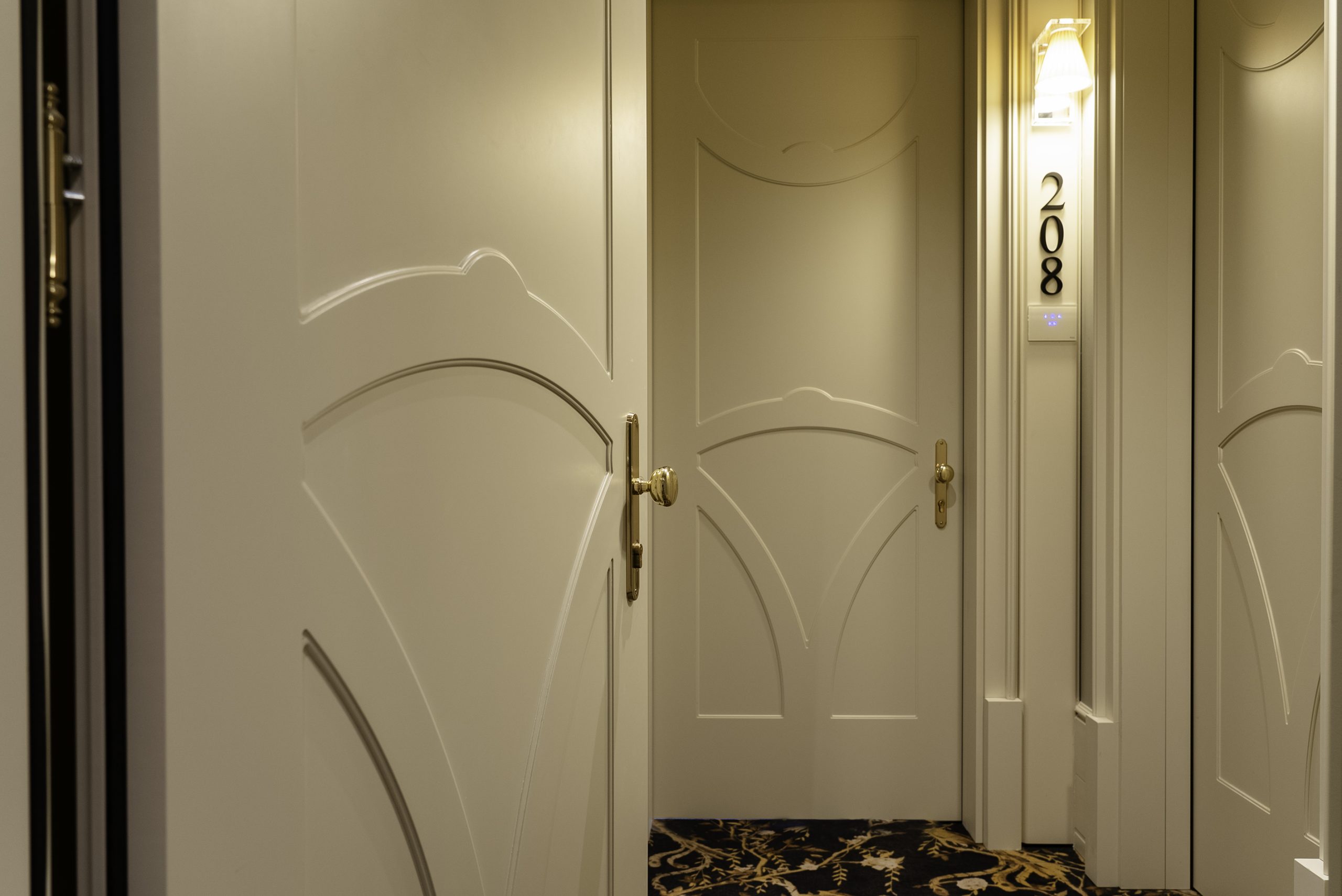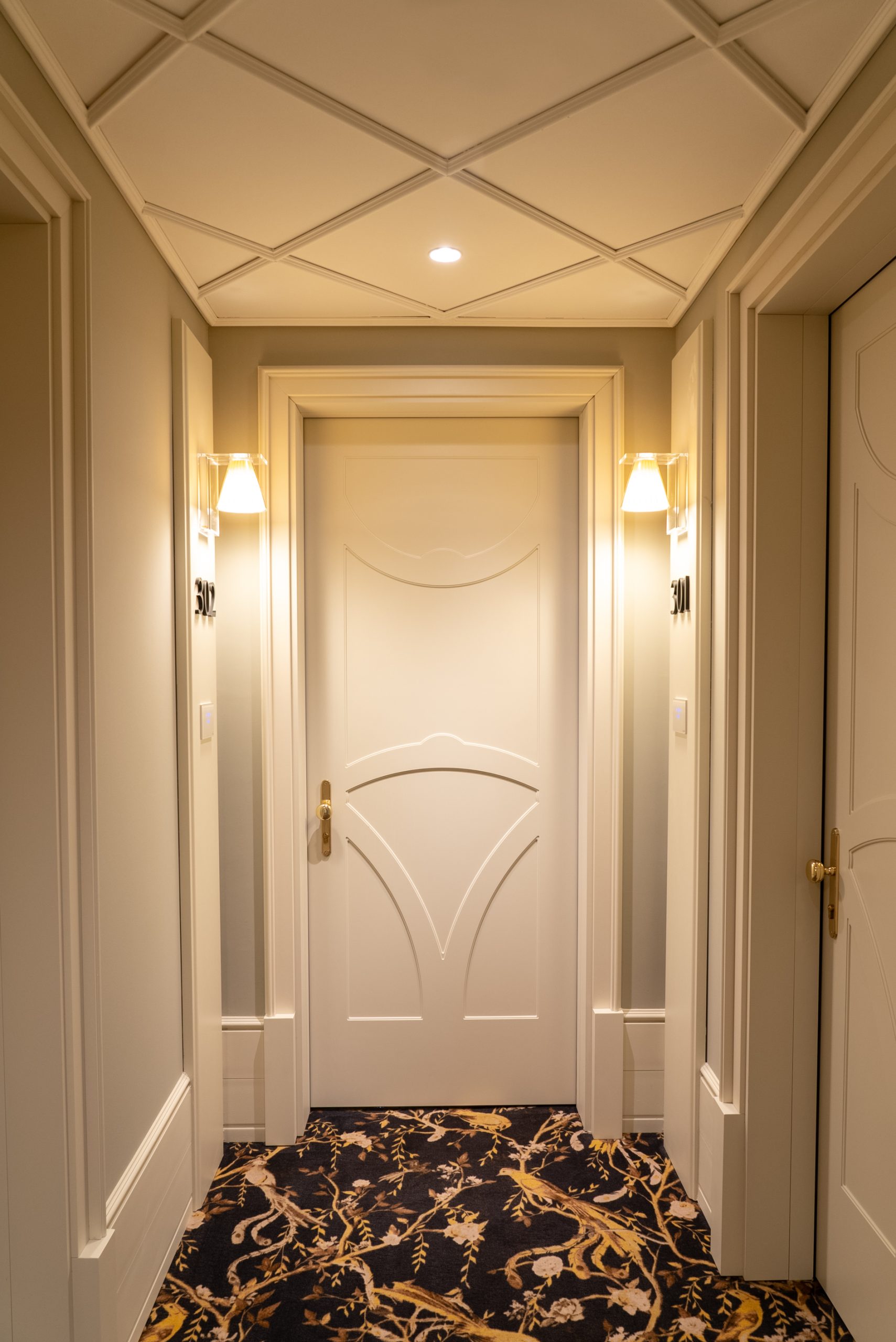 Oltre alla durabilità, le porte garantiscono elevata insonorizzazione (40 dB), assicurando privacy e tranquillità agli ospiti. La pantografatura e le bugne applicate su entrambi i lati impreziosiscono il pannello, mentre coprifili sagomati con zoccolo su due lati, cappucci copricerniere barocco in ottone lucido e chiudiporta esterno color oro creano un linguaggio architettonico elegante e coerente con lo stile dell’interior design.