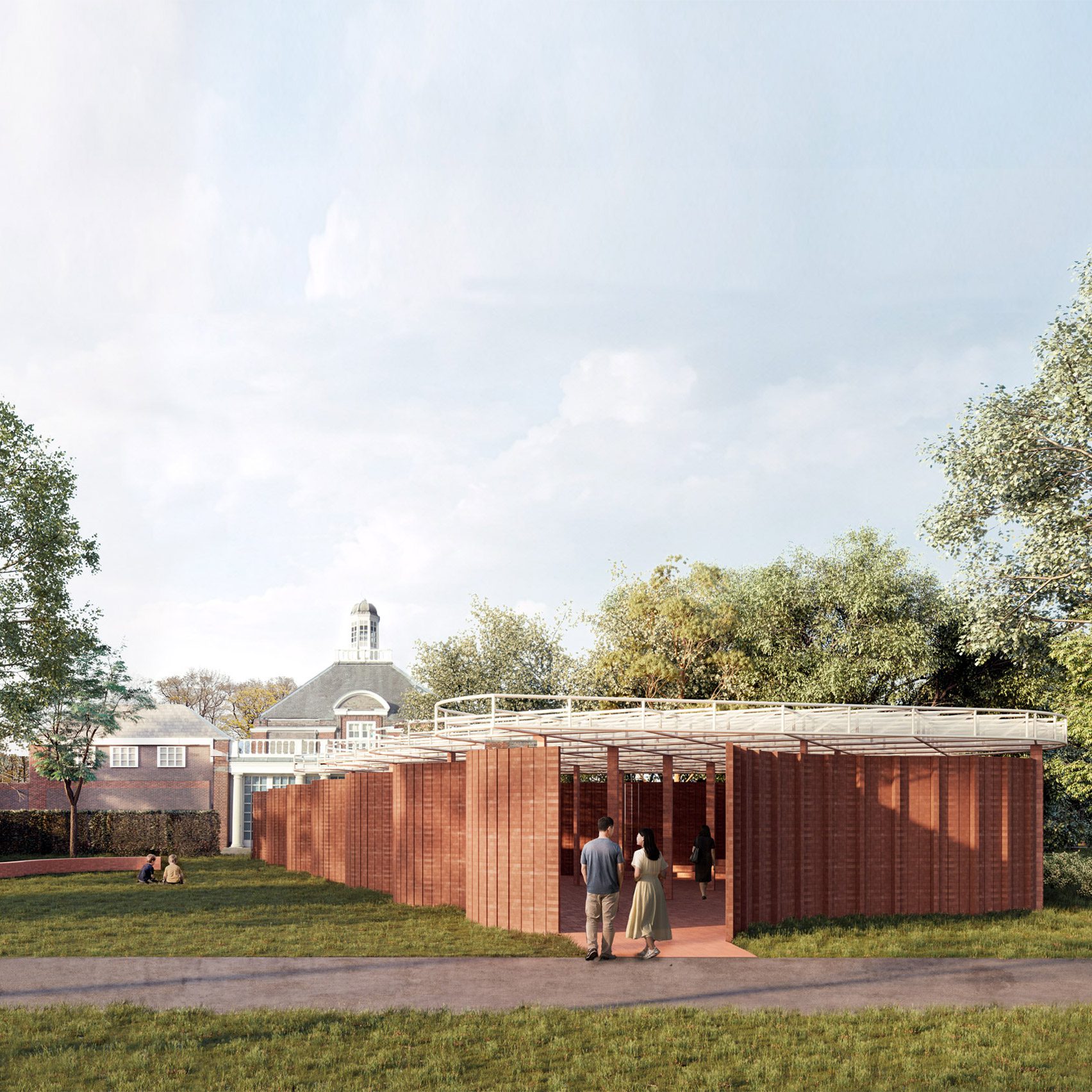 LANZA atelier ha scelto il mattone come materiale principale per celebrare la tradizione distintamente inglese del giardino e instaurare un dialogo con la facciata in mattoni esistente della Serpentine South Gallery, originariamente costruita come padiglione per il tè. Il Padiglione è costruito a partire da una ripetizione ritmica di colonne di mattoni che trasformano il muro da opaco a permeabile.