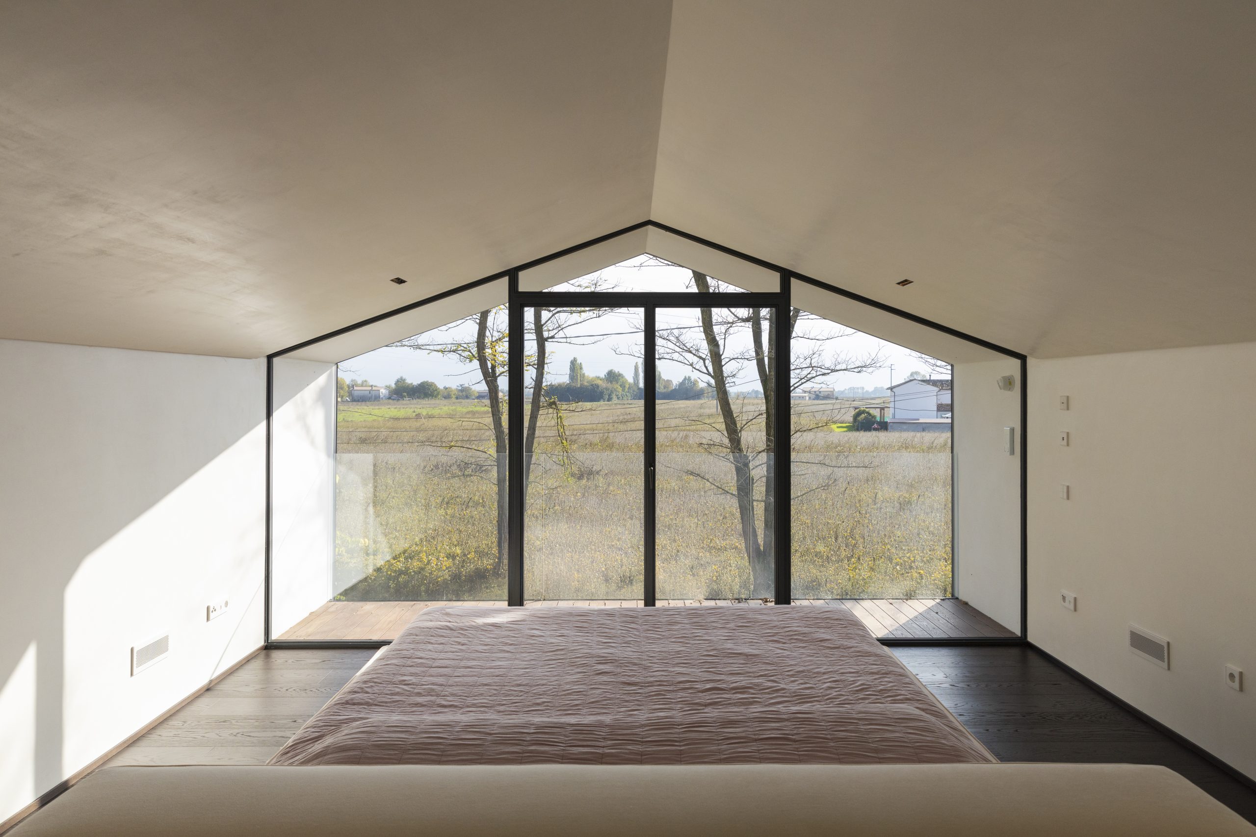 Gli scorrevoli Vitrocsa con sistema Invisible Frame estendono la pavimentazione verso il giardino, creando un passaggio senza soglie. La tenuta impermeabile è assicurata da una struttura in lamiera inox sotto pavimento che convoglia l’acqua nei sistemi di scarico predisposti. I profili in alluminio sono stati personalizzati per integrarsi in modo perfetto con i materiali circostanti. Le finestre Microframe in rovere con cover esterna in alluminio custom, con profili ridotti a pochi millimetri (nodo centrale di soli 59 mm), e il modello Extrema — con telaio e anta invisibili dall’esterno — restituiscono un’estetica quasi immateriale.