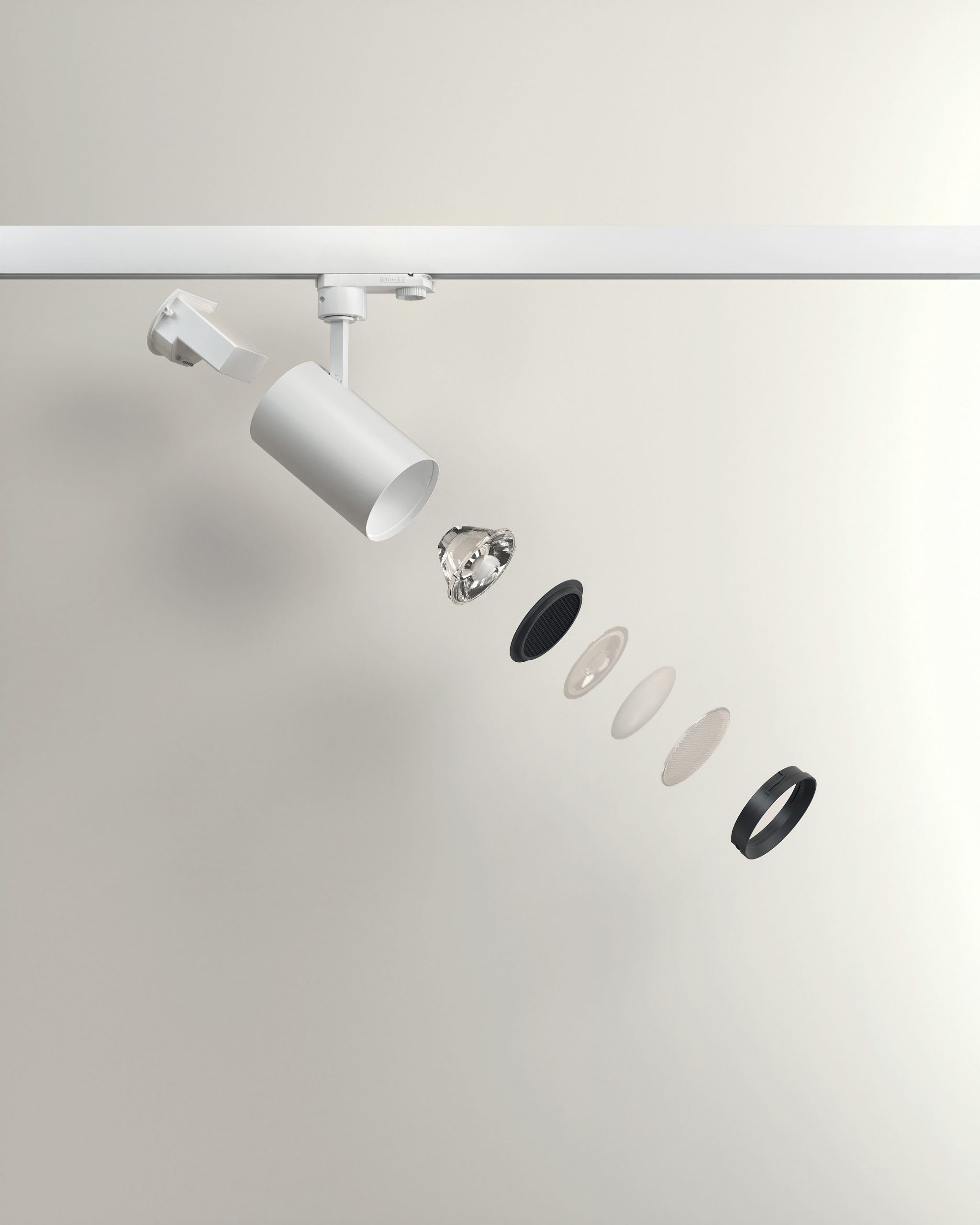 La scala graduata integrata assicura un puntamento preciso e stabile nel tempo. Compatibile con due accessori simultaneamente, il proiettore Tack può essere installato su binario elettrificato – anche in verticale – oppure su basi da superficie o da incasso. La manutenzione risulta semplice e veloce grazie alla possibilità di sostituire driver e gruppo LED sia dal retro sia dal fronte, garantendo così affidabilità e lunga durata nel tempo.