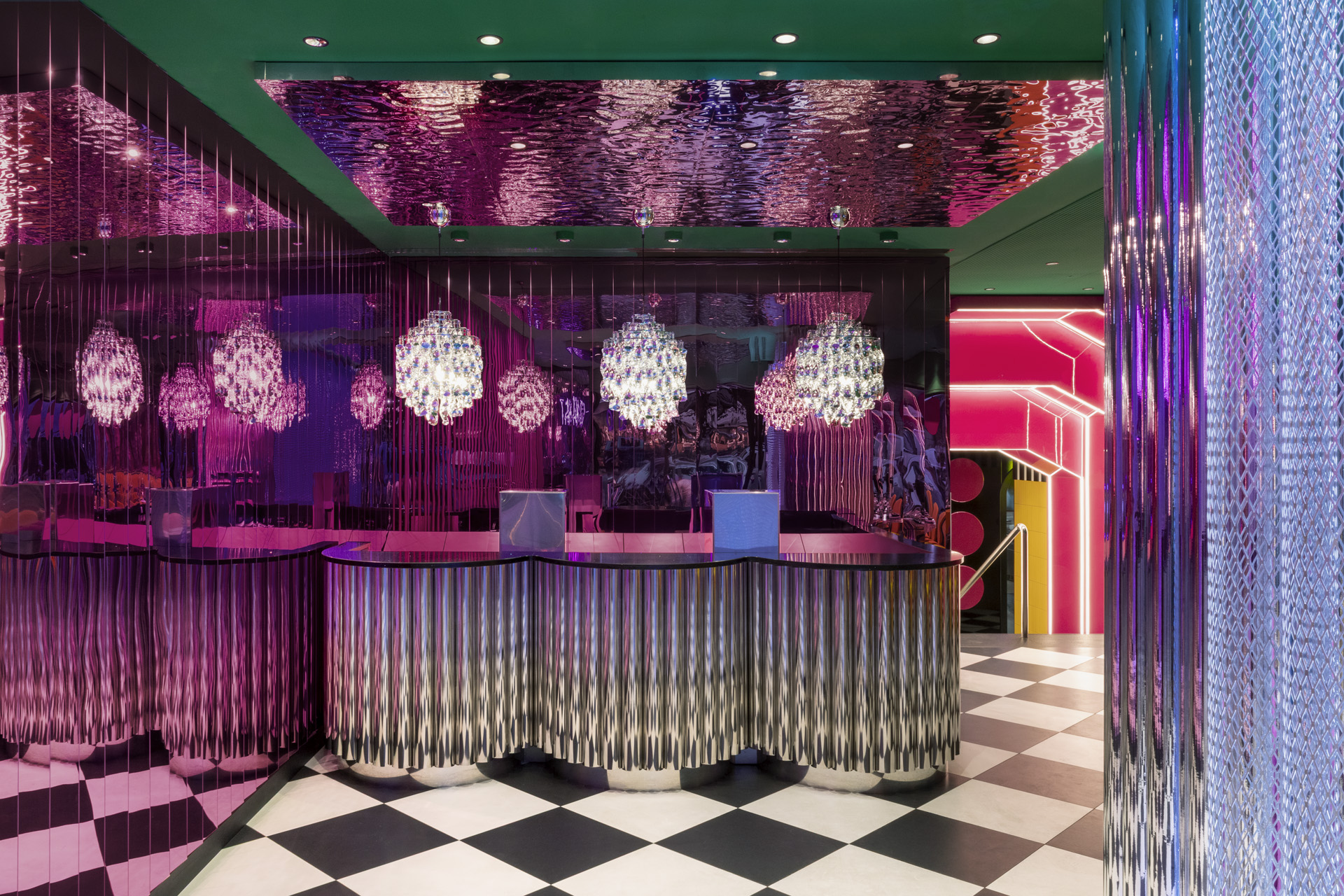 Le dieci grandi vetrate su strada instaurano un dialogo diretto con il contesto urbano, amplificando la permeabilità visiva e trasformando il locale in una scenografia aperta sulla città. L’ingresso è concepito come una soglia immersiva: il soffitto cromato evoca il movimento dell’acqua, mentre pannelli in metacrilato specchiante color magenta avvolgono desk scultorei in tubolari d’acciaio lucido, illuminati dalle lampade Spiral di Verpan.