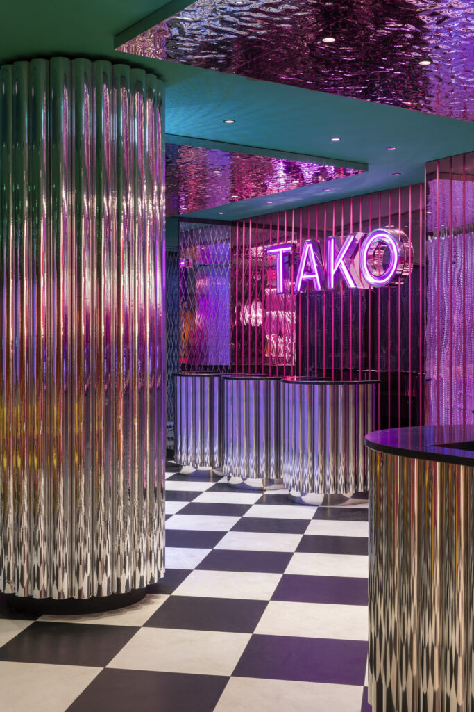 Distribuito su tre livelli, TAKO accoglie 240 coperti tra i primi due piani, insieme a cucina, sushi bar e cocktail bar. Un portale laccato magenta lucido, sottolineato da linee di luce, introduce a una scala in granito nero che conduce alla sala inferiore. Qui archi dalle proporzioni quasi metafisiche segnano i percorsi verso i servizi, mentre una parete punteggiata da grandi dots magenta retroilluminati diventa fulcro scenografico dello spazio.