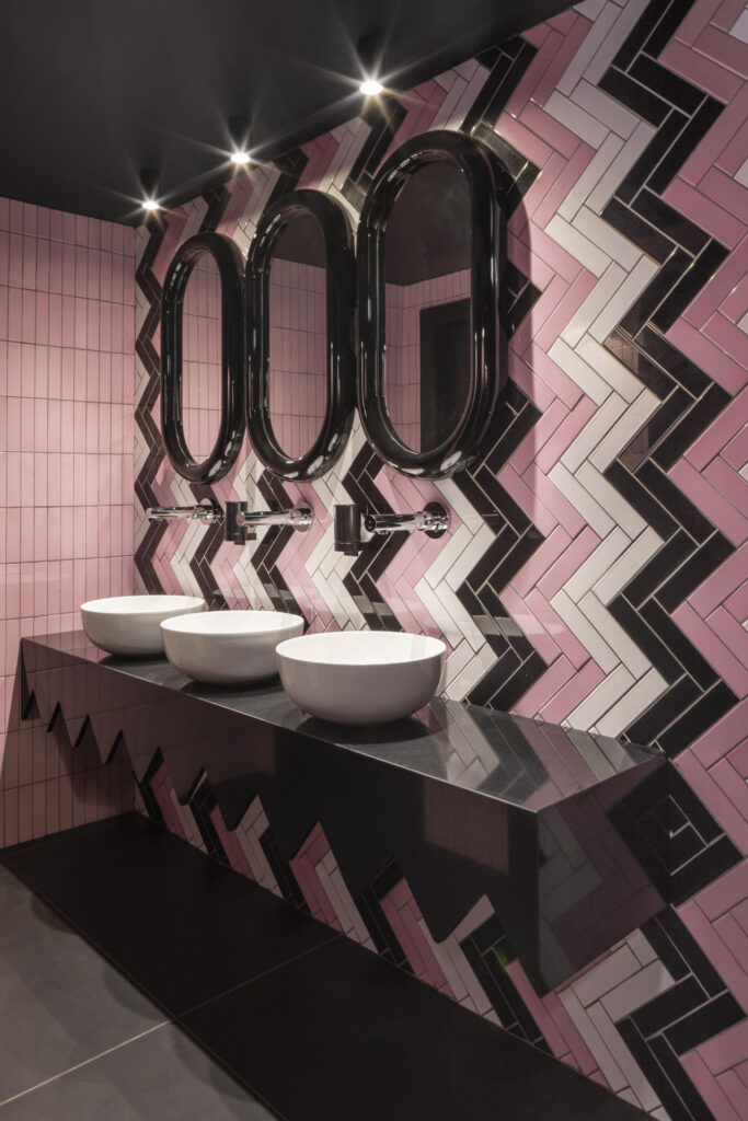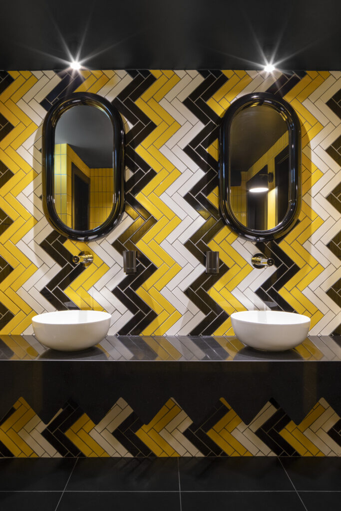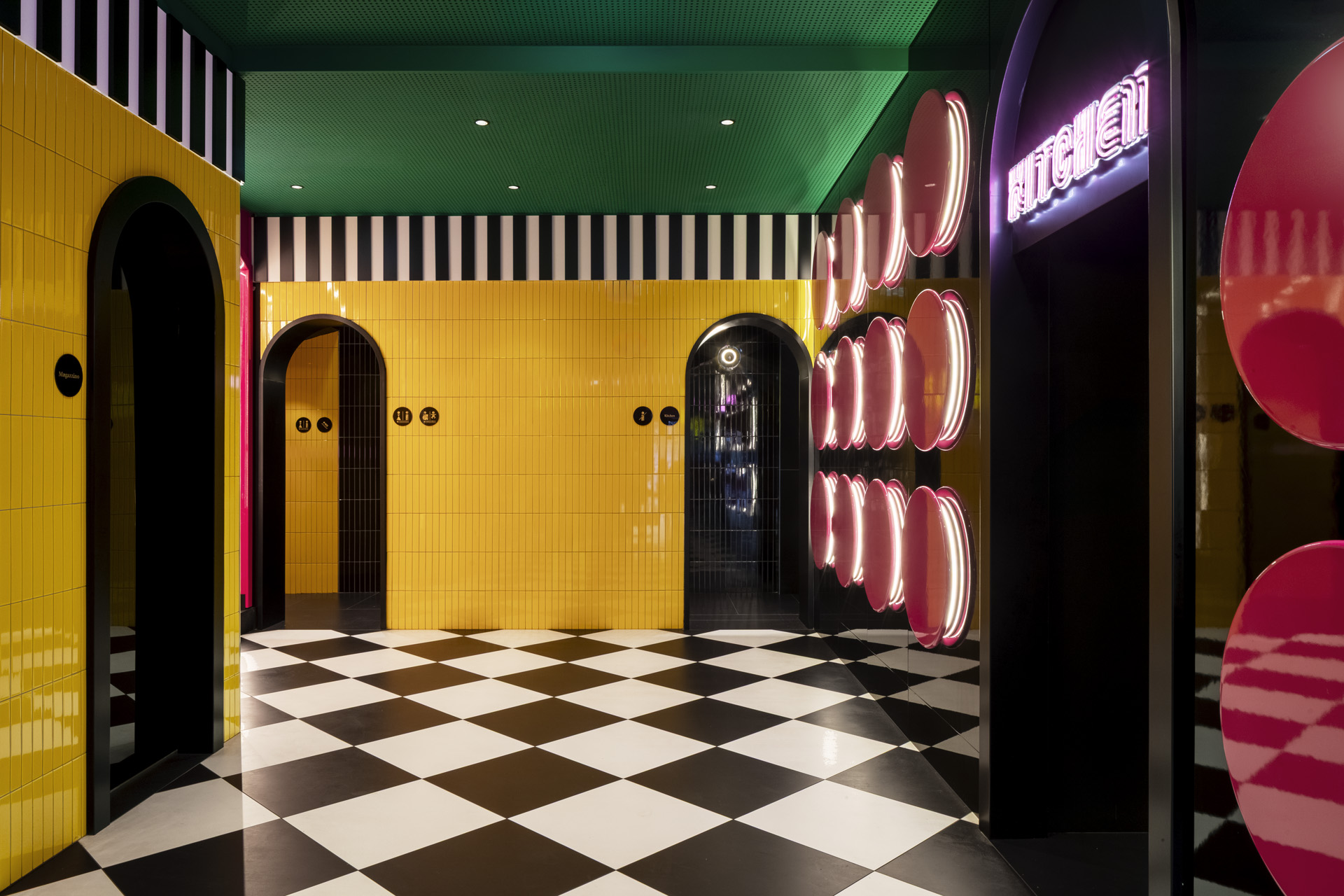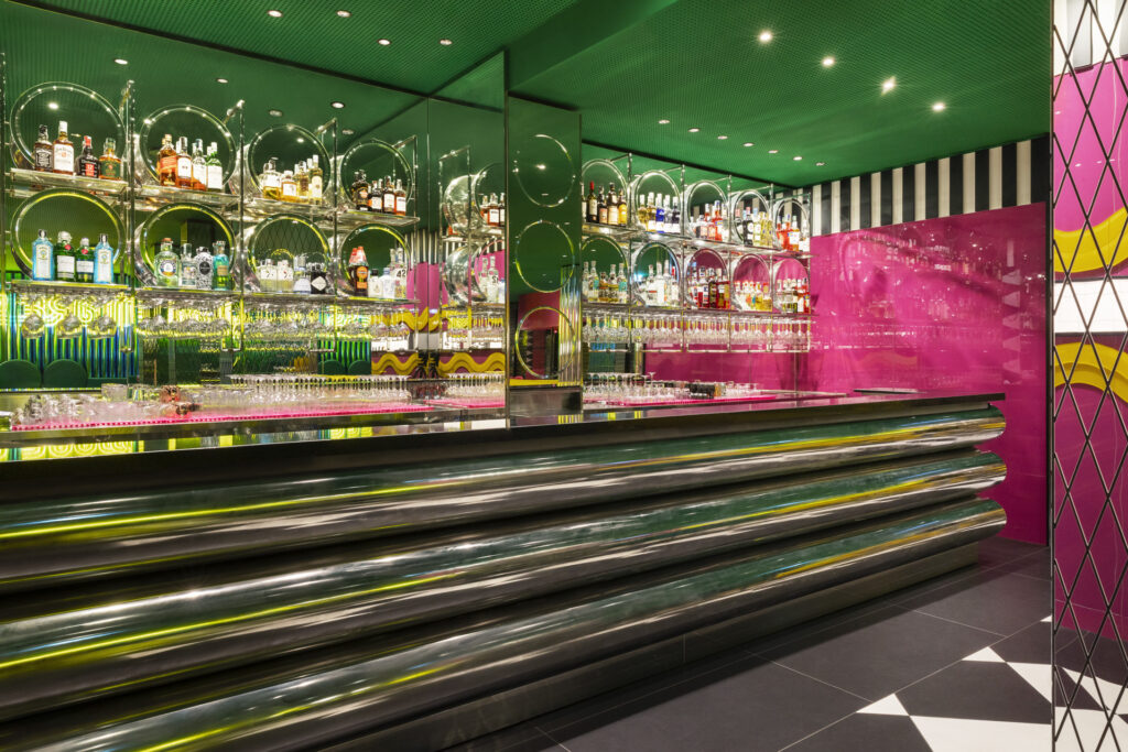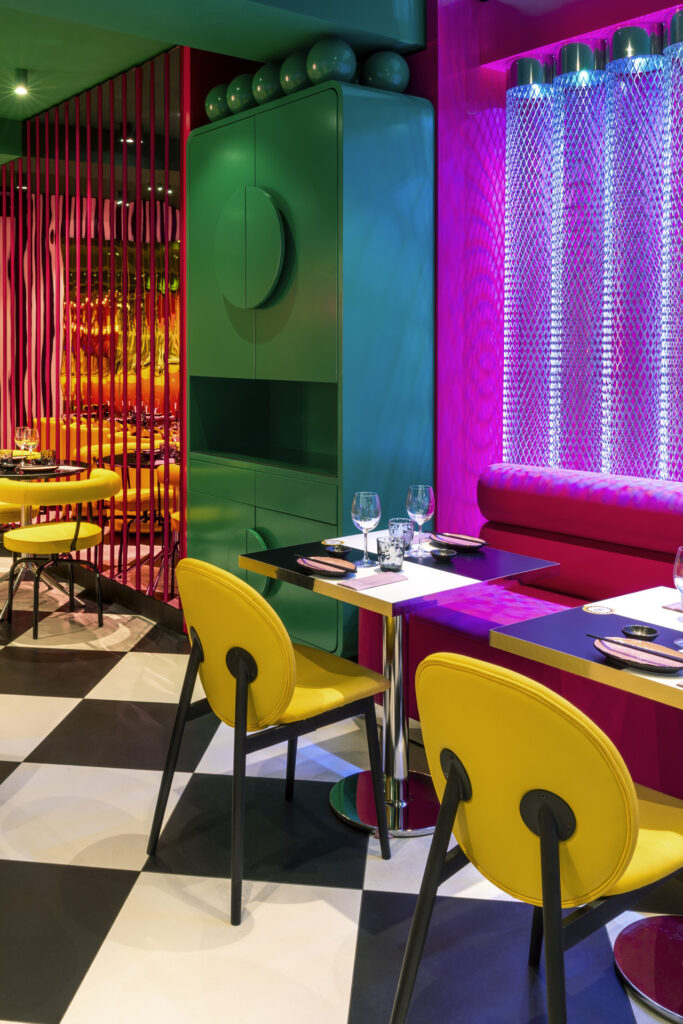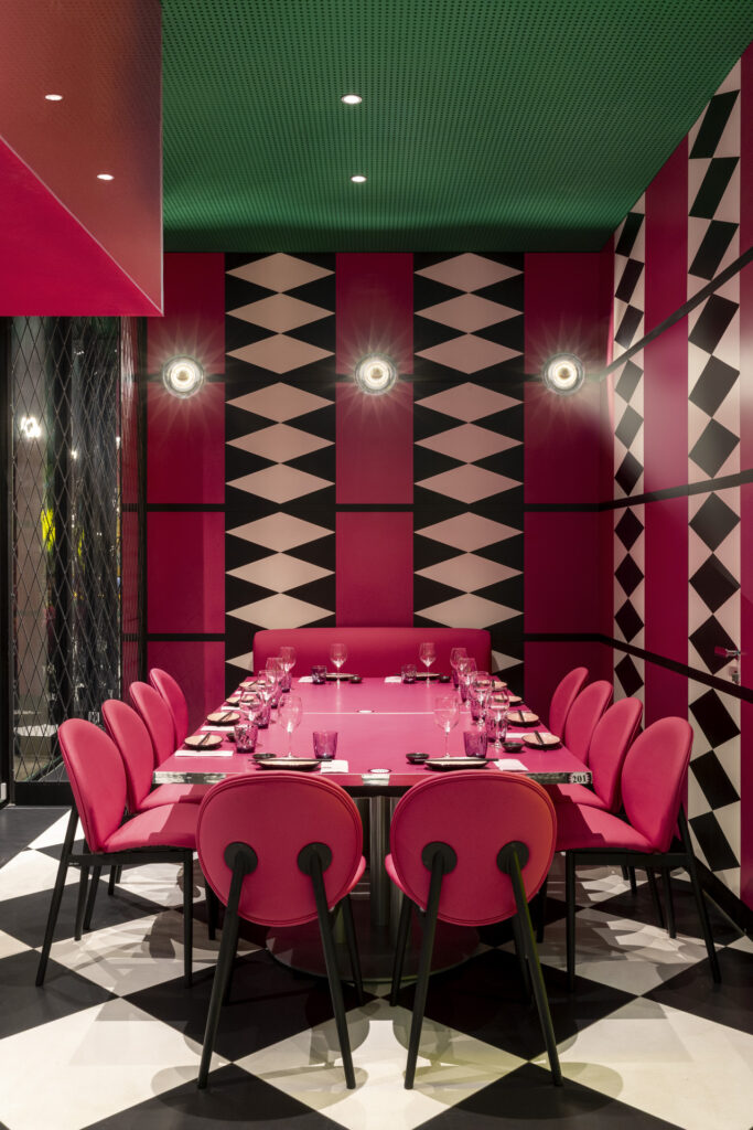 Cuore produttivo e visivo del ristorante è il sushi bar, incorniciato da un’onda in metacrilato giallo e rivestito in grès smaltato magenta con pattern geometrici in bianco e nero. In continuità ortogonale si sviluppa il cocktail bar, caratterizzato da un rivestimento di tubi circolari in acciaio lucido disposti orizzontalmente; semisfere metalliche applicate su pareti specchiate accolgono le bottiglie, che appaiono sospese. Due privé, coerenti nel linguaggio color-block ma differenziati nelle tonalità, completano l’allestimento.