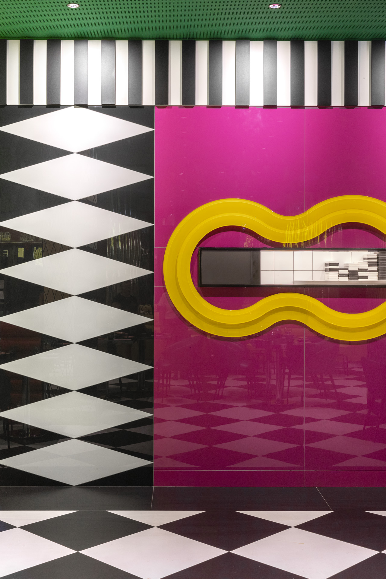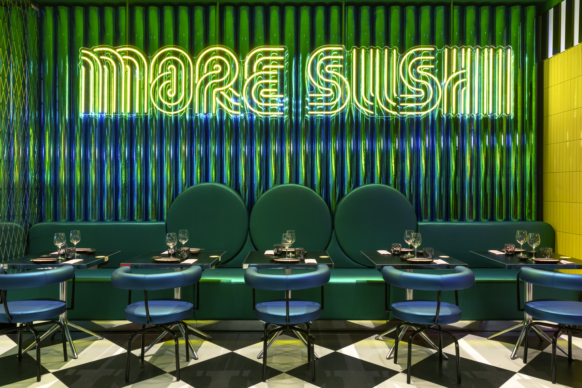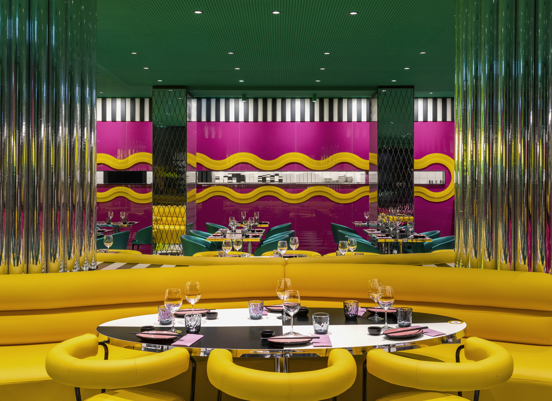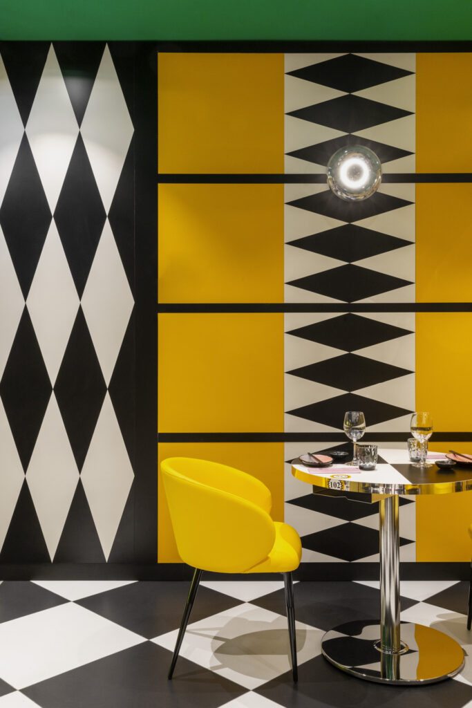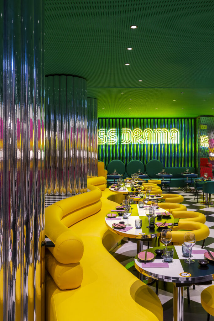 La sala principale è dominata da un divano sinuoso che avvolge pilastri circolari rivestiti in ecopelle cromata. Tavoli a scacchi bianchi e neri, sedute gialle e verdi, superfici riflettenti e trasparenti definiscono una palette audace, calibrata da pattern a contrasto. Una parete composta da tubi in ecopelle cangiante ospita l’installazione luminosa “LESS DRAMA MORE SUSHI”, in dialogo con divani verdi metallizzati dalle forme pop. I pilastri in metacrilato specchiante, lavorati con fresature romboidali, moltiplicano i riflessi e articolano le diverse zone di seduta.
