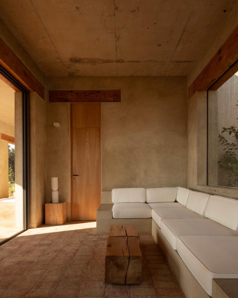 L’impegno verso la sostenibilità è evidente in ogni aspetto del progetto. Sono stati utilizzati materiali locali e manodopera regionale, riducendo l’impronta di carbonio e rafforzando l’identità del luogo. La struttura combina adobe e travi in legno lasciate a vista, per conferire calore agli ambienti. Il pavimento è stato realizzato artigianalmente con adobe prodotto in loco, mentre le pareti sono rifinite con un intonaco in adobe che si armonizza con la palette cromatica circostante.