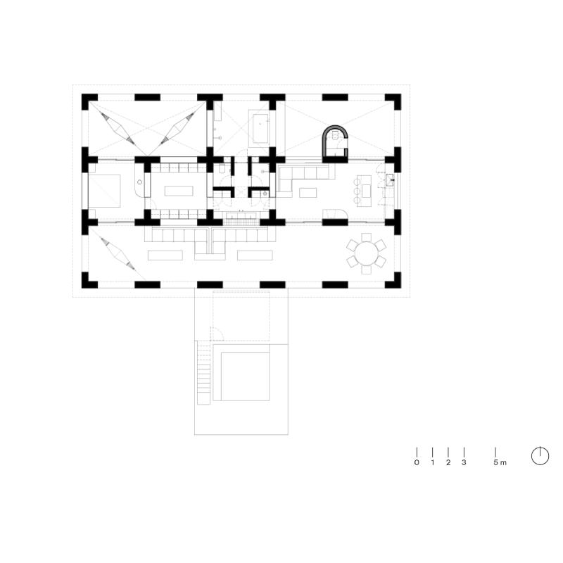 La casa è un rifugio che favorisce la connessione con la natura. Una serie di muri sfalsati e ampie aperture lungo il perimetro offrono protezione e senso di raccolta, permettendo al contempo al paesaggio di attraversare l’architettura. Questa strategia promuove non solo la ventilazione e la luce naturale, ma anche una relazione continua e intima con l’esterno.