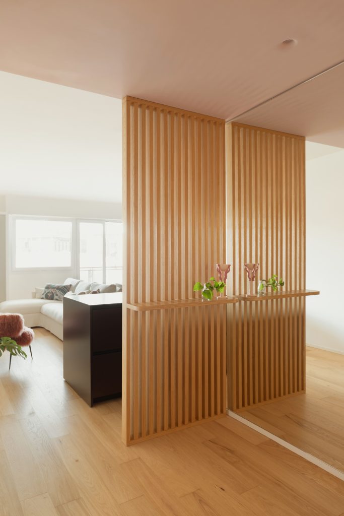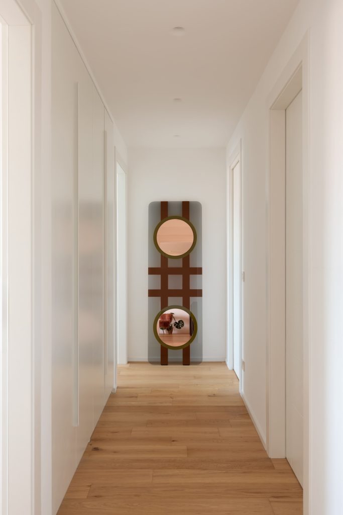 L’ingresso, completamente ripensato, introduce immediatamente il linguaggio materico della casa: una parete listellare in rovere dialoga con un grande specchio a tutta altezza che cela un guardaroba integrato, dando forma a un primo gesto architettonico misurato ma identitario.