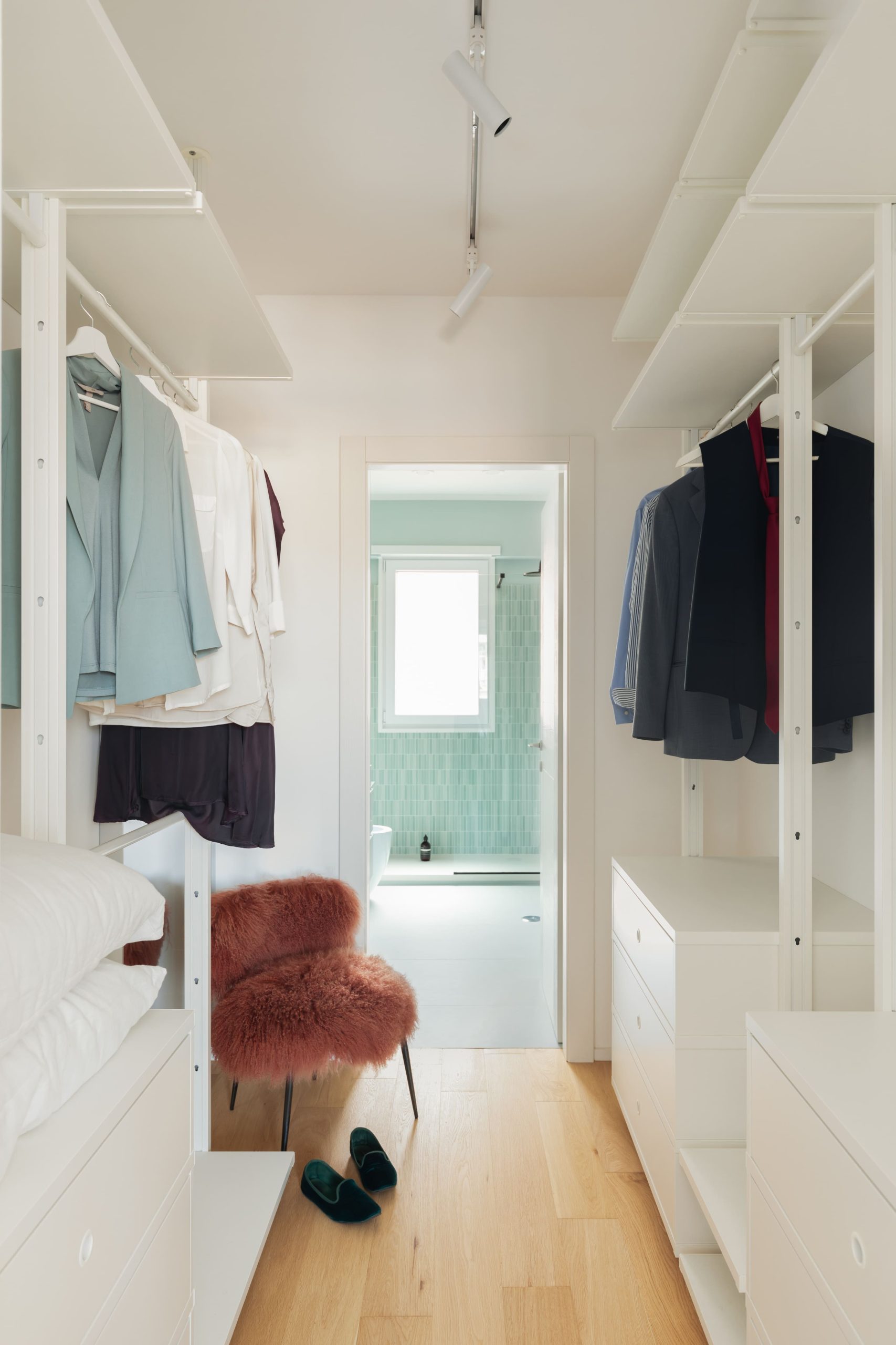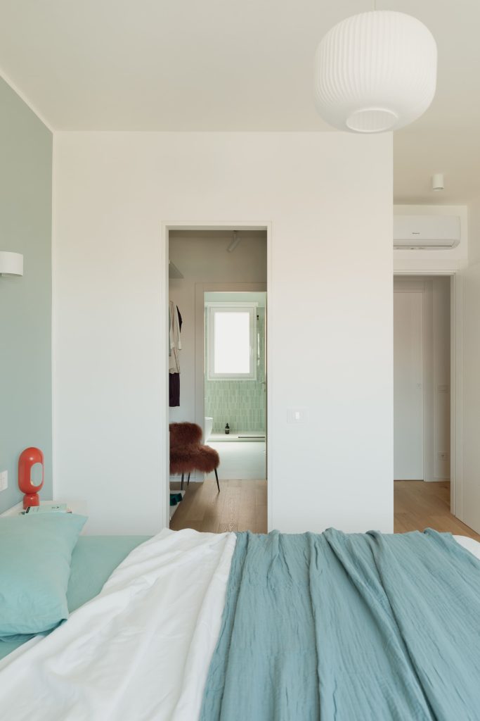 L’appartamento, in origine in buono stato ma superato nella distribuzione e nelle finiture, è stato oggetto di un intervento mirato a restituire leggerezza e continuità agli spazi. La nuova configurazione prevede una camera padronale con cabina armadio e bagno en suite, una seconda camera, un bagno con area lavanderia integrata e una serie di soluzioni contenitive distribuite tra ingresso e corridoio. Il progetto si fonda su un equilibrio rigoroso tra funzione e percezione, dove arredi su misura e falegnamerie disegnano gli spazi con precisione e sobrietà.
