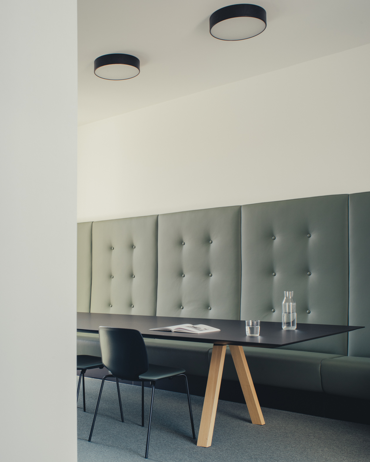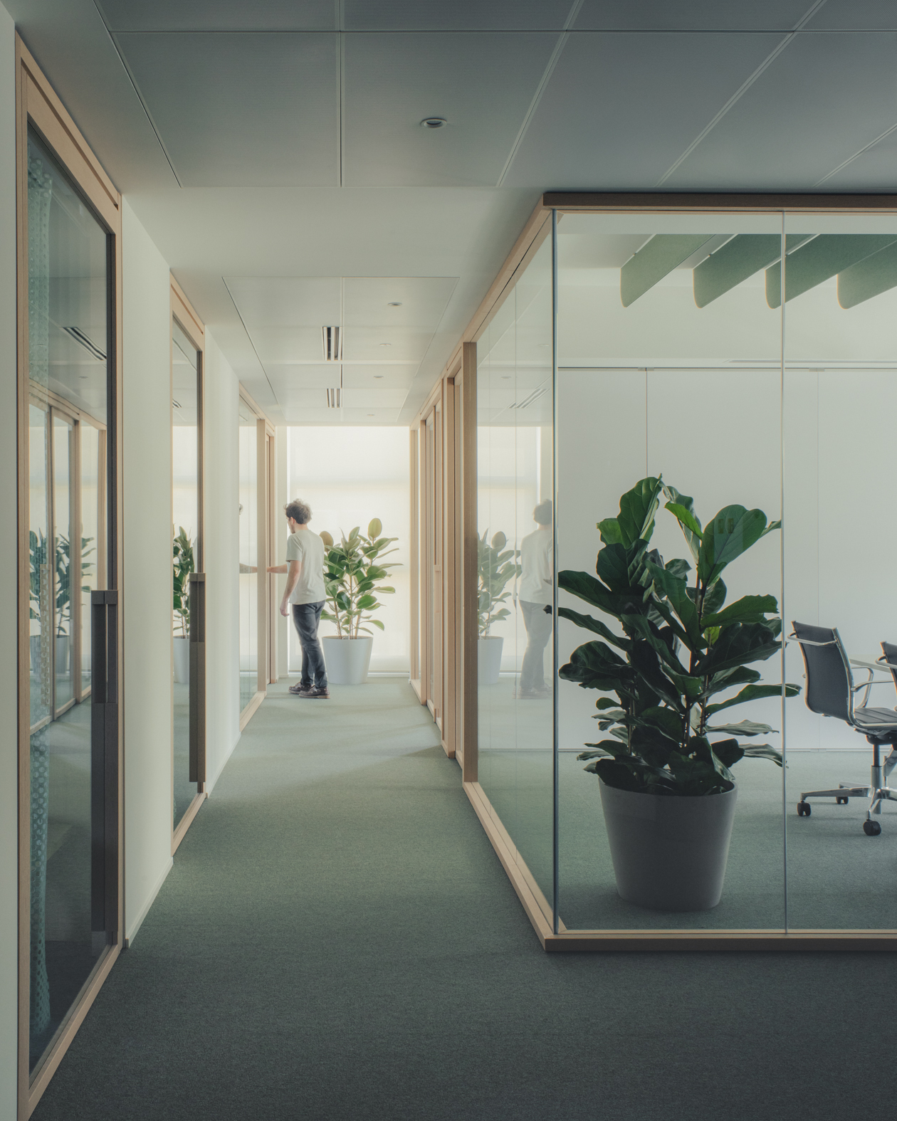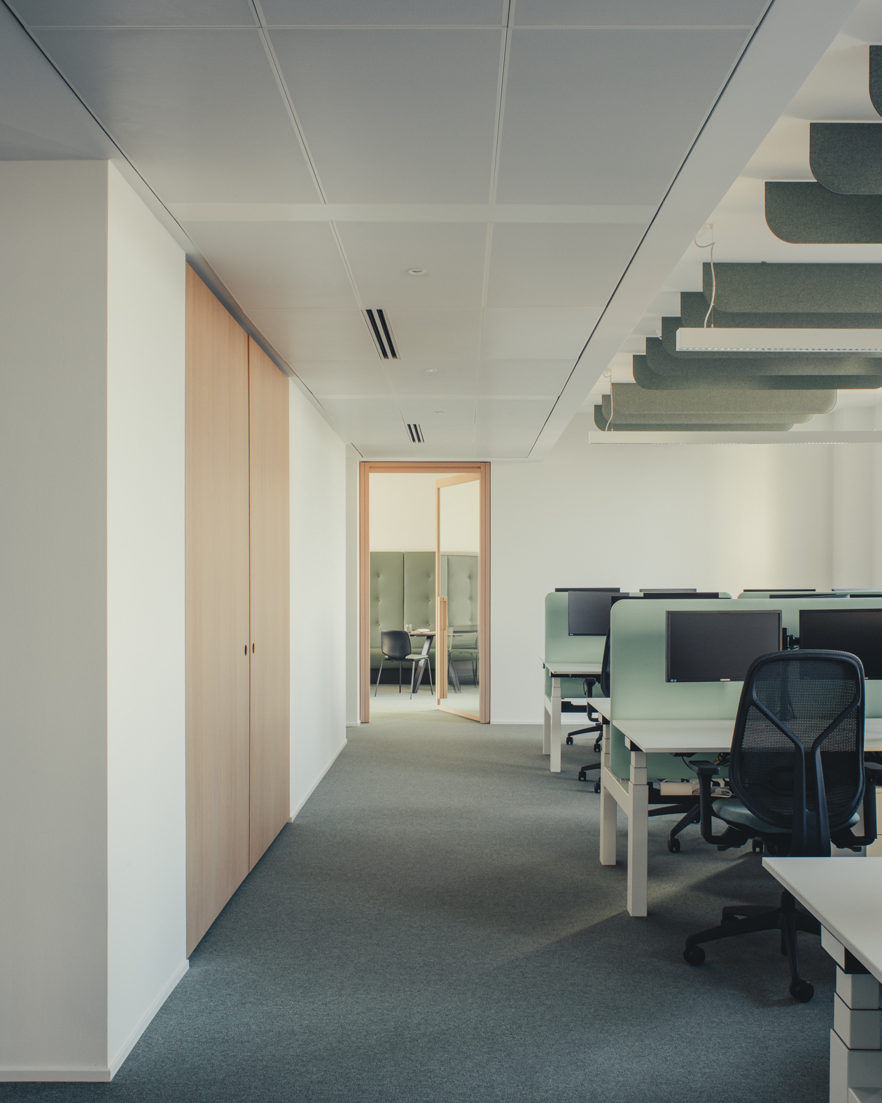 La suddivisione funzionale degli ambienti è affidata a ampie pareti vetrate a tutta altezza in rovere naturale e vetro, che favoriscono continuità visiva e trasparenza. Una parete manovrabile garantisce la massima flessibilità alle due sale riunioni, mentre arredi ergonomici e pannelli sospesi a soffitto regolano l’acustica e scandiscono il ritmo visivo dell’insieme. Il pavimento in moquette, le finiture soft touch e l’uso di materiali caldi come il legno e il marmo cipollino sabbiato contribuiscono a rafforzare il carattere elegante e silenzioso dell’ambiente.