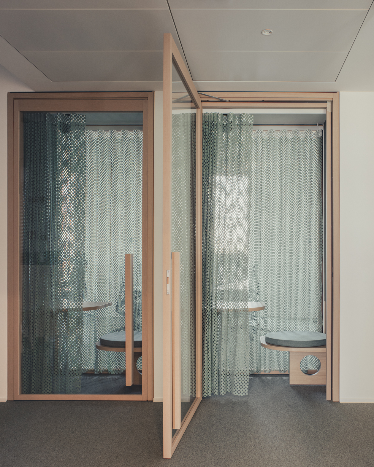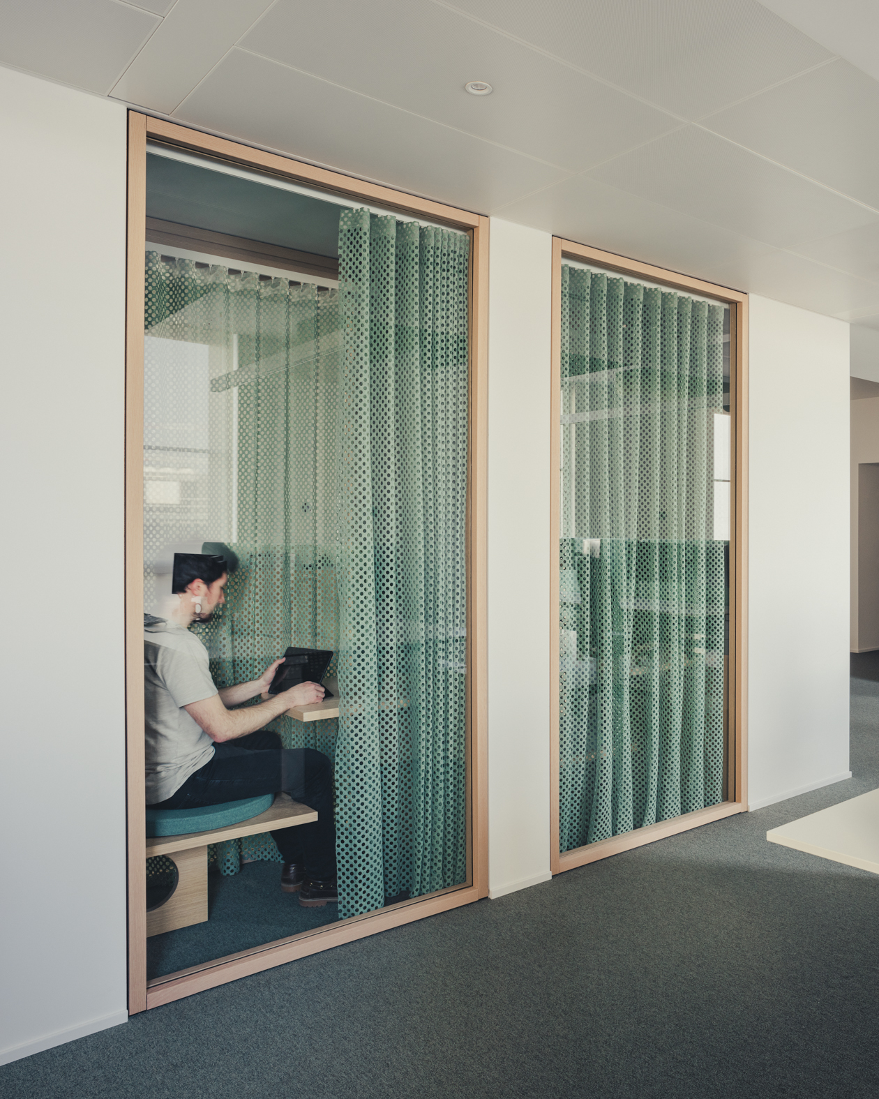 Cuore del progetto sono i phone booth, progettati come spazi permeabili alla luce, ma capaci di trasformarsi, grazie a pannelli e tende fonoassorbenti forate, in luoghi riservati e protetti. Piccoli rifugi pensati per momenti di concentrazione o brevi call, perfettamente in sintonia con l’approccio progettuale complessivo degli Uffici Stoneweg Italy, dove la qualità dello spazio e il benessere delle persone restano i veri protagonisti.