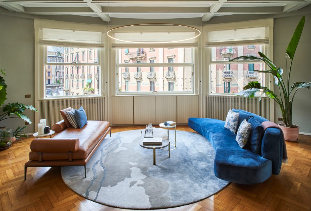 L’organizzazione spaziale si sviluppa attorno a un ampio living a ventaglio, reso scenografico da una tripla finestratura che richiama il fascino del bow-window. Questo ambiente non solo diventa cuore pulsante della casa, ma rappresenta anche la sintesi della visione progettuale: una rilettura contemporanea dei valori estetici della tradizione milanese.