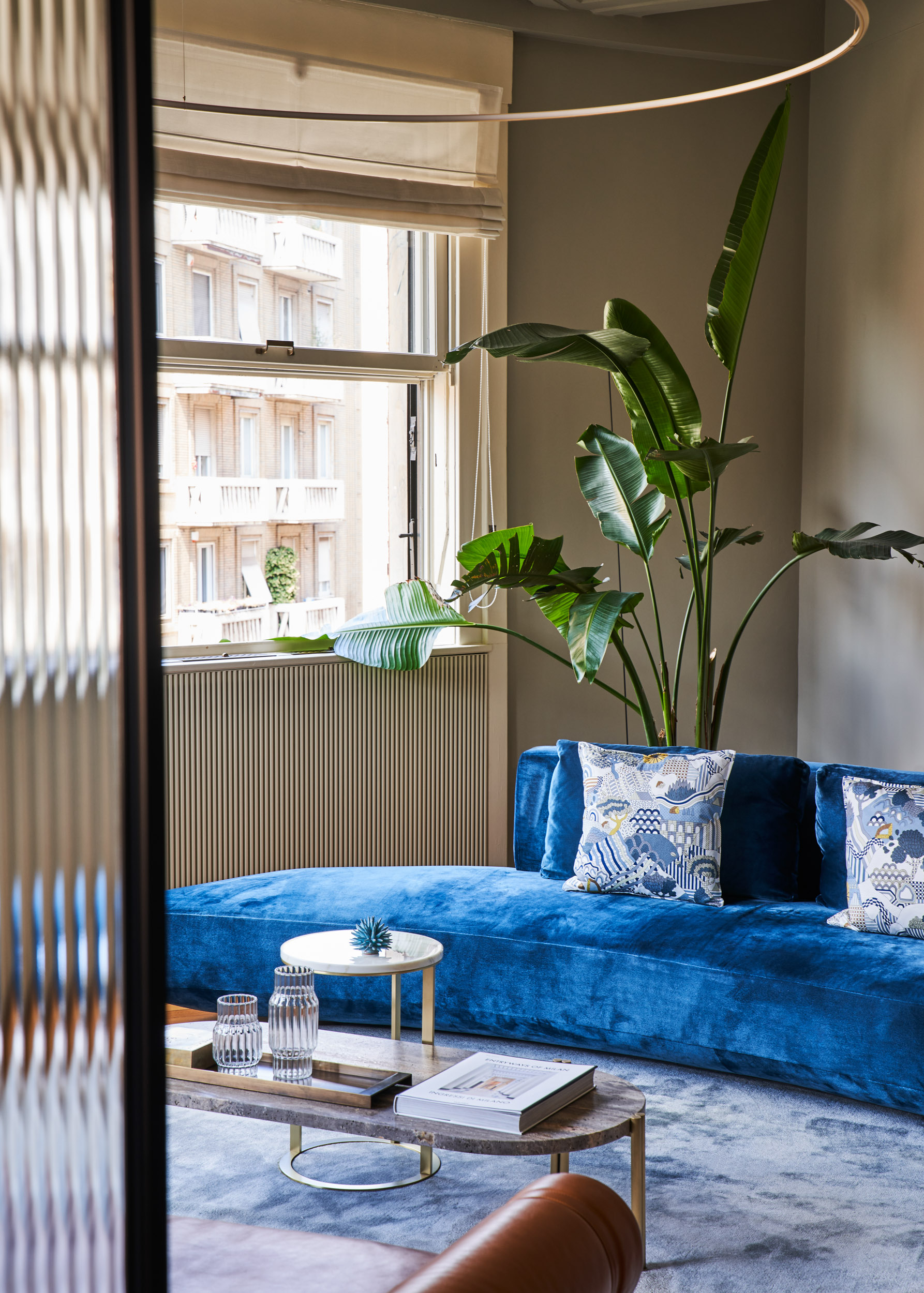 - Velluti e finiture preziose in blu e cognac, un binomio intramontabile che attraversa tutti gli ambienti.