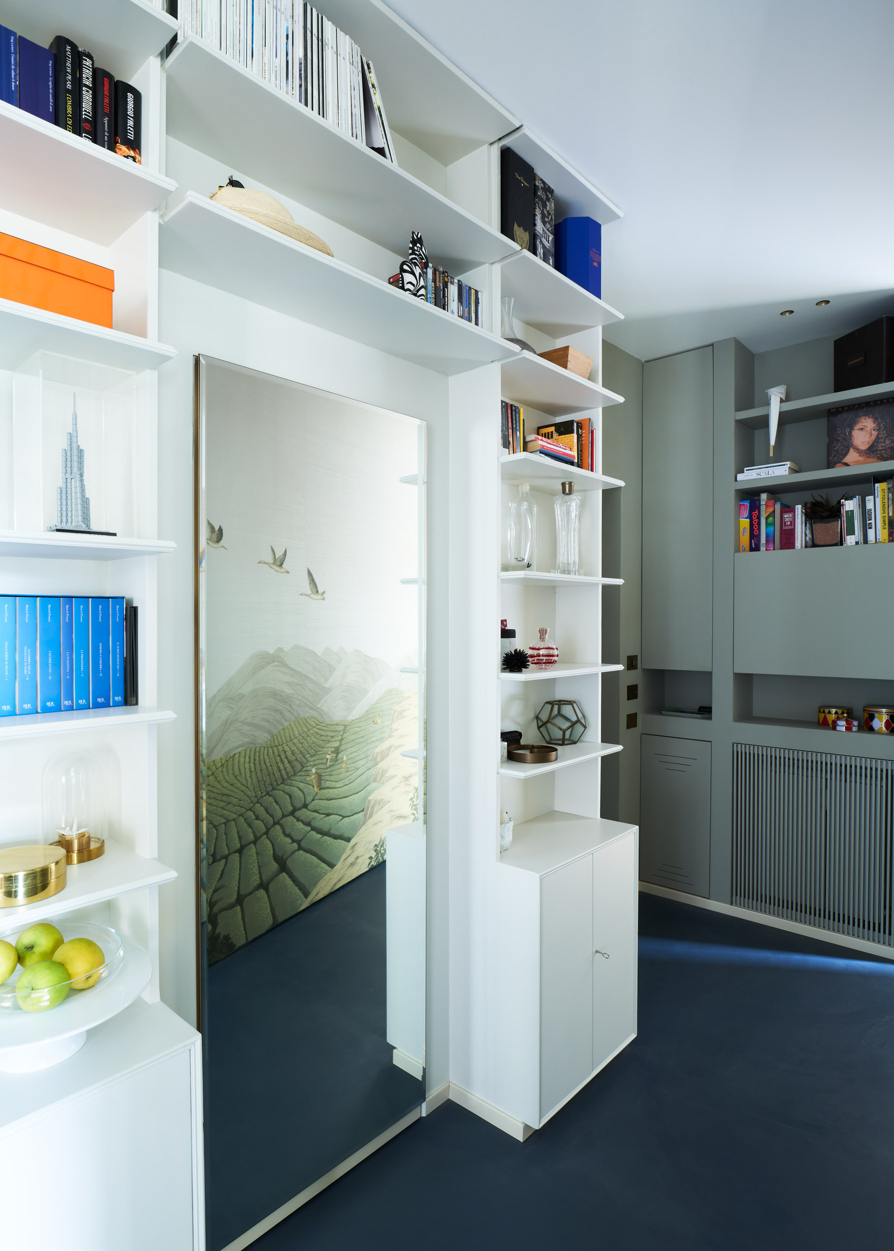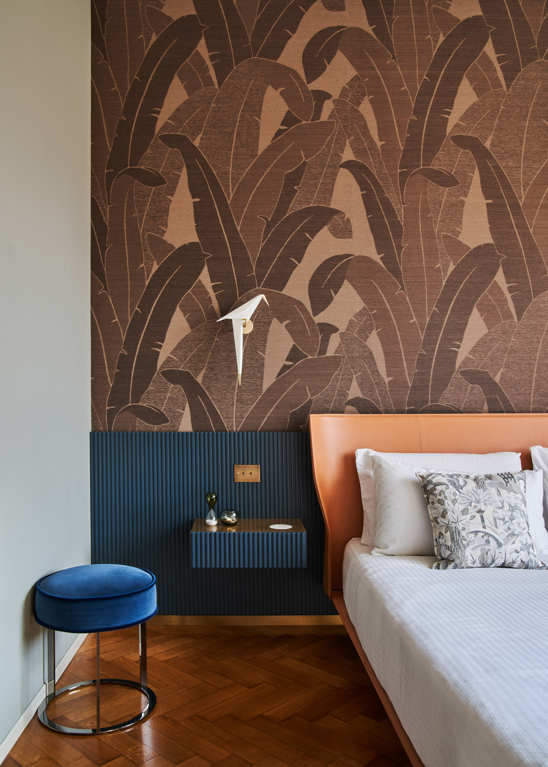 Alcuni elementi originali sono stati accuratamente restaurati: i parquet posati a lisca di pesce, le pareti curve tipiche del periodo Déco, dettagli architettonici capaci di trasmettere la qualità dell’epoca. Tutto il resto è stato invece ripensato con materiali e colori contemporanei, mantenendo un legame con la memoria borghese degli anni ’30.