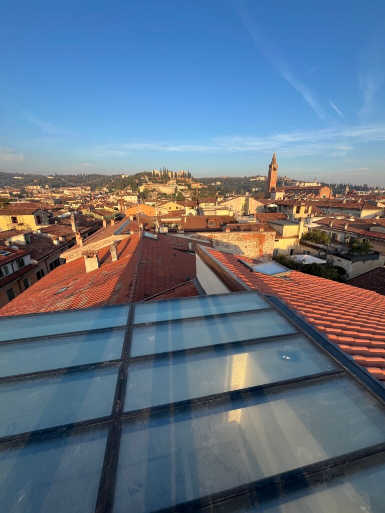 La piccola spa privata rappresenta uno dei momenti più intimi della casa: un luogo raccolto che trova il proprio naturale prolungamento nella terrazza panoramica. Da qui lo sguardo si apre sui tetti e sui profili monumentali di Verona, instaurando un dialogo continuo tra interno ed esterno, tra la dimensione domestica e il paesaggio urbano.