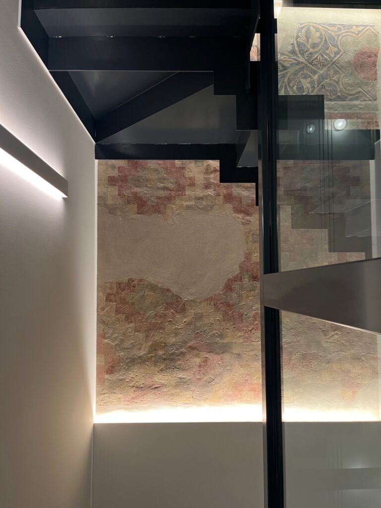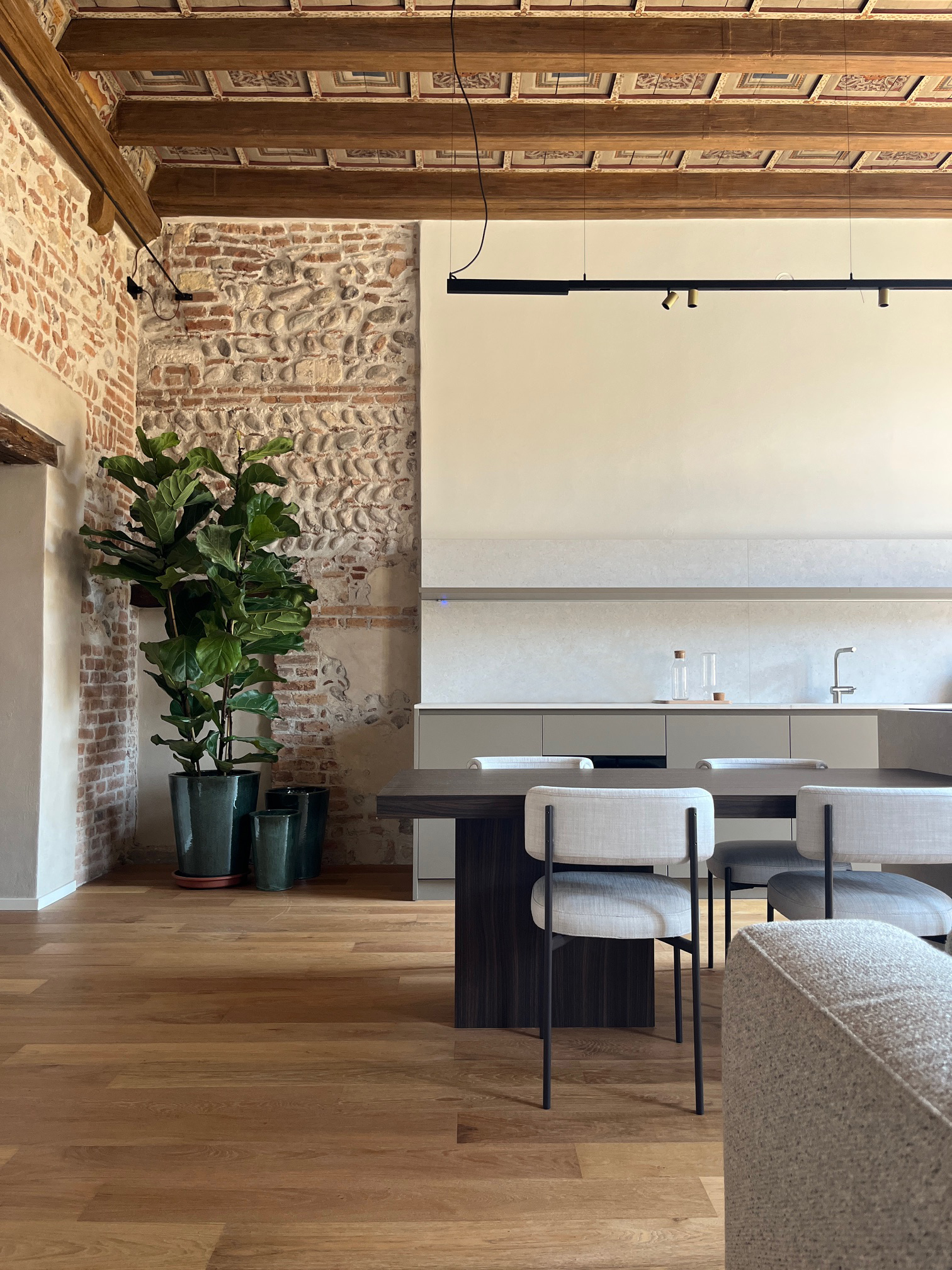Particolare attenzione è stata riservata al recupero dei solai e delle murature in sasso e laterizio. Il restauro ha permesso di riportare in evidenza la tessitura originaria delle superfici e le tracce costruttive stratificate nel tempo, consolidando le strutture senza comprometterne l’autenticità. La materia storica diventa così uno dei protagonisti silenziosi del progetto.