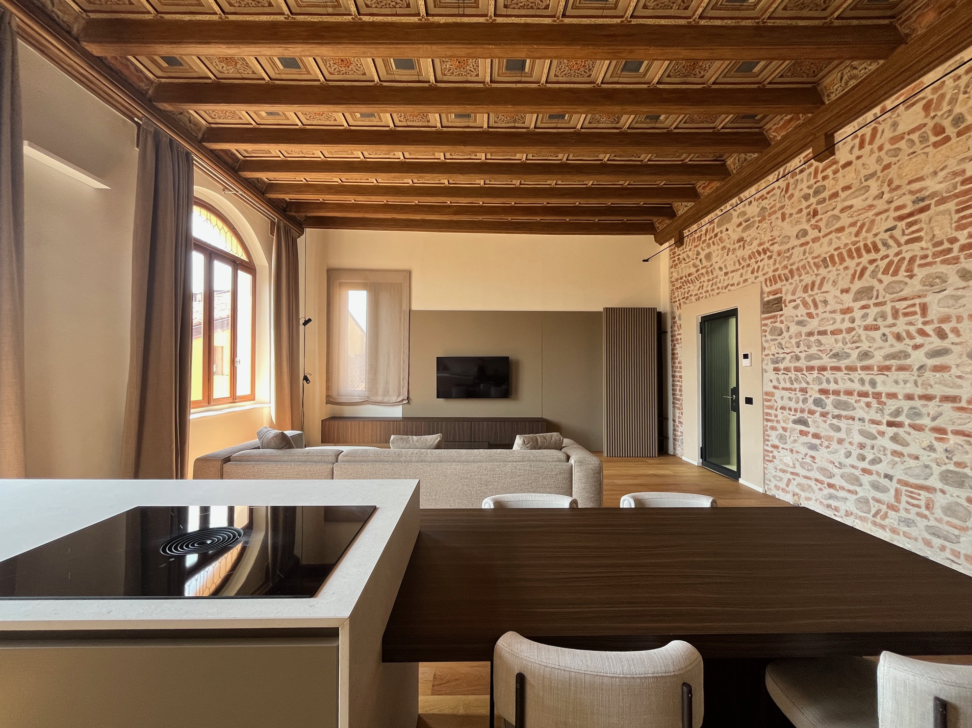 La cucina, definita da volumi essenziali e continui, si integra naturalmente con la zona giorno. Gli arredi dialogano con le murature storiche creando un’atmosfera elegante e contemporanea, mentre i tendaggi filtrano la luce naturale con delicatezza. Nel sottotetto dell’attico trova posto anche una piccola area wellness, che trasforma uno spazio tecnico in un ambiente dedicato al benessere e alla dimensione sensoriale della casa.