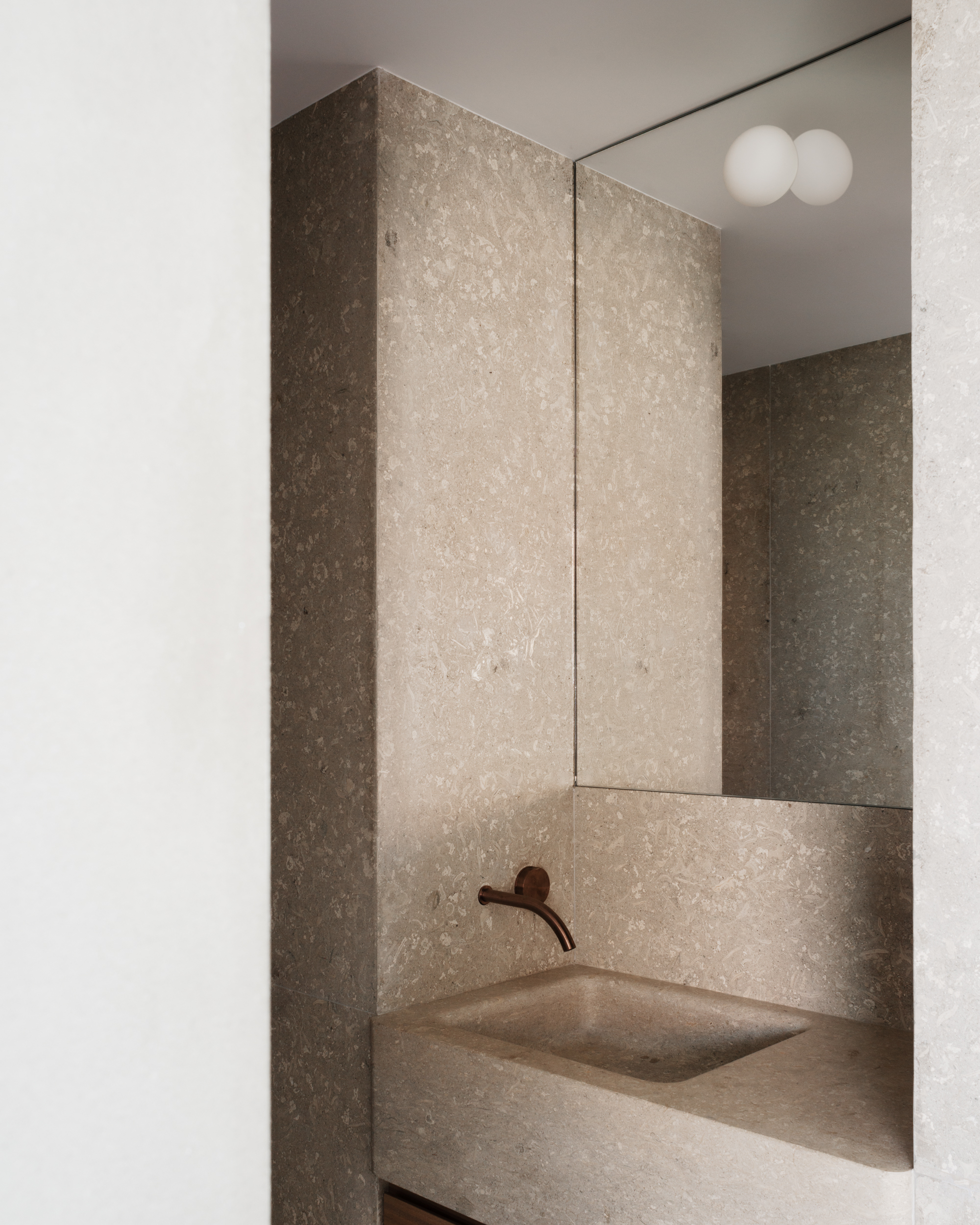 I toni delicati del bagno principale, rivestito interamente in travertino, sviluppano una combinazione perfetta con la rubinetteria delle collezioni ZIQQ e GIOTTO in finitura Bronzo satinata. Questa palette di colori accuratamente scelta da Studio Razavi è in completa armonia con tutti gli spazi dell’appartamento.