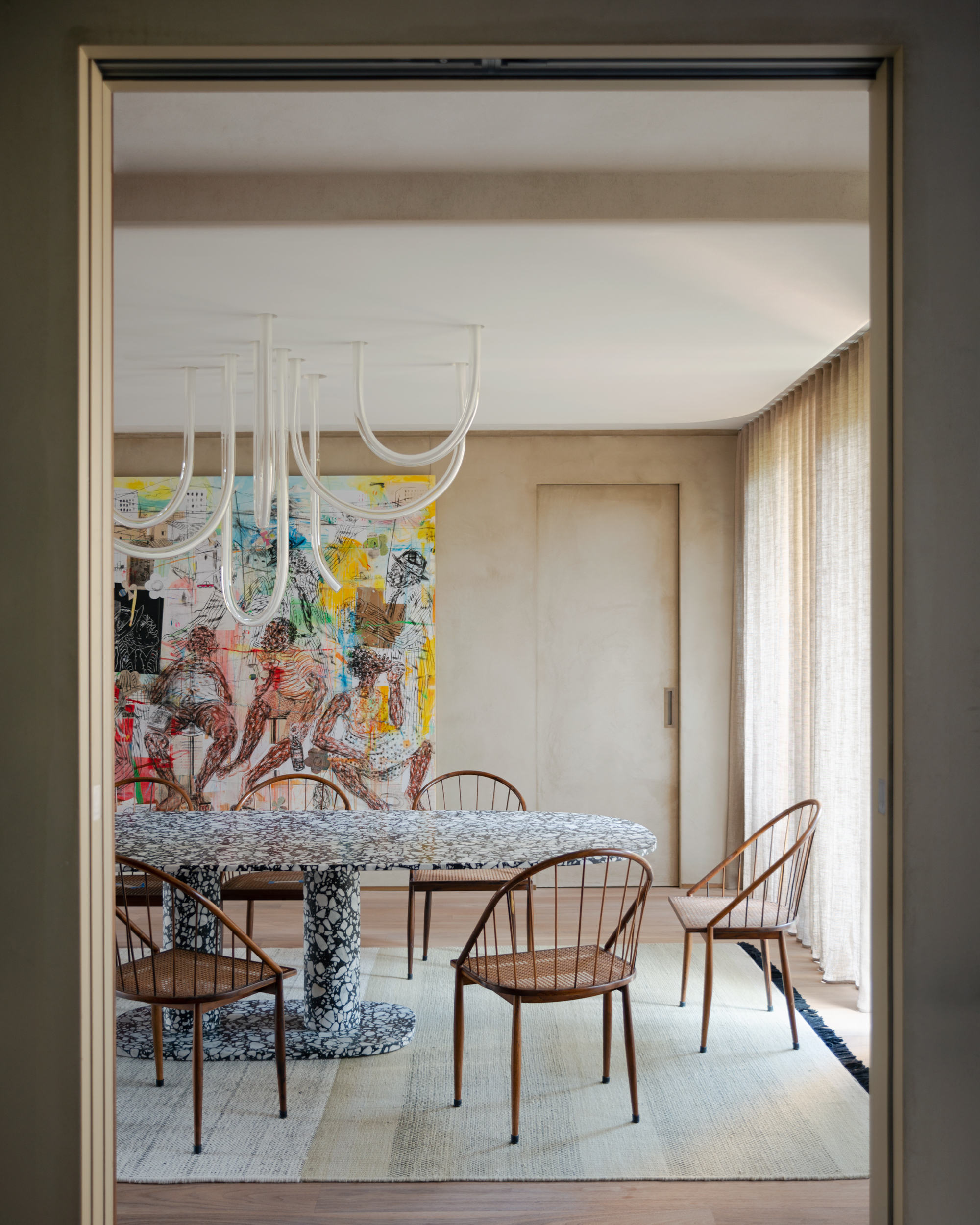 Al centro del triplex, una grande scala a chiocciola color bronzo funge da filo conduttore. I camini rivestiti, gli angoli curvi e le pareti intonacate dai toni caldi creano un senso di morbidezza, che insieme ai pavimenti in rovere, al marmo, al vetro e ai tessuti preziosi offrono sensazioni differenti in ogni momento del giorno. Mobili su misura si mescolano a una raffinata selezione di icone del design internazionale in un appartamento dove l’arte è protagonista.