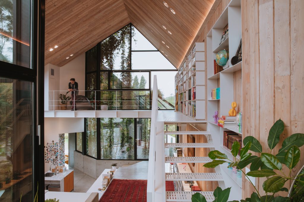La residenza appartiene a Serge Kruppa e a sua moglie, la graphic designer e ceramista Luisa Alzate. Nasce dal desiderio di creare uno spazio al tempo stesso intimo e aperto, tecnologico e naturale, profondamente radicato nel paesaggio ma capace di accogliere influenze provenienti da diverse parti del mondo. L’architettura è composta da moduli indipendenti, ciascuno ruotato leggermente rispetto agli altri: uno per ogni membro della famiglia, più un modulo centrale destinato alla vita condivisa. Corridoi vetrati e assi visive trasparenti uniscono gli spazi, trovando un equilibrio armonioso tra privacy e comunione.