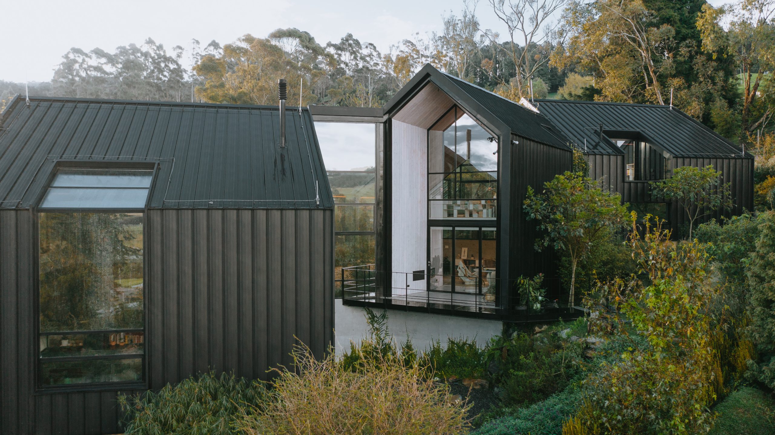 La residenza appartiene a Serge Kruppa e a sua moglie, la graphic designer e ceramista Luisa Alzate. Nasce dal desiderio di creare uno spazio al tempo stesso intimo e aperto, tecnologico e naturale, profondamente radicato nel paesaggio ma capace di accogliere influenze provenienti da diverse parti del mondo. L’architettura è composta da moduli indipendenti, ciascuno ruotato leggermente rispetto agli altri: uno per ogni membro della famiglia, più un modulo centrale destinato alla vita condivisa. Corridoi vetrati e assi visive trasparenti uniscono gli spazi, trovando un equilibrio armonioso tra privacy e comunione.