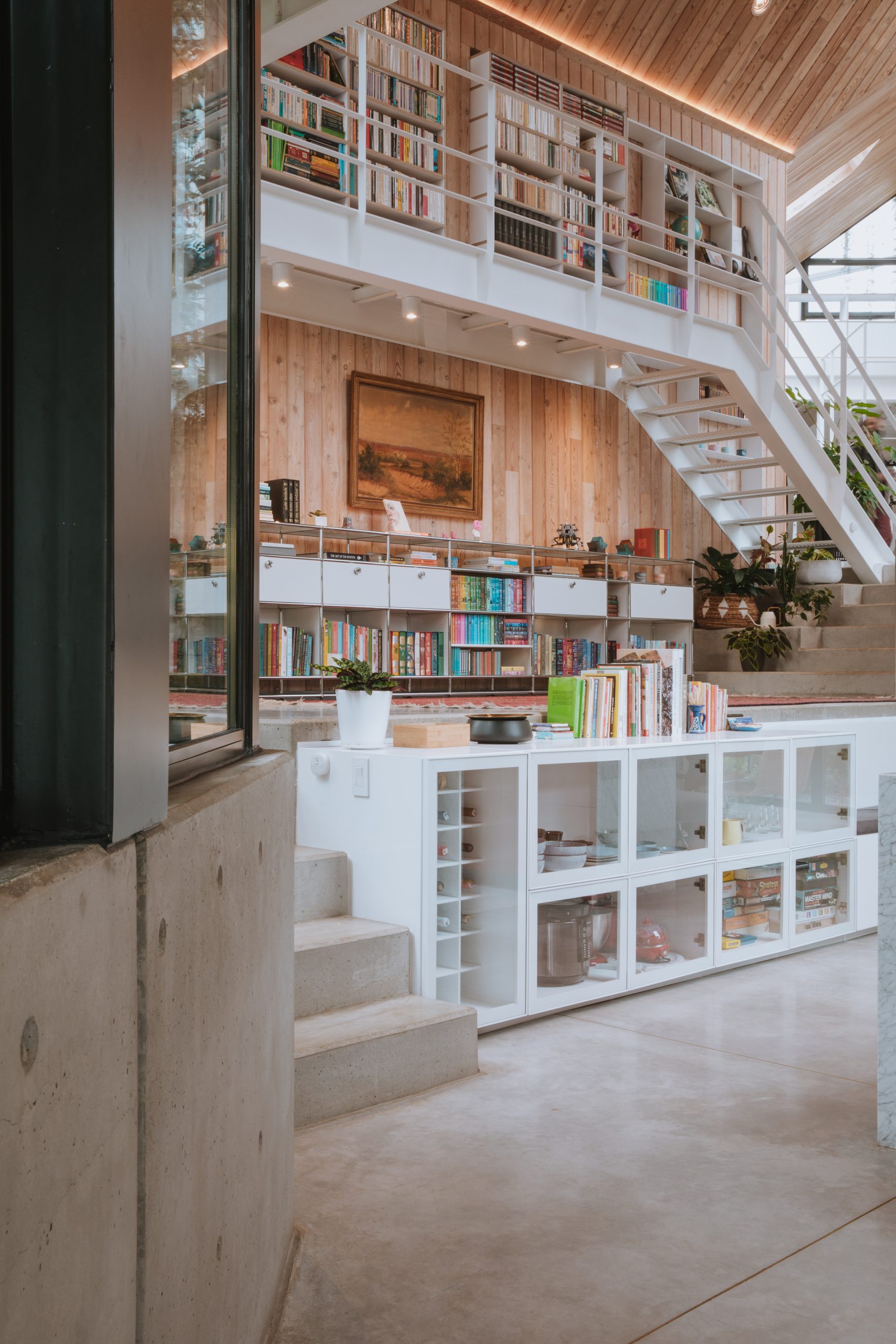 All’interno, i sistemi modulari USM Haller costituiscono un filo conduttore estetico che attraversa l’intera abitazione. Le composizioni, progettate su misura, si adattano ai diversi spazi e funzioni, mantenendo coerenza e armonia. “Da svizzero, possedere mobili USM è sempre stato un sogno”, confida Kruppa. “Come gli orologi del mio paese, rappresentano una perfezione pratica destinata a durare. La loro modularità ci permette di creare esattamente ciò che immaginiamo”.