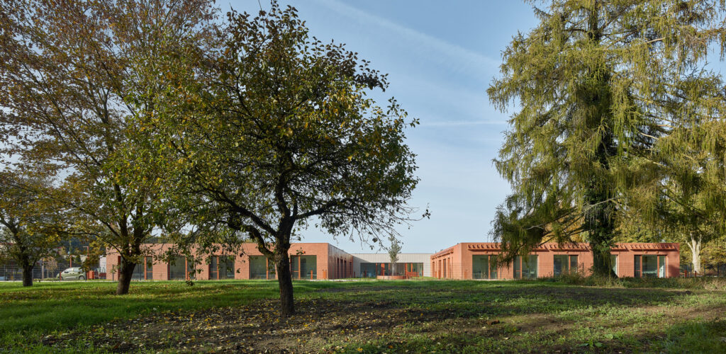 Il lotto, ampio e pianeggiante, ha consentito la realizzazione di un edificio a un solo piano, esteso e percorribile, immerso in un paesaggio orizzontale fatto di campi, boschi e strade che si perdono all’orizzonte. La composizione planimetrica richiama un quadrifoglio: quattro “famiglie” disposte ortogonalmente attorno a un nucleo centrale. Un’immagine quasi classica, simmetrica, che evoca solidità e misura. L’accesso principale, a sud, conduce a una hall luminosa affacciata su un grande atrio ovale, cuore distributivo dell’intero complesso. Da qui si diramano i percorsi verso i singoli nuclei, in un sistema che evita i corridoi lineari e favorisce invece sequenze raccolte attorno a corti interne. L’idea è semplice quanto efficace: camminare come gesto quotidiano, attraversare la luce, mantenere un rapporto costante con il giardino.