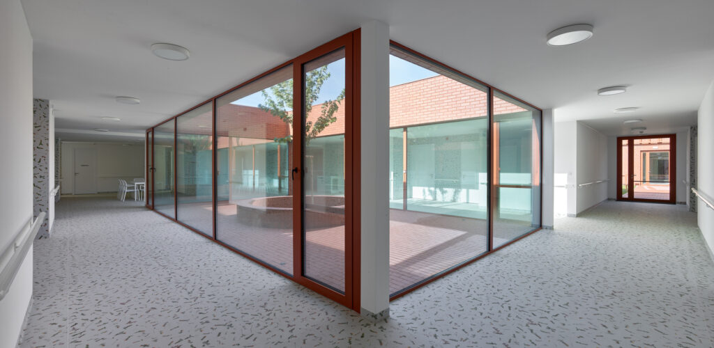 Ogni nucleo è concepito come unità autosufficiente, dotata di spazi comuni, locali di servizio e ambienti per il personale. Le camere si dispongono lungo il perimetro di un atrio verde, generando una composizione compatta e permeabile alla luce naturale. I corridoi si aprono sul giardino interno, che diventa fulcro visivo e luogo di orientamento. Ogni stanza dispone di una piccola terrazza privata con accesso diretto all’esterno; i cortili coperti garantiscono spazi protetti in ogni stagione, mentre giardini più ampi connettono a coppie i nuclei abitativi. La continuità visiva tra interno ed esterno - tra mattone, verde e cielo – rafforza la dimensione domestica dell’intervento.