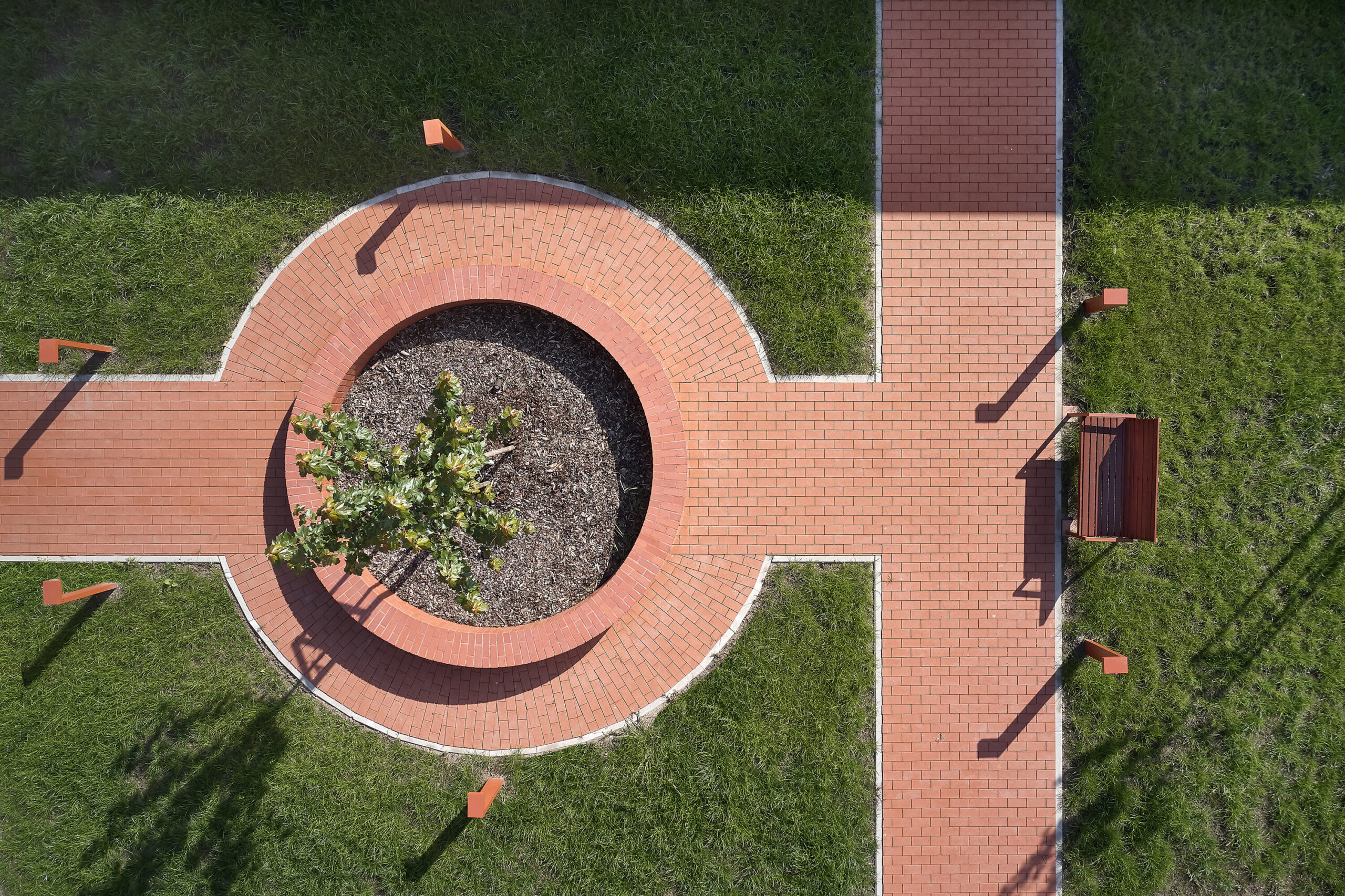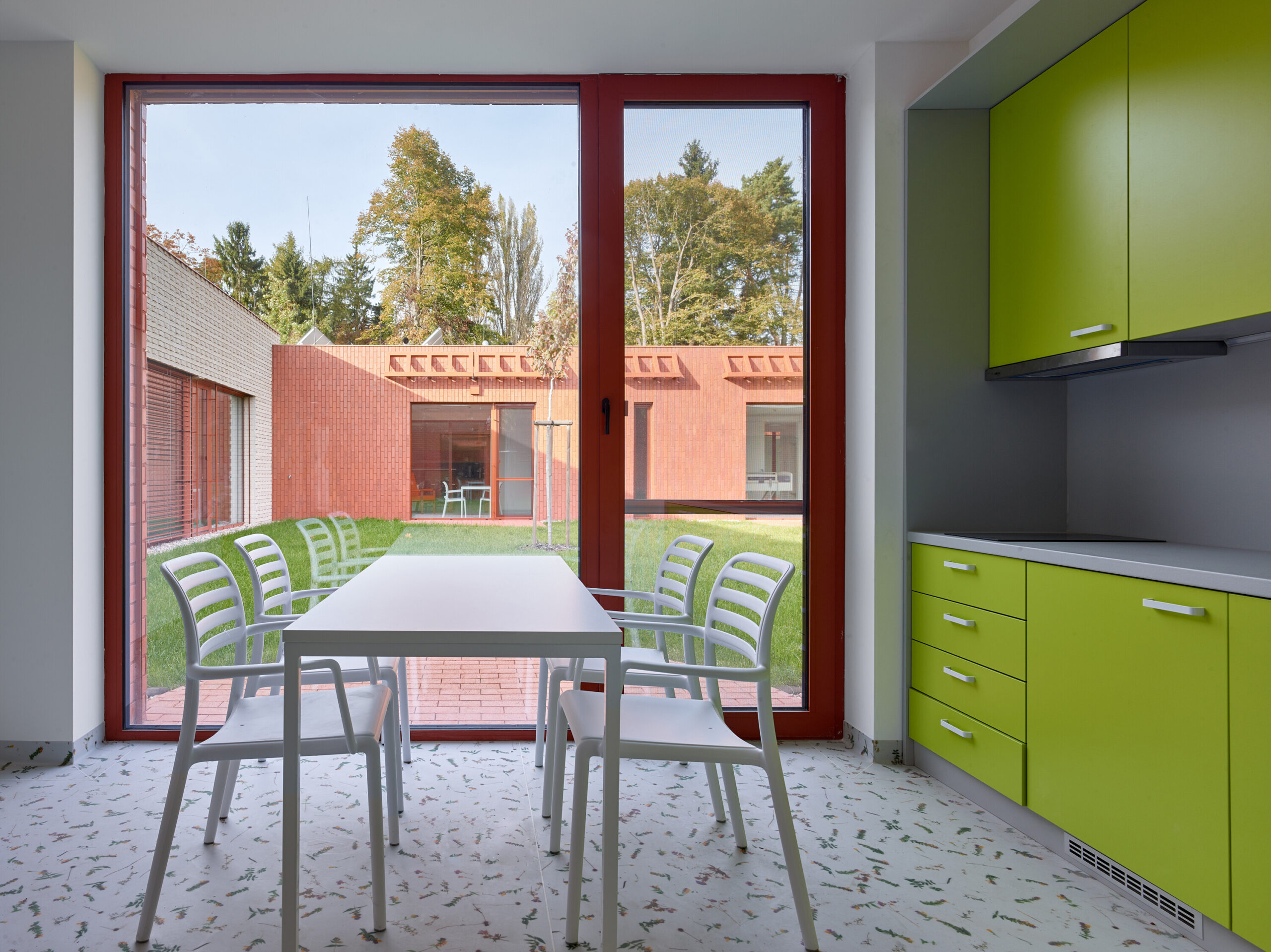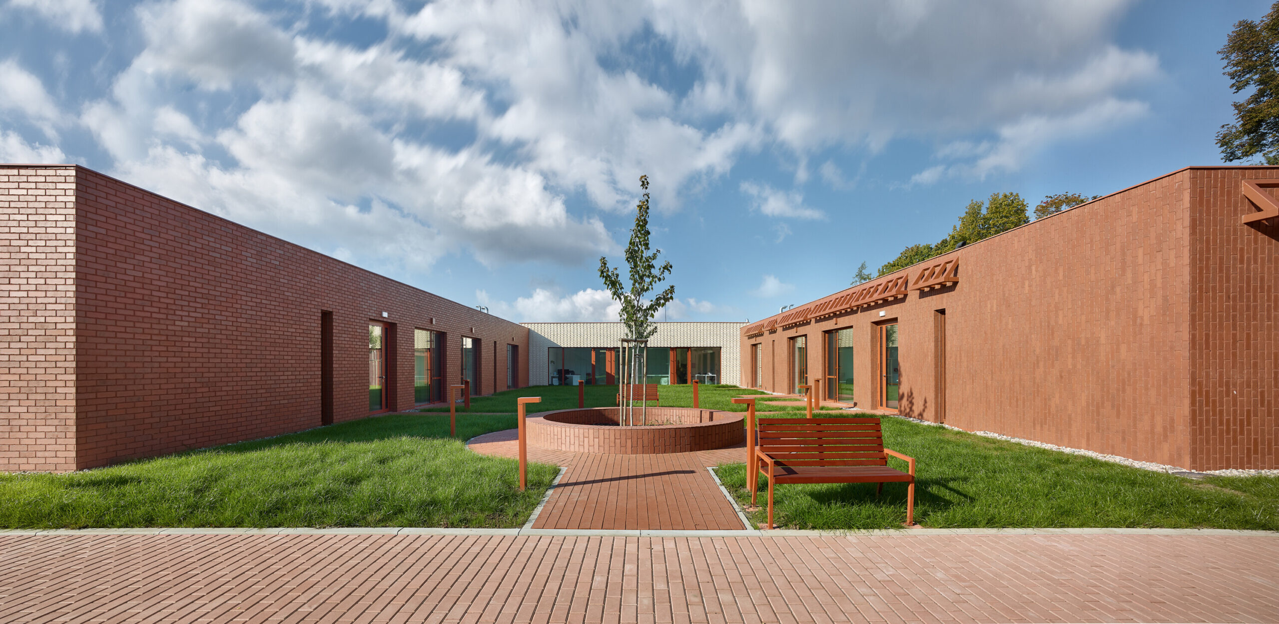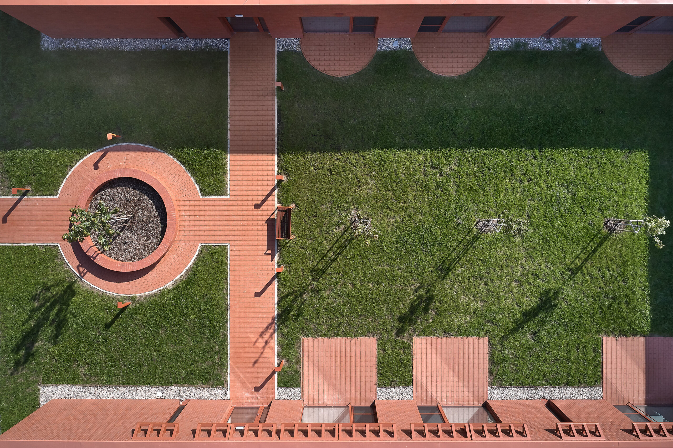 Ogni nucleo è concepito come unità autosufficiente, dotata di spazi comuni, locali di servizio e ambienti per il personale. Le camere si dispongono lungo il perimetro di un atrio verde, generando una composizione compatta e permeabile alla luce naturale. I corridoi si aprono sul giardino interno, che diventa fulcro visivo e luogo di orientamento. Ogni stanza dispone di una piccola terrazza privata con accesso diretto all’esterno; i cortili coperti garantiscono spazi protetti in ogni stagione, mentre giardini più ampi connettono a coppie i nuclei abitativi. La continuità visiva tra interno ed esterno - tra mattone, verde e cielo – rafforza la dimensione domestica dell’intervento.