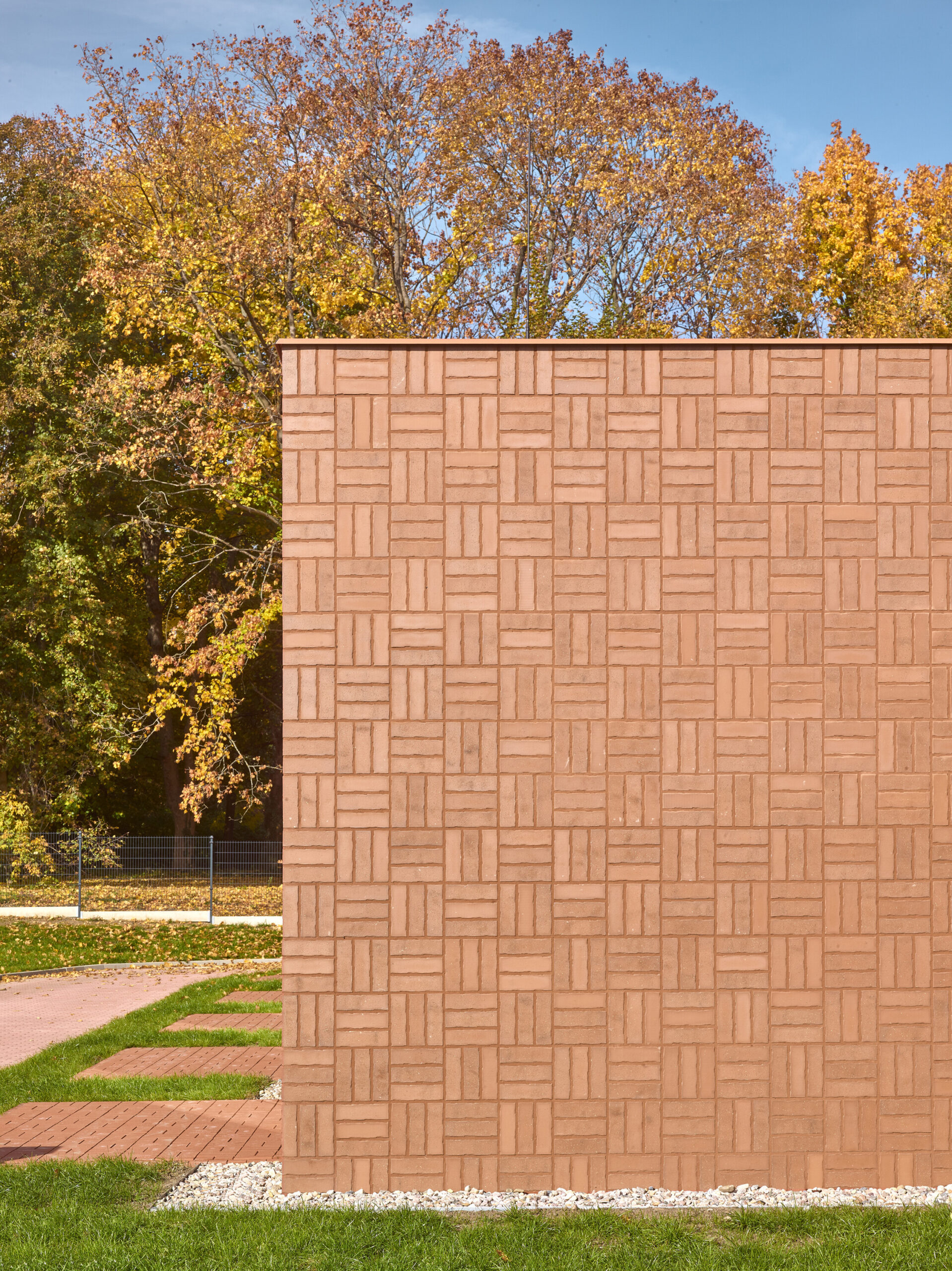 Il mattone, materiale archetipico della casa, dialoga con i lunghi muri del cimitero antistante. Le facciate sono scandite dal ritmo regolare di finestre a tutta altezza che si aprono come varchi simbolici nella massa muraria. Ogni nucleo è caratterizzato da una variazione nel disegno e nei sistemi di schermatura – strutture metalliche rettangolari, elementi inclinati, superfici più compatte - a sottolinearne l’identità specifica. Anche all’interno il mattone ritorna, accostato al bianco per amplificare la luminosità degli ambienti. Un dettaglio poetico attraversa l’intero progetto: i pavimenti riproducono, attraverso stampe personalizzate, fotografie di fiori ed erbe locali. Nascono così le quattro “case” - Erba, Bartsia, Camomilla, Tarassaco - ognuna riconoscibile da un motivo floreale che si estende fino agli ingressi delle camere, trasformando la soglia in un piccolo quadro naturale.