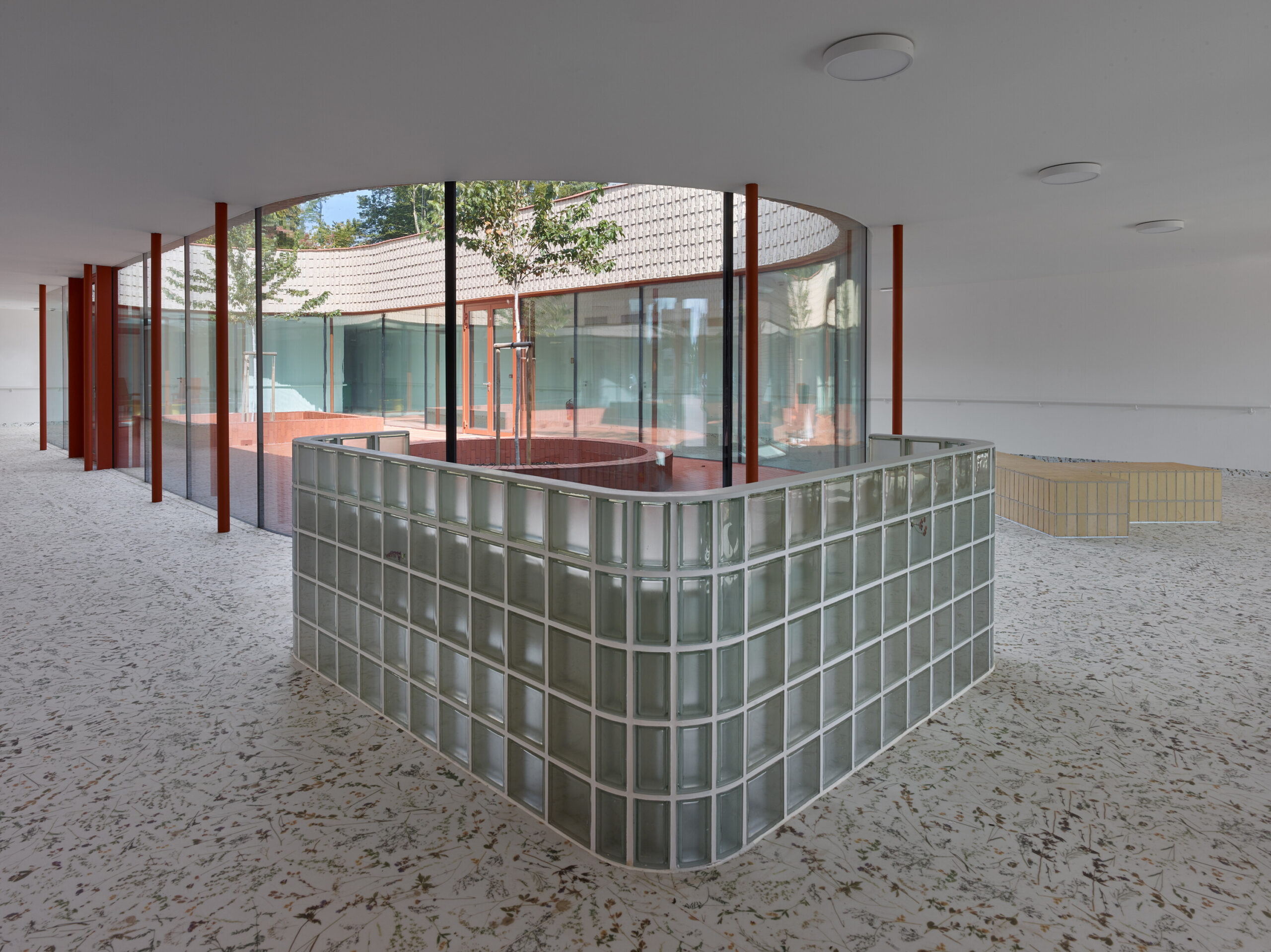Il lotto, ampio e pianeggiante, ha consentito la realizzazione di un edificio a un solo piano, esteso e percorribile, immerso in un paesaggio orizzontale fatto di campi, boschi e strade che si perdono all’orizzonte. La composizione planimetrica richiama un quadrifoglio: quattro “famiglie” disposte ortogonalmente attorno a un nucleo centrale. Un’immagine quasi classica, simmetrica, che evoca solidità e misura. L’accesso principale, a sud, conduce a una hall luminosa affacciata su un grande atrio ovale, cuore distributivo dell’intero complesso. Da qui si diramano i percorsi verso i singoli nuclei, in un sistema che evita i corridoi lineari e favorisce invece sequenze raccolte attorno a corti interne. L’idea è semplice quanto efficace: camminare come gesto quotidiano, attraversare la luce, mantenere un rapporto costante con il giardino.