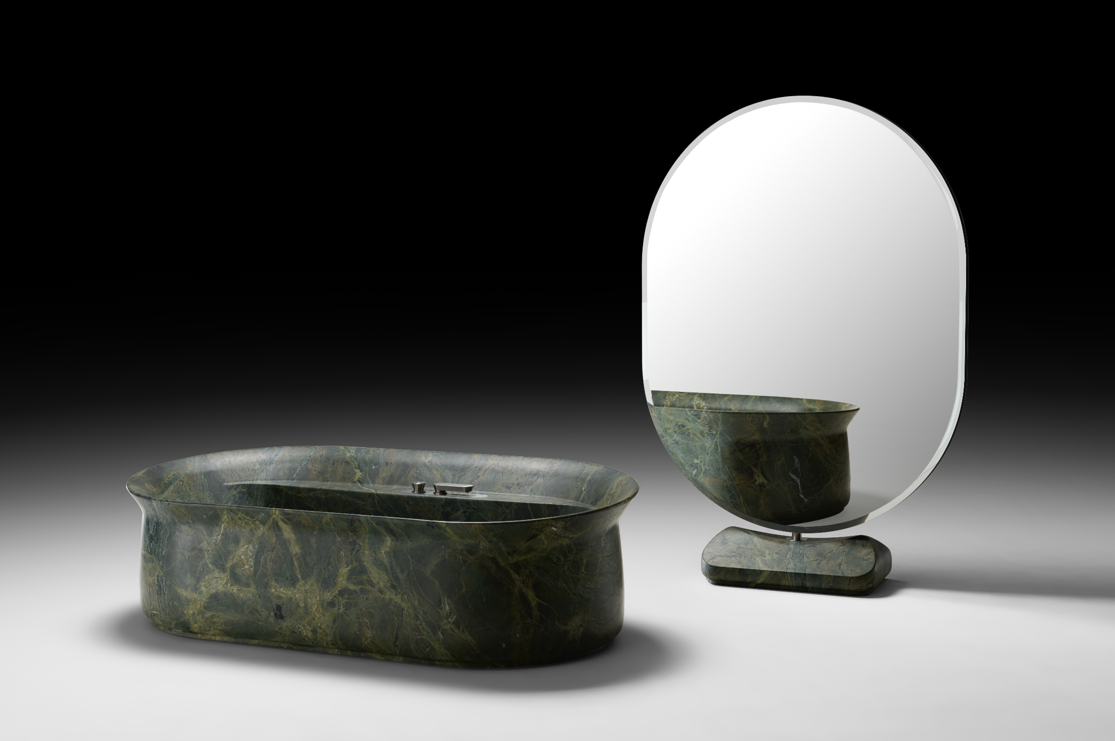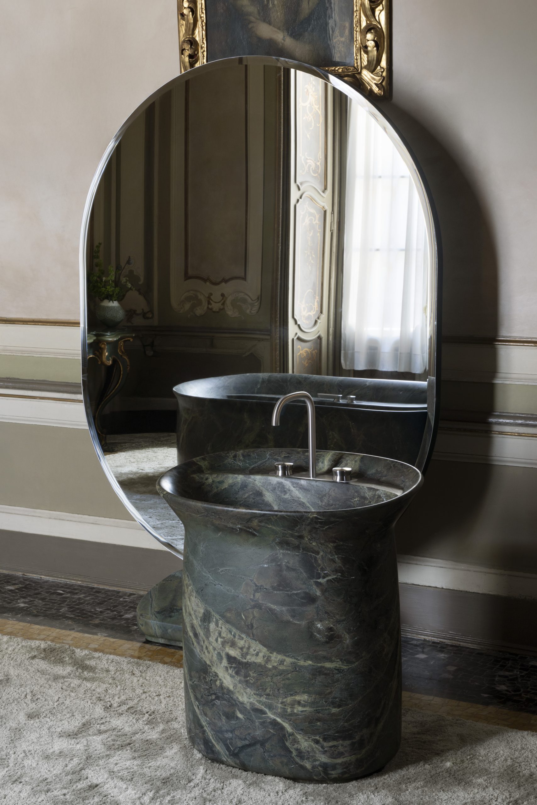 Scolpita con tecnologie d’avanguardia e rifinita a mano, la collezione Majesté rivela superfici morbide e vellutate, dal tatto sorprendente. La vasca introduce una mensola ribassata integrata, pensata per un comfort funzionale e contemporaneo. Il lavabo, ricavato da un unico blocco di pietra, e lo specchio bifacciale con base in pietra e struttura ruotabile completano una visione coerente e sofisticata, in cui ogni dettaglio dialoga con l’altro.