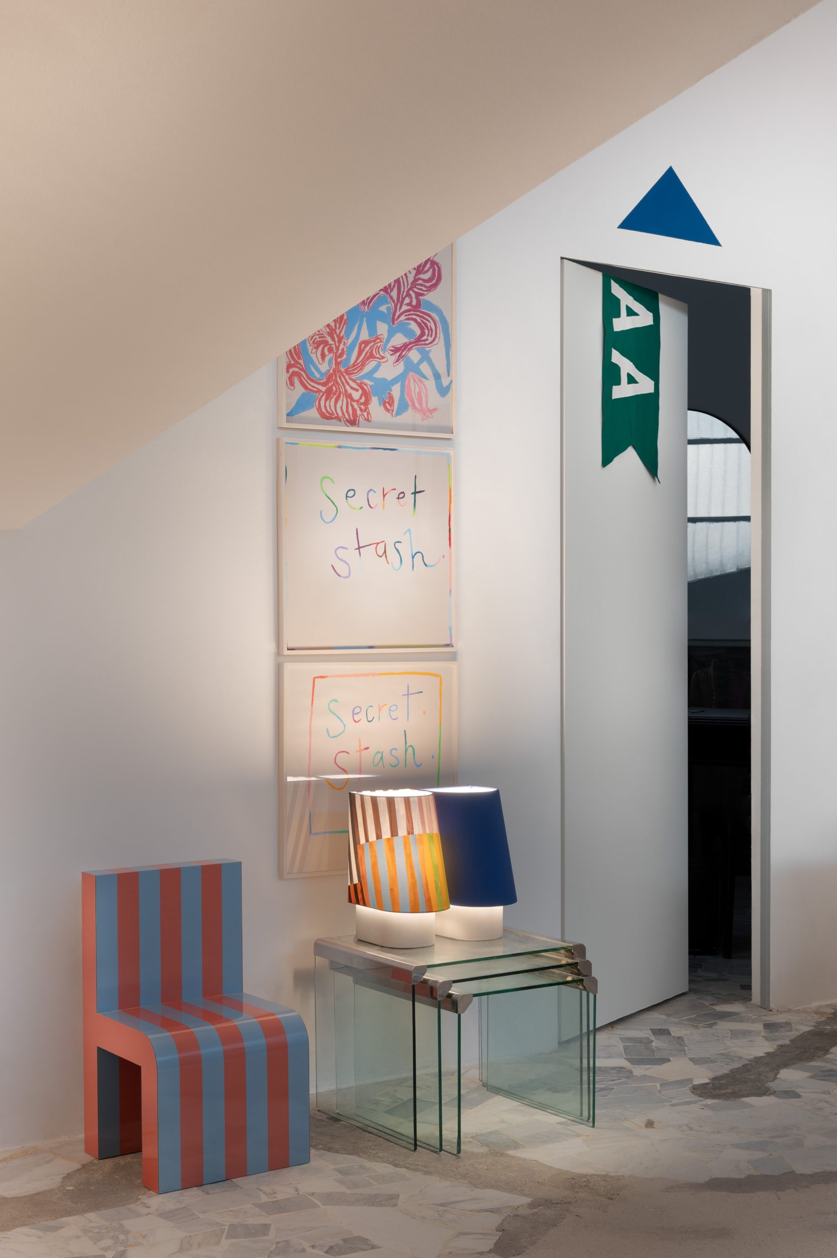 Per la Milano Fashion Week, SERVOMUTO ha inoltre realizzato una serie limitata di Huf con paralume in tessuto Fiftyshades Rubelli, nelle tonalità rosso, verde, nero e blu. I colori primari scelti da Arbesser esaltano le proporzioni della lampada e la trasformano in un oggetto ludico, essenziale e scultoreo, ispirato alla semplicità dei giochi montessoriani.
