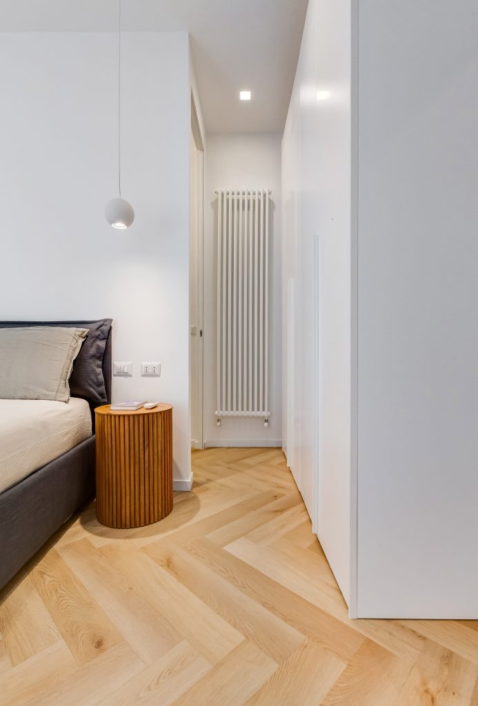 "L’obiettivo era creare uno spazio moderno, funzionale e luminoso per una giovane coppia", racconta Michela Pandolfi. "Abbiamo lavorato su una completa revisione degli interni, dove la scelta dei materiali è stata cruciale per raggiungere comfort e stile desiderati. Il pavimento Clap!3D, posato a spina di pesce italiana e nella finitura Pinna, è stato scelto per donare un effetto armonioso, caldo e accogliente".