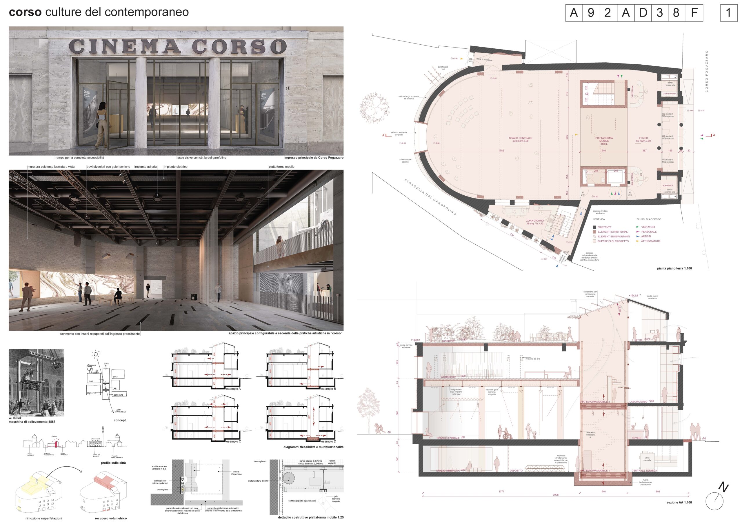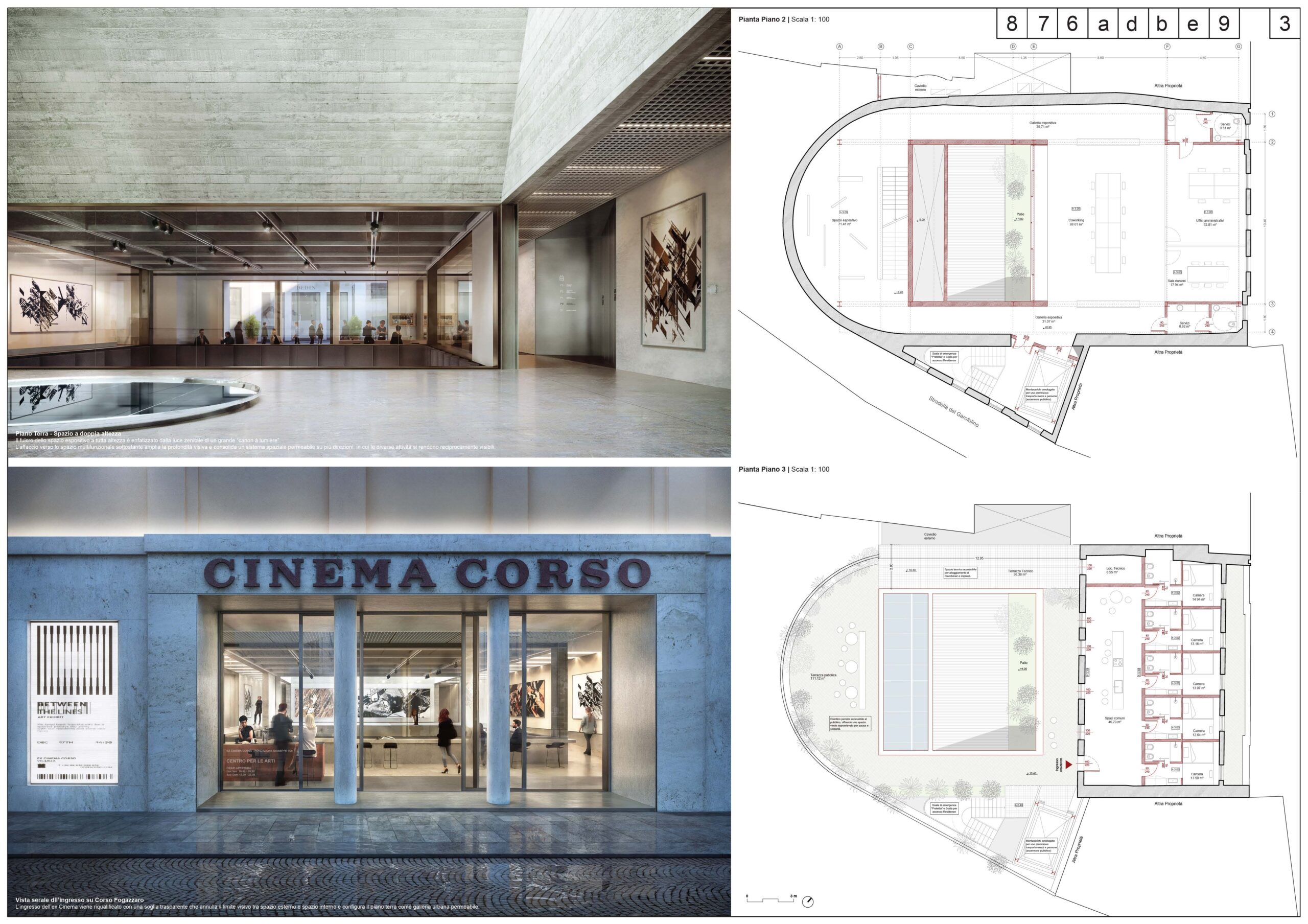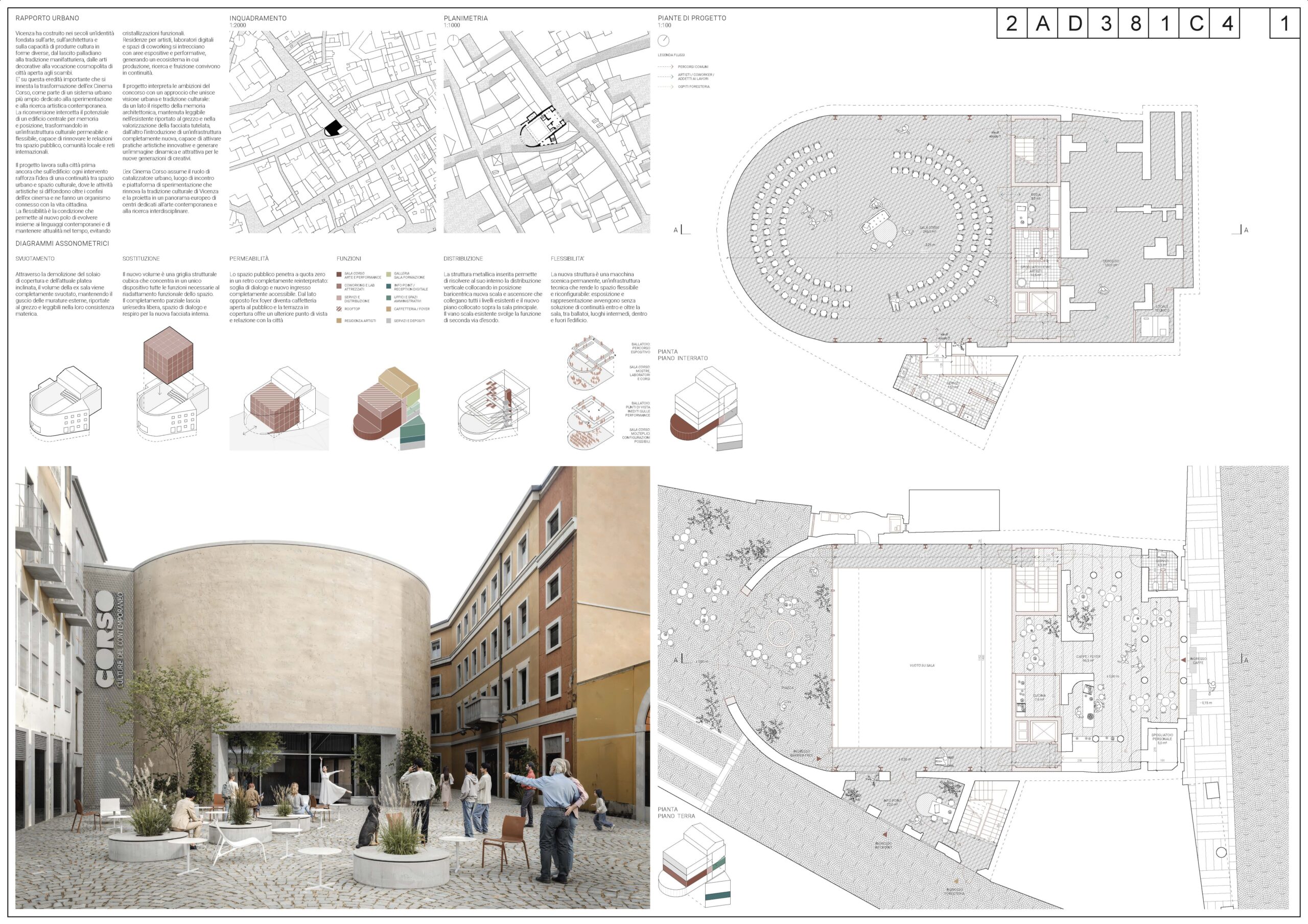 Particolarmente significativa è la ridefinizione del rapporto con la città: l’inversione degli accessi trasforma il retro dell’edificio in una nuova soglia pubblica, valorizzando la piccola piazza come luogo di incontro e restituendo al Corso una dimensione urbana più aperta e inclusiva. Ne emerge uno spazio culturale concepito non come contenitore, ma come ambiente attivo e adattabile, capace di accogliere una pluralità di usi - dalle pratiche espositive e performative alle attività di laboratorio e ricerca - e di evolvere nel tempo insieme alle esigenze della comunità. Il progetto restituisce così all’Ex Cinema Corso una nuova centralità, non solo come edificio recuperato, ma come infrastruttura culturale capace di generare socialità, produzione e nuova vita urbana.