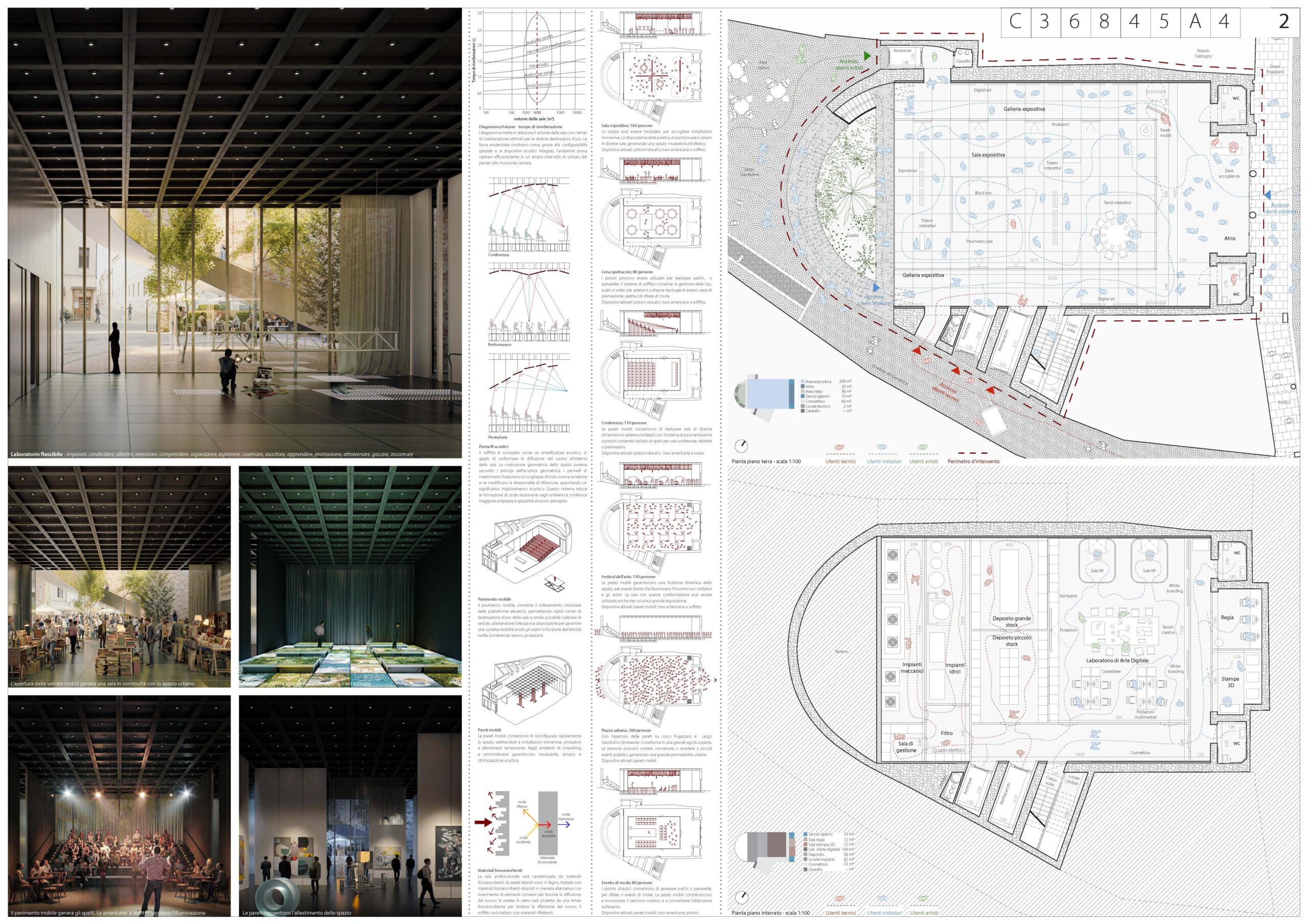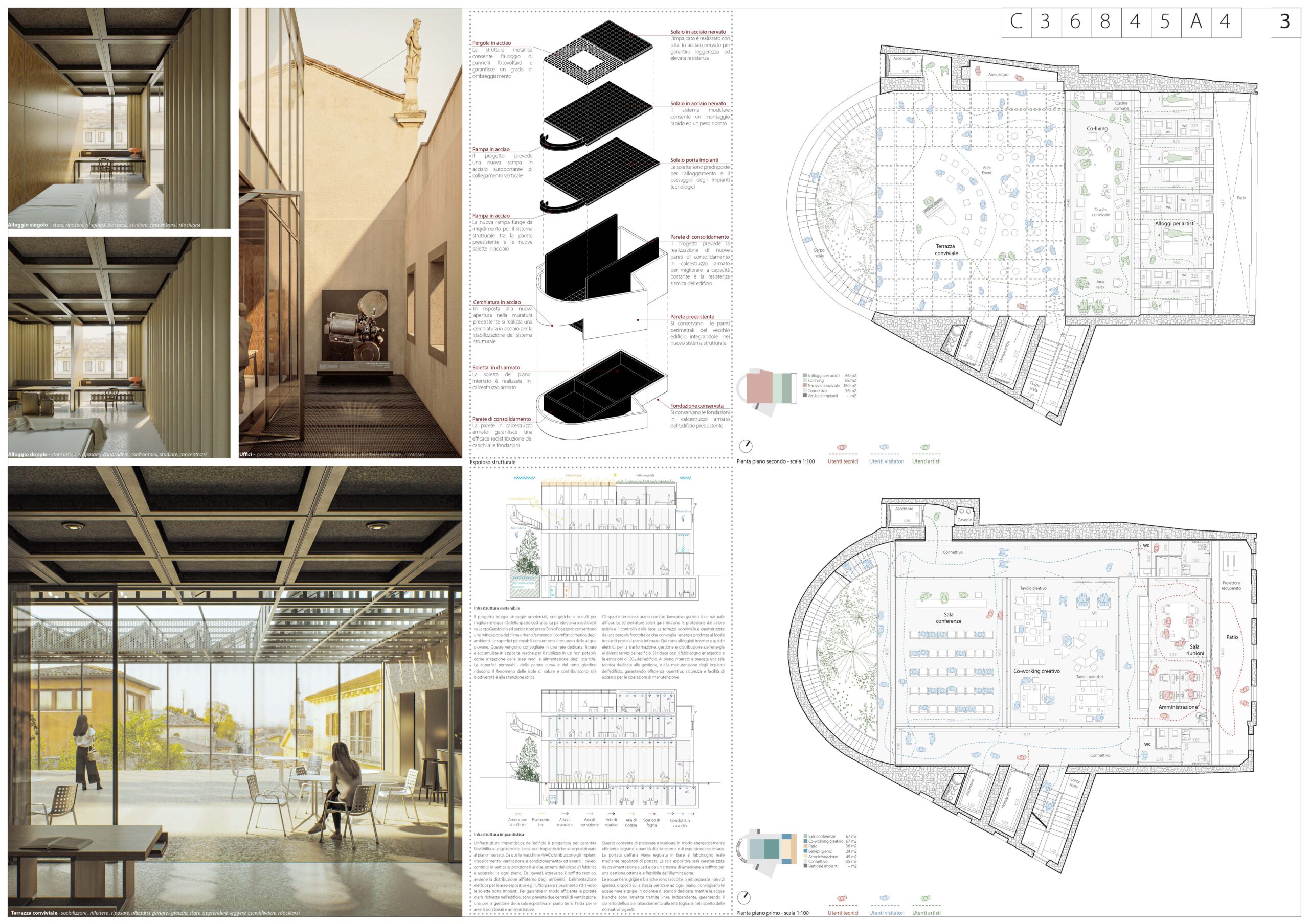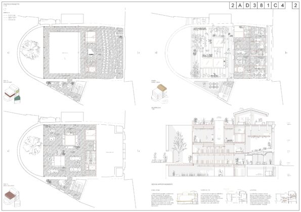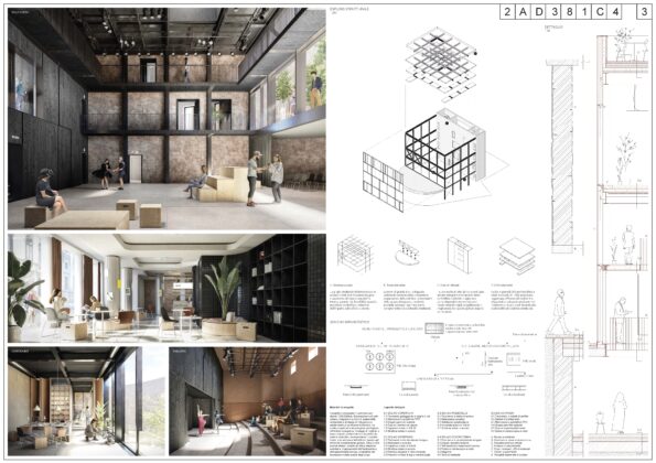 Il team quarto classificato (ex aequo), composto da arch. Federico Bertolo + arch. Tommaso Bisogno + Buromilan ha proposto una rilettura più architettonica e formale dello spazio, lavorando sulla chiarezza distributiva e sulla definizione di un sistema ordinato di relazioni tra le diverse funzioni, con una particolare sensibilità per il rapporto tra struttura esistente e nuovi interventi.