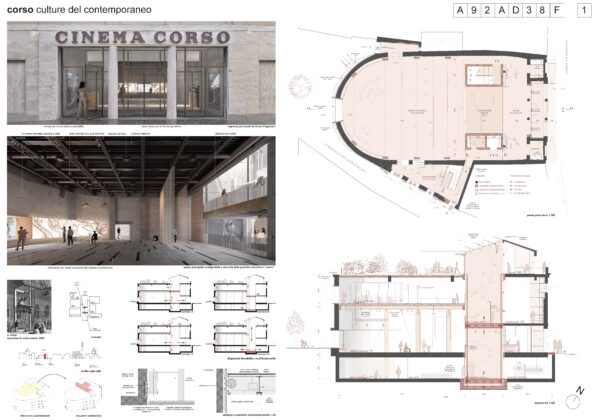 Il progetto vincitore, sviluppato dal raggruppamento temporaneo guidato da ALTRALINEA + SPARCH, interpreta la trasformazione dell’ex Cinema Corso come un intervento capace di agire contemporaneamente sullo spazio architettonico e sul tessuto urbano. L’edificio non viene semplicemente riqualificato, ma ripensato come un dispositivo permeabile, aperto alla città e in grado di generare nuove forme di relazione tra spazio pubblico e attività culturali. L’intervento si fonda su un principio di equilibrio tra conservazione e trasformazione: l’involucro storico viene integralmente preservato, mentre all’interno si introduce una nuova struttura indipendente che consente di liberare il volume originario e riconfigurarlo come uno spazio continuo, flessibile e a tripla altezza. Al centro del progetto, la riattivazione dell’apertura in copertura - reinterpretata attraverso un sistema che convoglia la luce naturale in profondità - definisce un nuovo cuore architettonico, capace di organizzare gli ambienti e di qualificare l’esperienza dello spazio.