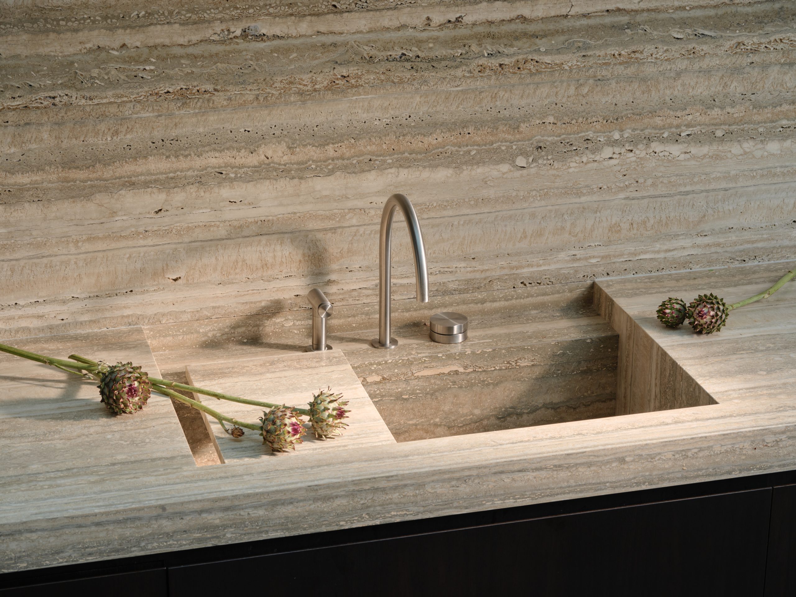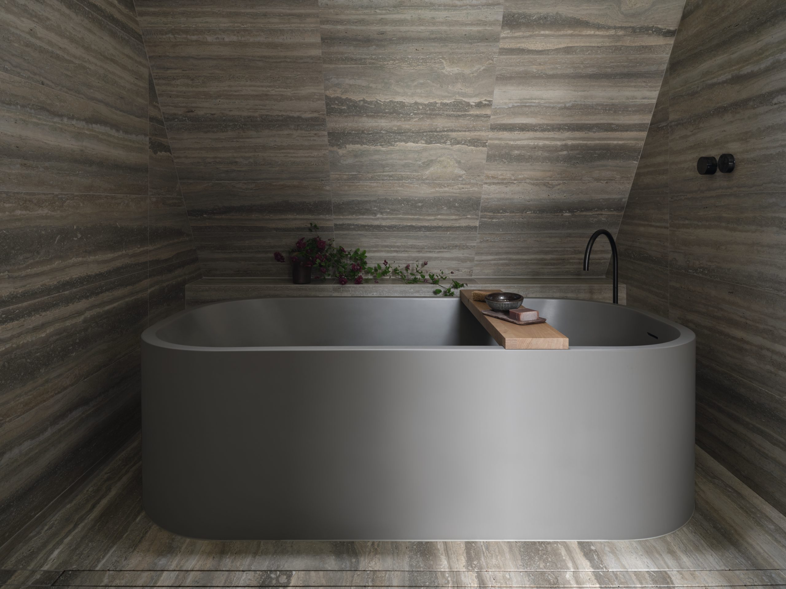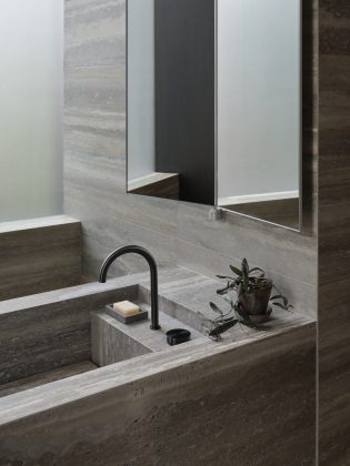 Il travertino, ripreso anche per i rivestimenti e gli arredi della zona bagno, si completa con i toni sofisticati della rubinetteria CEA in finitura Black Diamond satinata. Batay-Csorba Architects, con Westminster Residence, percorre la linea di confine tra sensibilità contestuale e stridente contemporaneità attraverso masse artistiche e dettagli ben concepiti.